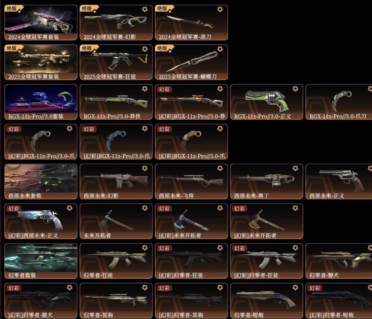 【拥有套装】离子武器//2.0套装(离子武器//2.0-狂徒,离子武器//2.0-战神,离子武器//2.0-骇灵,离子武器//2.0-狂怒,离子武器//2.0-爪刀)西部未来套装(西部未来-幻影,西部未来-奥丁,西部未来-飞将,西部未来-正义,未来开拓者)2025全球冠军赛套装(2025全球冠军赛-狂徒,2025全球冠军赛-蝴蝶刀