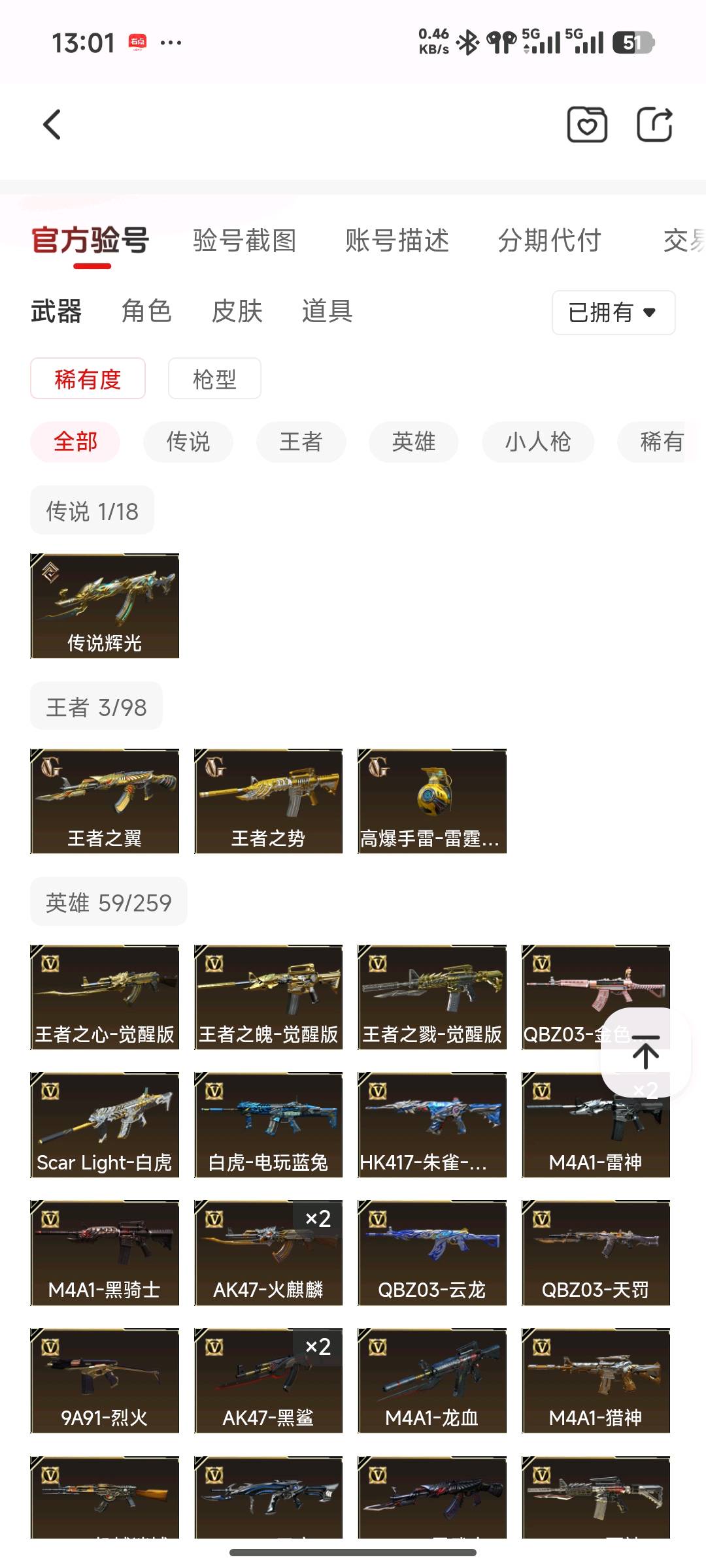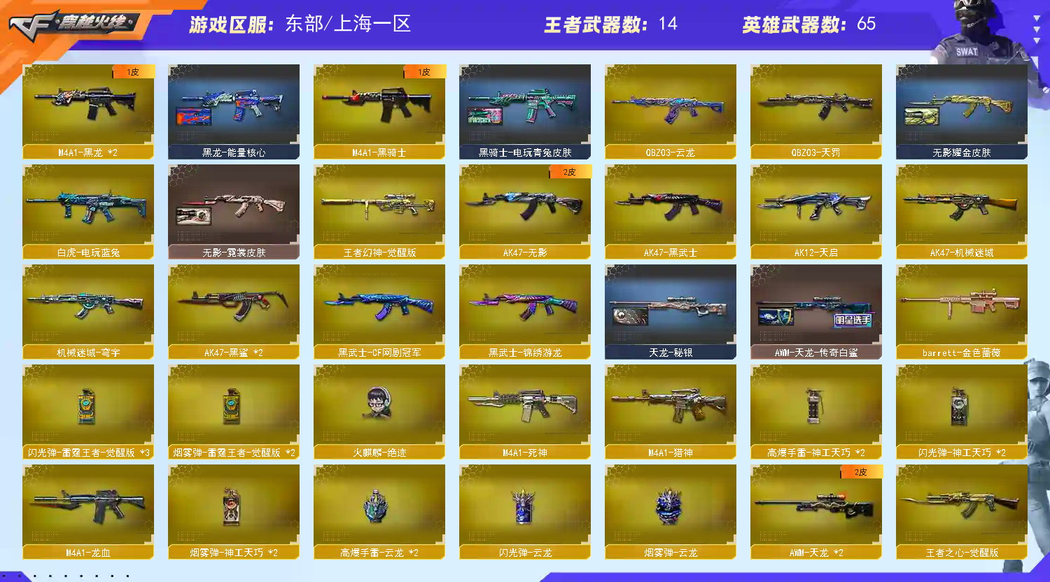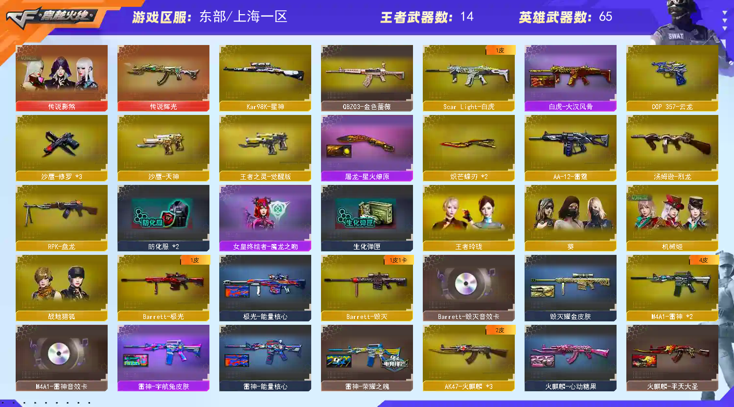 【4防传说影煞+传说辉光+幻神+星 神+白虎粉兔+QBZ蔷薇+雷神荣耀+COP云龙+2 炽芒蝶刃】【Lv.102 荣耀元帅】81V,4王者,7 炫金,传说辉光/毁灭耀金/极光能量核心/天龙传 奇白鲨/天龙秘银/火麒麟CFSTAR/火麒麟AG/火 麒麟平天大圣/火麒麟心动糖果/无影霓裳/无影耀 金/传说影煞 葵/机械姬/战地猎狐/幻面灵狐/王 者幻神-觉醒版/Barrett-毁灭/Barrett-极光/bar rett-金色蔷薇/Kar98K-星神/网剧冠军套装/云 龙套装/QBZ03-天罚音效卡/M4A1-雷神音效卡/ Barrett-毁灭音效卡;炽芒蝶刃,传说影煞,RPK-盘龙,QBZ03-金色蔷薇,Scar Light-白虎,Kar98K-星神,