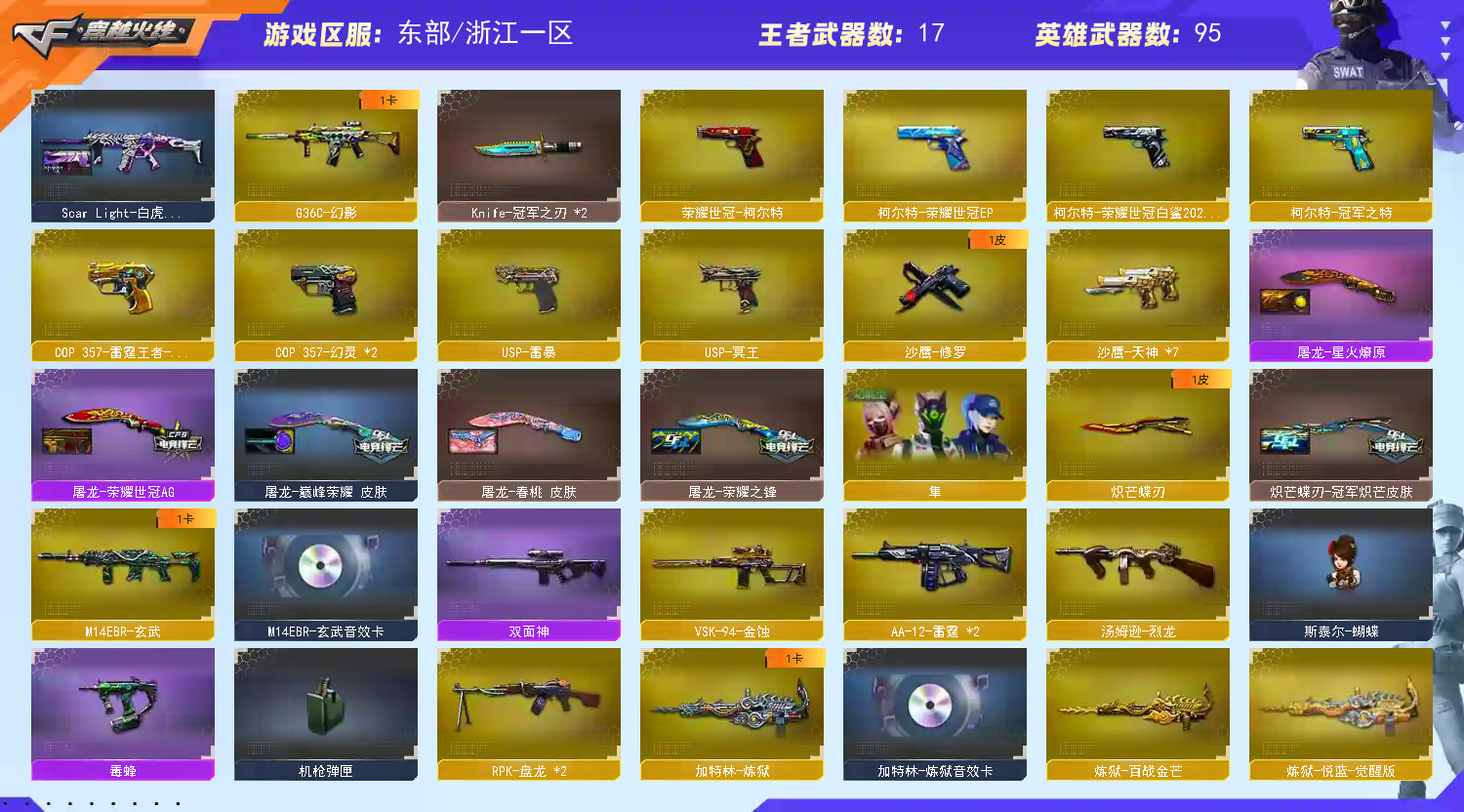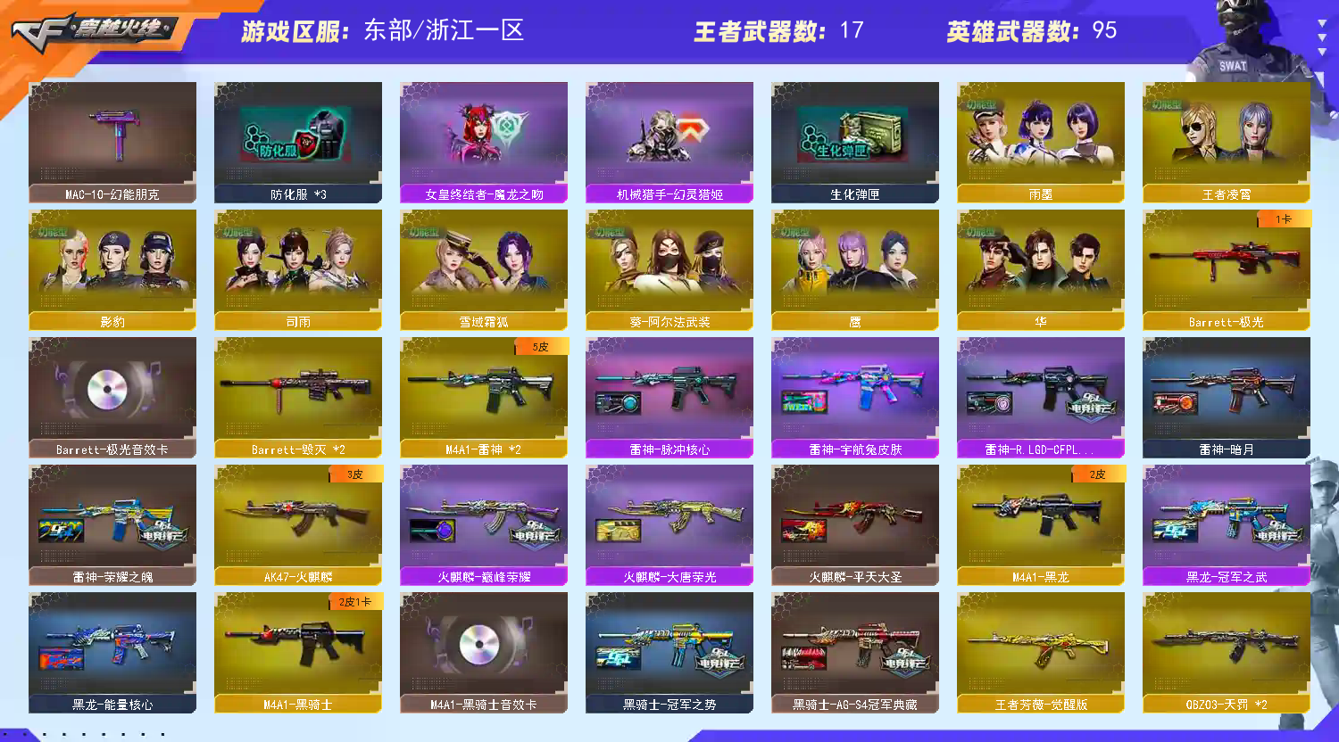 【商品标题】:东部浙江一区-106V-可二次实名-【Lv.100.1-大元帅】-【段位:枪王1】 【稀有武器】:传说破晓/M200-幻神(2)/Kar98K-星神/VSK-94-金蚀/G36C-幻影/ScarLight-白虎/M14EBR-玄武/M4A1-青龙/QBZ03-天罚(2)/M4A1-幻灵/AK47-雷暴/USP-雷暴/COP357-幻灵(2)/柯尔特-荣耀世冠白鲨2023/修罗-古蛇迷踪/荣耀世冠-柯尔特/COP357-雷霆王者-觉醒版/柯尔特-冠军之特/金色蔷薇-古蛇迷踪/QBZ03-金色蔷薇/AK47-火麒麟/M4A1-黑龙/M4A1-雷神(2)/M4A1-黑骑士/荣耀世冠-火麒麟/Barrett-毁灭(2)/Barrett-极光/AWM-裁决/RPK-盘龙(2)/加特林-炼狱/汤姆逊-烈龙/AA-12-雷霆(2)/炽芒蝶刃/斩神刀-雷暴/幻灵之锋(3)/唐刀-神工天巧/云龙扇 【王者武器】:M4A1-雷霆王者-觉醒版/王者芳薇-觉醒版/王者之怒-觉醒版/王者凰鸣-觉醒版/王者星霆 【热门角色】:传说艾莉莎/华/司雨/鹰/影豹/雨墨/隼/奇洋探员/蛇隐宗/王者凌霄/炽天使/空/灵狐者-职业经理/潘多拉-X/兔囡囡 【热门音效卡】:M200-幻神音效卡/Kar98K-星神音效卡/AWM-裁决音效卡/QBZ03-金色蔷薇音效卡/加特林-炼狱音效卡/QBZ03-天罚音效卡/M4A1-黑骑士音效卡/Barrett-极光音效卡 【热门皮肤】:幻神-AG-CFPLS24冠军皮肤/M200-幻神-N9-2022MVP/幻神-宠儿-2021MVP/幻神-星火小队签名臻藏版皮肤/幻神-冠军之幻/幻神-CFS2022/幻神-电流骇客皮肤/幻神-纸灯龙皮肤/裁决-巅峰荣耀皮肤/白虎-热带奇洋皮肤/金色蔷薇-热带奇洋皮肤/屠龙-星火燎原/QBZ03-巅峰荣耀皮肤/Kar98K-星神-冠军之星皮肤/雷神-R.LGD-CFPLS18冠军/屠龙-荣耀世冠AG/擎天-冠军之击/火麒麟-巅峰荣耀/QBZ03-冠军之薇/白虎-霓虹机甲 皮肤/炼狱-电子连击皮肤/白虎-AG-CFPLS20冠军/黑龙-冠军之武/火麒麟-大唐荣光/屠龙-巅峰荣耀皮肤/ScarLight-白虎-暗星/黑骑士-AG-S4冠军典藏/屠龙-荣耀之锋/金色蔷薇-枪娘阿敏皮肤/屠龙-春桃皮肤/炽芒蝶刃-冠军炽芒皮肤/雷神-荣耀之魄 【其他亮点】:斯泰尔-蝴蝶/Knife-冠军之刃(2)/白虎-九尾白狐/MK5-炽火炎龙/毒蜂/Scar Light-马枪/贝雷塔687-射手座/黄金猫猫手套-白鲨/烟雾弹-荣耀世冠白鲨2023/哔哩哔哩名片/哔哩哔哩名片 (截图展示段位不代表实际段位,如赛季更新等不可抗拒因素发生变化,其余道具看截图或咨询客服);USP-雷暴,荣耀世冠-柯尔特,柯尔特-荣耀世冠白鲨2023,柯尔特-冠军之特,炽芒蝶刃,Knife-冠军之刃,隼,