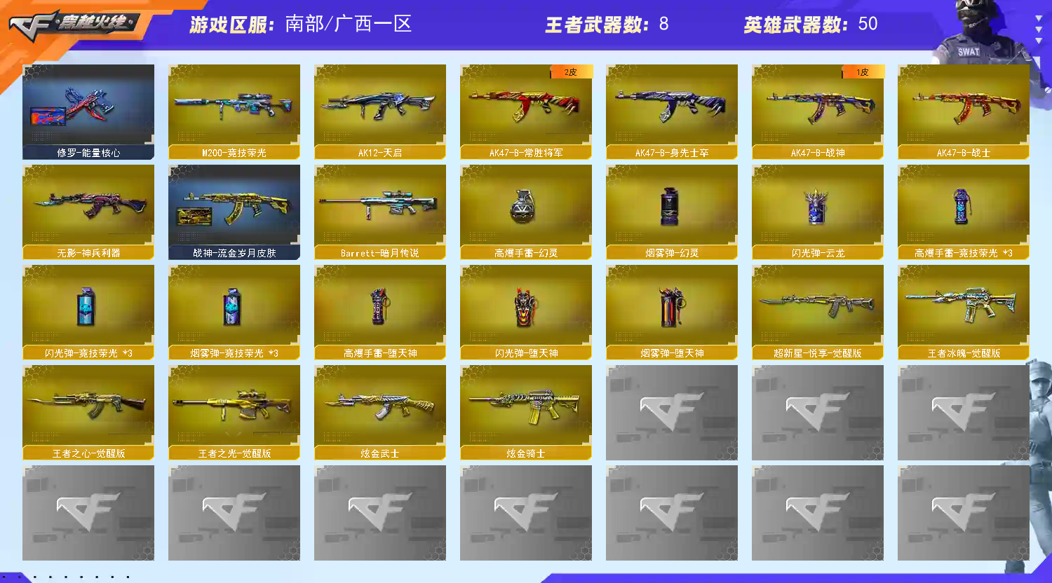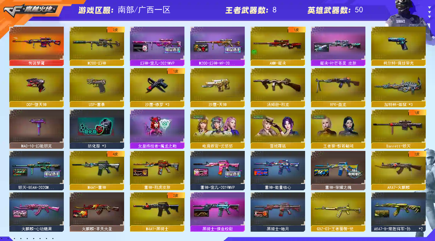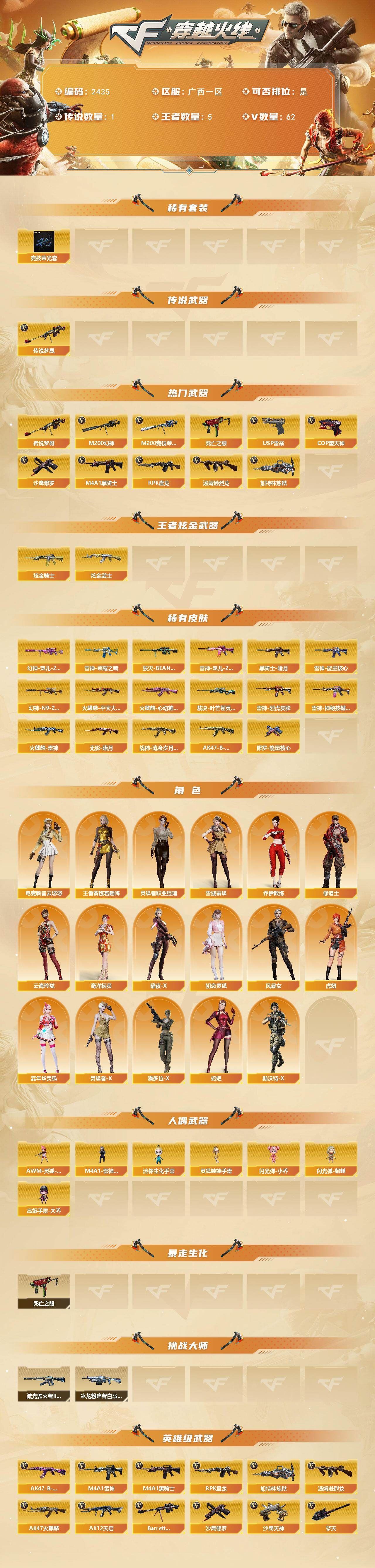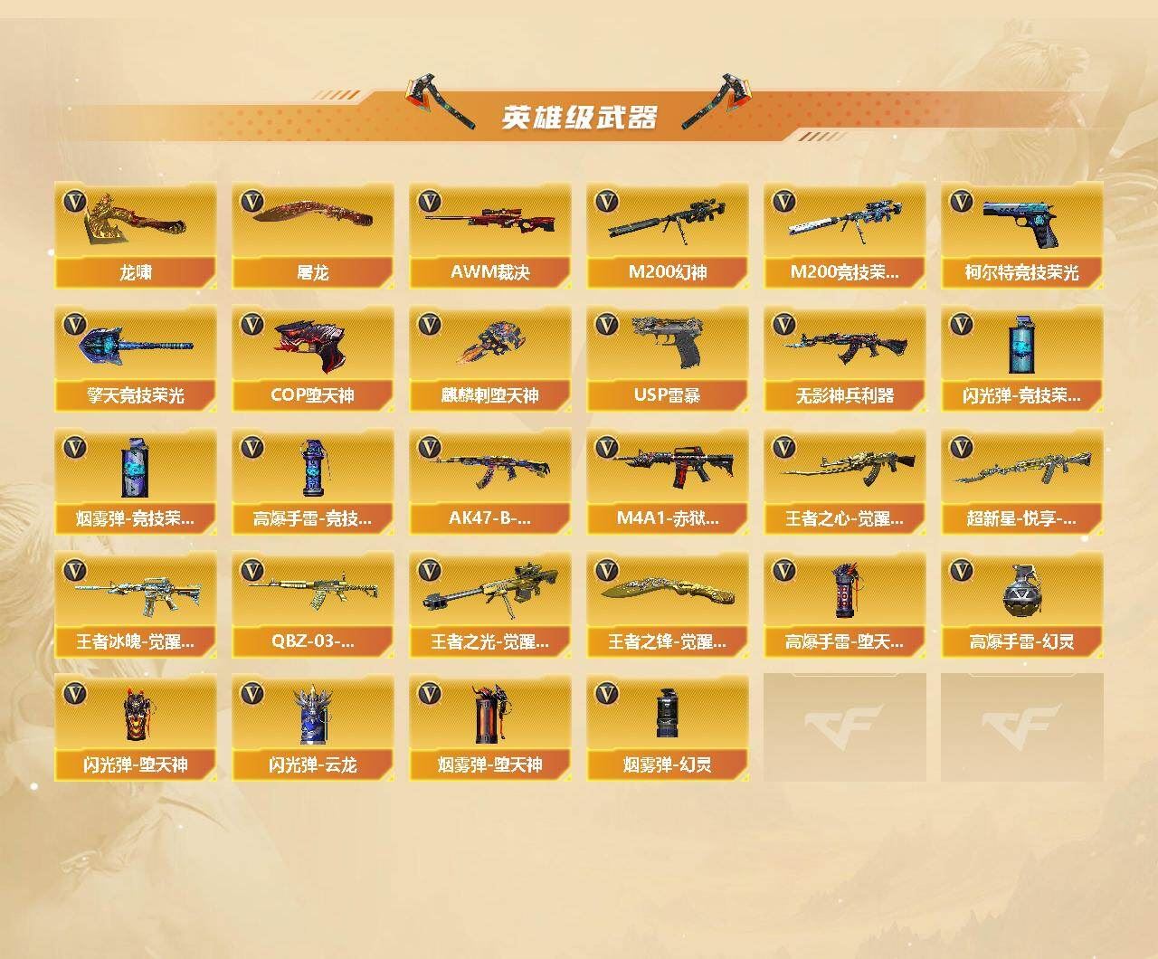 【传说武器】:传说梦魇【热门武器】:传说梦魇,M200-幻神,M200-竞技荣光,死亡之眼*2,M4A1-黑骑士,汤姆逊-烈龙,RPK-盘龙,加特林-炼狱*3,USP-雷暴,COP-堕天神,沙鹰-修罗*3【稀有套装】:竞技荣光套【王者炫金武器】:炫金骑士,炫金武士【皮肤】:幻神-宠儿-2021MVP,M200-幻神-N9-2022MVP,裁决-叶芒苍灵 皮肤,雷神-能量核心,雷神-荣耀之魄,雷神-宠儿-2019MVP,雷神-烈虎皮肤,雷神-神秘按键 皮肤,火麒麟-雷神,火麒麟-平天大圣,火麒麟-心动糖果,毁灭-BEAN-2020MVP,黑骑士-暗月,无影-暗月,战神-流金岁月皮肤,AK47-B-常胜将军-孙权*2,修罗-能量核心【角色】:电竞教官-云悠悠,王者葵-惊若翩鸿,雪域霜狐,奇洋探员,乔伊教练,修道士,云海玲珑,暗夜-X,初恋灵狐,风暴女,虎妞,嘉年华灵狐,灵狐者-X,灵狐者-职业经理,潘多拉-X,蛇姬,斯沃特-X【人偶武器】:M4A1-雷神-精英刀锋,AWM-灵狐-15周年嘉年华,迷你生化手雷,闪光弹-小乔,闪光弹-貂蝉,高爆手雷-大乔,灵狐娃娃手雷【暴走生化】:死亡之眼*2【挑战大师】:冰龙粉碎者-白马银枪,激光毁灭者III-白马银枪*2【英雄级武器】:AK47-火麒麟,M4A1-雷神,M4A1-黑骑士,AK12-天启,无影-神兵利器,王者之心-觉醒版,超新星-悦享-觉醒版,AK47-B-战神,王者冰魄-觉醒版,AK47-B-常胜将军,QBZ-03-王者蔷薇-觉醒版,Barrett-毁灭,AWM-裁决,M200-幻神,M200-竞技荣光,王者之光-觉醒版,RPK-盘龙,加特林-炼狱*3,汤姆逊-烈龙,沙鹰-修罗*3,沙鹰-天神,USP-雷暴,COP-堕天神,柯尔特-竞技荣光,屠龙,龙啸,麒麟刺-堕天神,擎天*3,擎天-竞技荣光,王者之锋-觉醒版,高爆手雷-堕天神,高爆手雷-幻灵,高爆手雷-竞技荣光*3,闪光弹-堕天神,闪光弹-竞技荣光*3,闪光弹-云龙,烟雾弹-堕天神,烟雾弹-幻灵,烟雾弹-竞技荣光*3,M4A1-赤狱骑士【道具】:全能枪王背包,战舰背包,超级背包,女皇终结者-魔龙之吻,救世主-黑桃战神,黄金生化钩,绿色巨人,灵魂忍者*2,变异宝贝,迷雾幽灵,夺命之镰,防化服*3,金色流光-枪王排位*2,星辰流光-枪王排位,枪王排位28赛季金色流光,枪王排位29赛季金色流光,动感闪耀表情,C4-再燃火线,防弹头盔*5,防弹衣*5,C4工具钳*5,手雷包*5,;USP-雷暴,电竞教官-云悠悠,RPK-盘龙,M200-幻神,