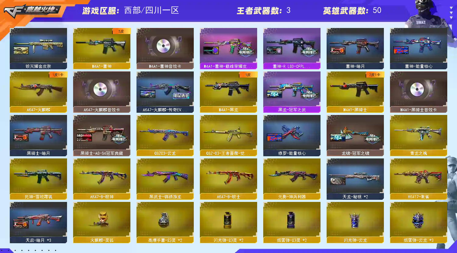 【m200幻神三件套!!!】【qbz03金色蔷薇三件套!!!】【m200幻神+m200幻神音效卡+n92022mvp皮肤+冠军之幻皮肤+agcfpls24冠军皮肤+柯尔特冠军之特+炽芒蝶刃】【98k星神】【白虎】【qbz03金色蔷薇+qbz03金色蔷薇音效卡+破浪逐光皮肤+qbz03王者蔷薇】【毁灭+毁灭音效卡+agcfpls15冠军皮肤】【雷神+雷神音效卡+巅峰荣耀皮肤】【火麒麟+火麒麟音效卡+传奇even皮肤】【朱雀+朱雀音效卡】【黑骑士+黑骑士音效卡+ags4冠军典藏皮肤】【黑龙+冠军之武皮肤】【无影神兵利器 qbz03云龙 黑武士锦绣游龙 金色蔷薇古蛇迷踪 死神雪域霜狐 战士 战神 青龙之魄 填了 裁决 炼狱 雷霆】——【柯尔特冠军之特 沙鹰修罗 cop357雷霆 cop357幻灵 修罗古蛇迷踪】——【屠龙 龙啸 擎天 麒麟刺 幻灵之锋 擎天竞技荣光 龙啸烈火龙威】——【幻灵投掷套装*2】【竞技荣光投掷套装】——【热门武器/小人枪】【hk417朱雀蛇隐宗 火麒麟灵狐 毁灭孙三炮 mk5炽火炎龙 kac锯式机枪黑桃战神 cat 金色小号 牛牛ak47 awm灵狐15周年嘉年华】——【角色】【4防王者春 4防王者影豹】【电竞教官云悠悠 关小雨 魅影 战地猎狐 乔伊教练 蛇隐宗 修道士 雪域霜狐】;柯尔特-冠军之特,炽芒蝶刃,电竞教官-云悠悠,QBZ03-金色蔷薇,M200-幻神,Scar Light-白虎,Kar98K-星神,