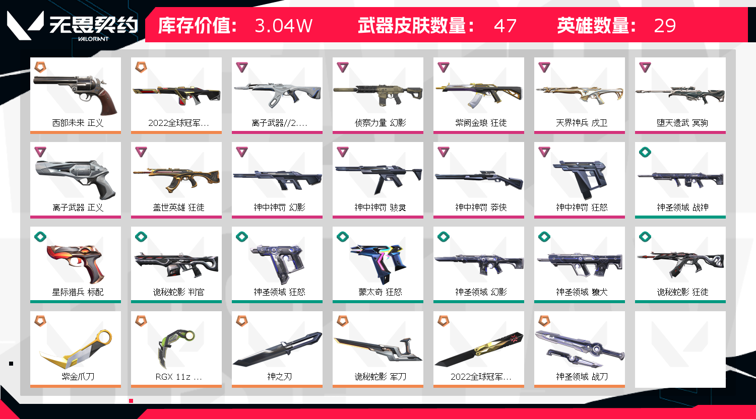 允许 英雄25 武器皮肤数量47;紫金爪刀,侦察力量 幻影,紫阙金琅 狂徒,天界神兵 戍卫,离子武器//2.0 狂徒,堕天遗武 冥驹,西部未来 正义,