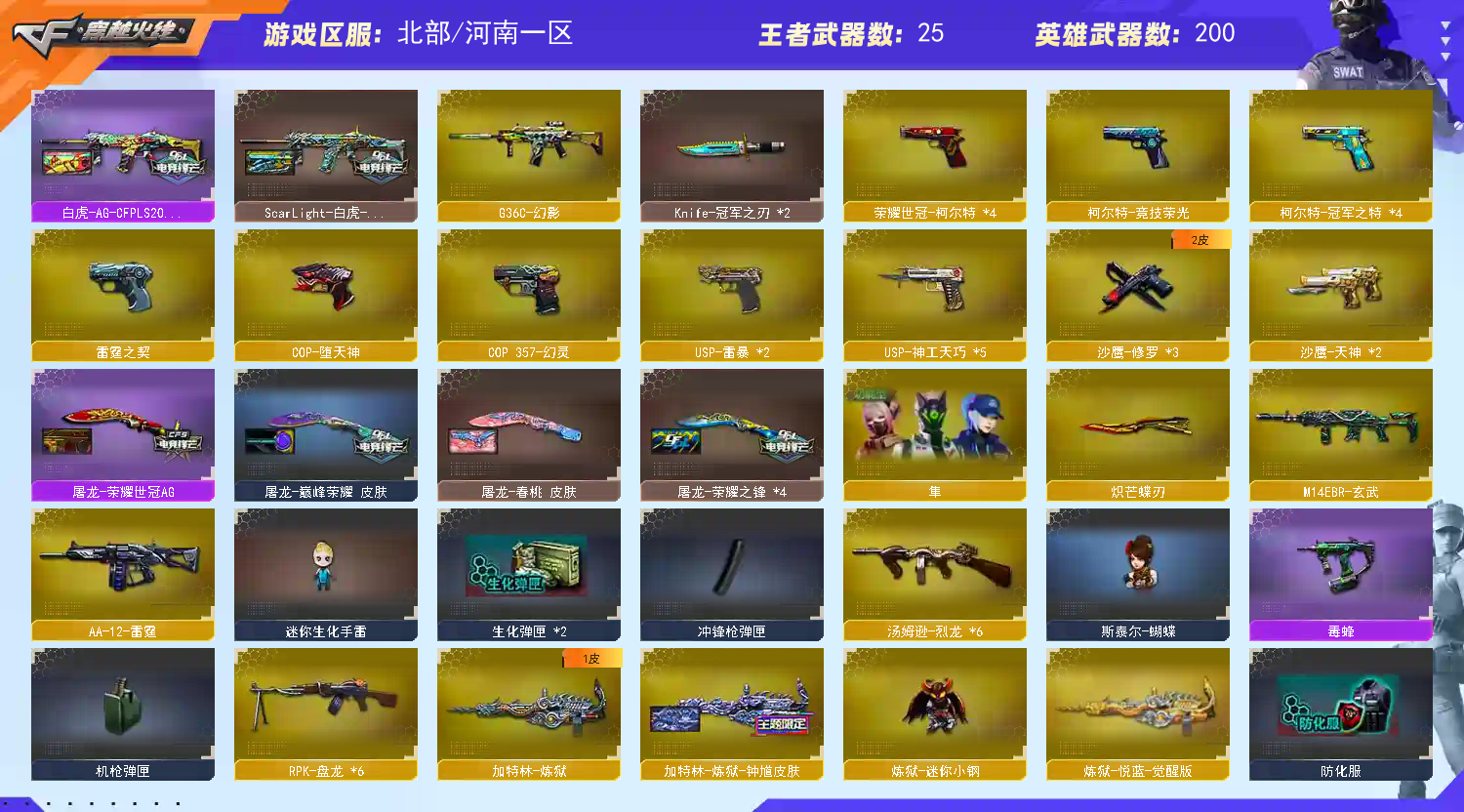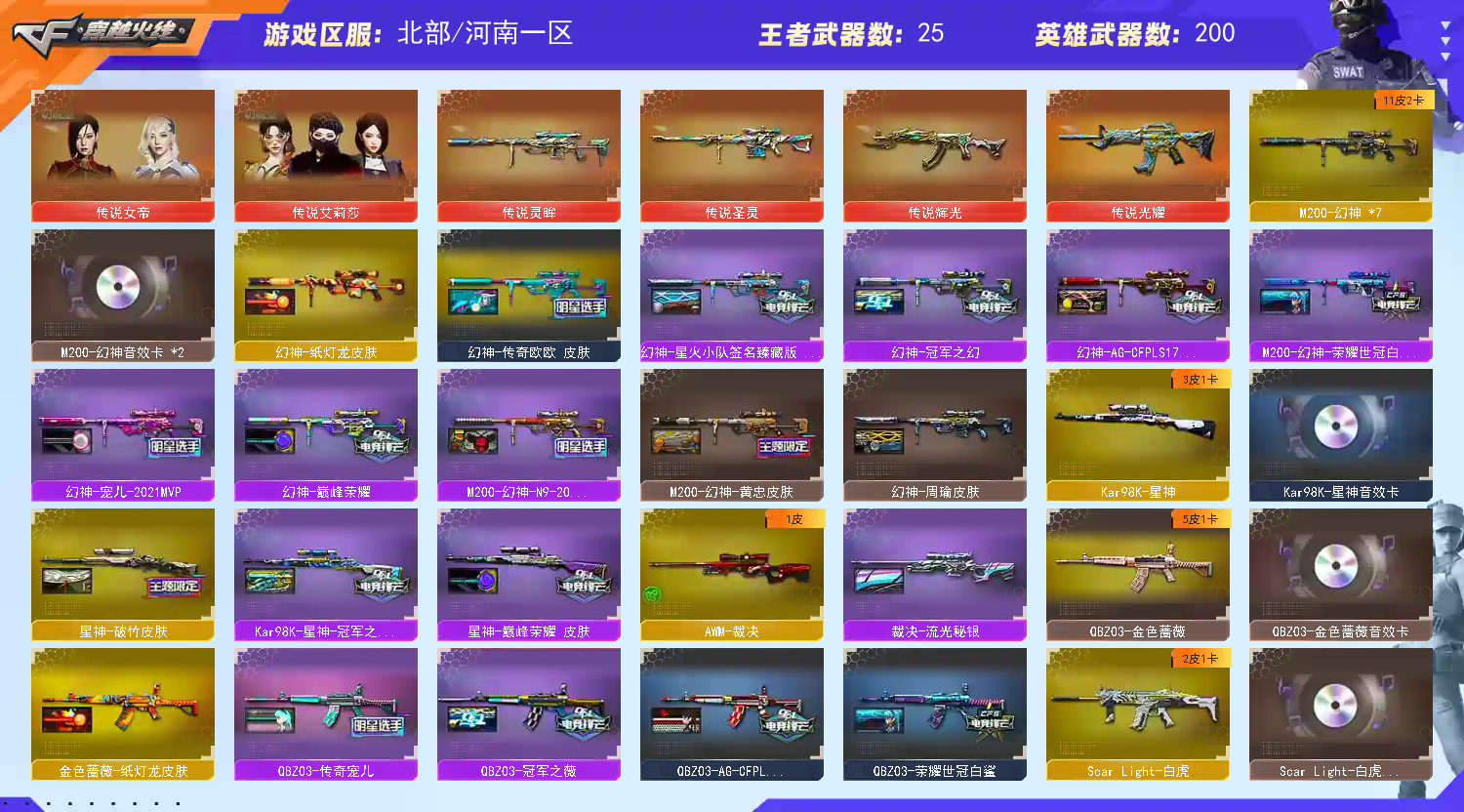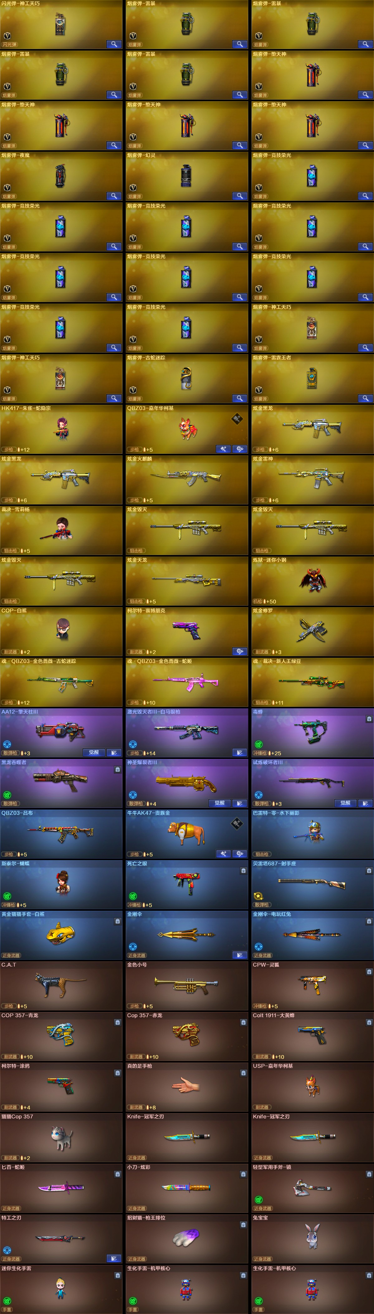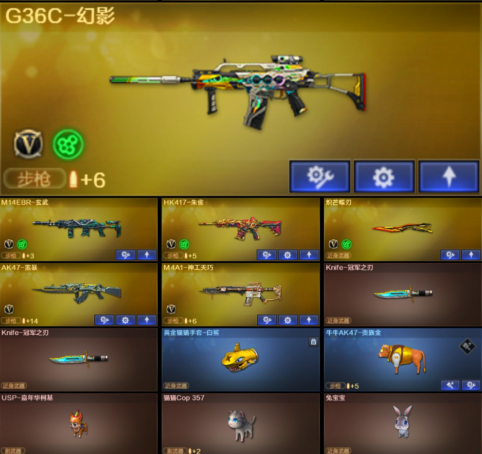 -传说女帝艾莉莎/传说灵眸/满配20把副手/7幻神11皮带卡/星神三件套/裁决流光G36幻影/6盘7烈炽芒蝶刃;USP-雷暴,荣耀世冠-柯尔特,柯尔特-冠军之特,炽芒蝶刃,Knife-冠军之刃,传说女帝,隼,