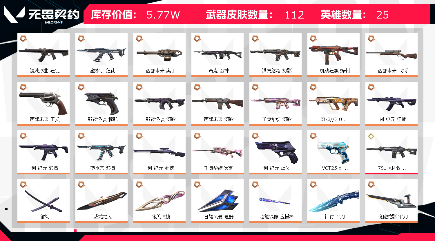 首页 > 租号大厅 > 无畏契约-wegame > wegame/wegame > ⚡️创纪元套⚡️西部未来套⚡️塑水宗ak⚡️混沌ak⚡️莲花m4⚡️流脓m4⚡️威龙之刃⚡️落樱飞旋