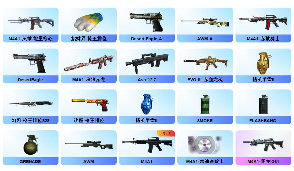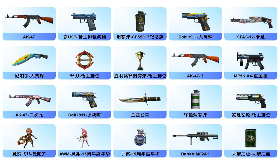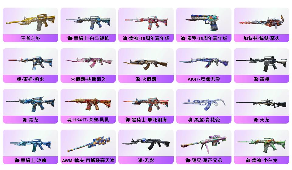 【幻神+幻神ag冠军+幻神音效卡】【usp神工天巧+cop幻灵】【星神】【王者春+职业选手】【觉醒qbz王者蔷薇】【qbz金色蔷薇】【火麒麟横秒之巅+毁灭sv冠军】【毁灭音效卡+雷神音效卡】雷神/火麒麟/黑鲨/毁灭/裁决【烈龙】【觉醒王者之锋】