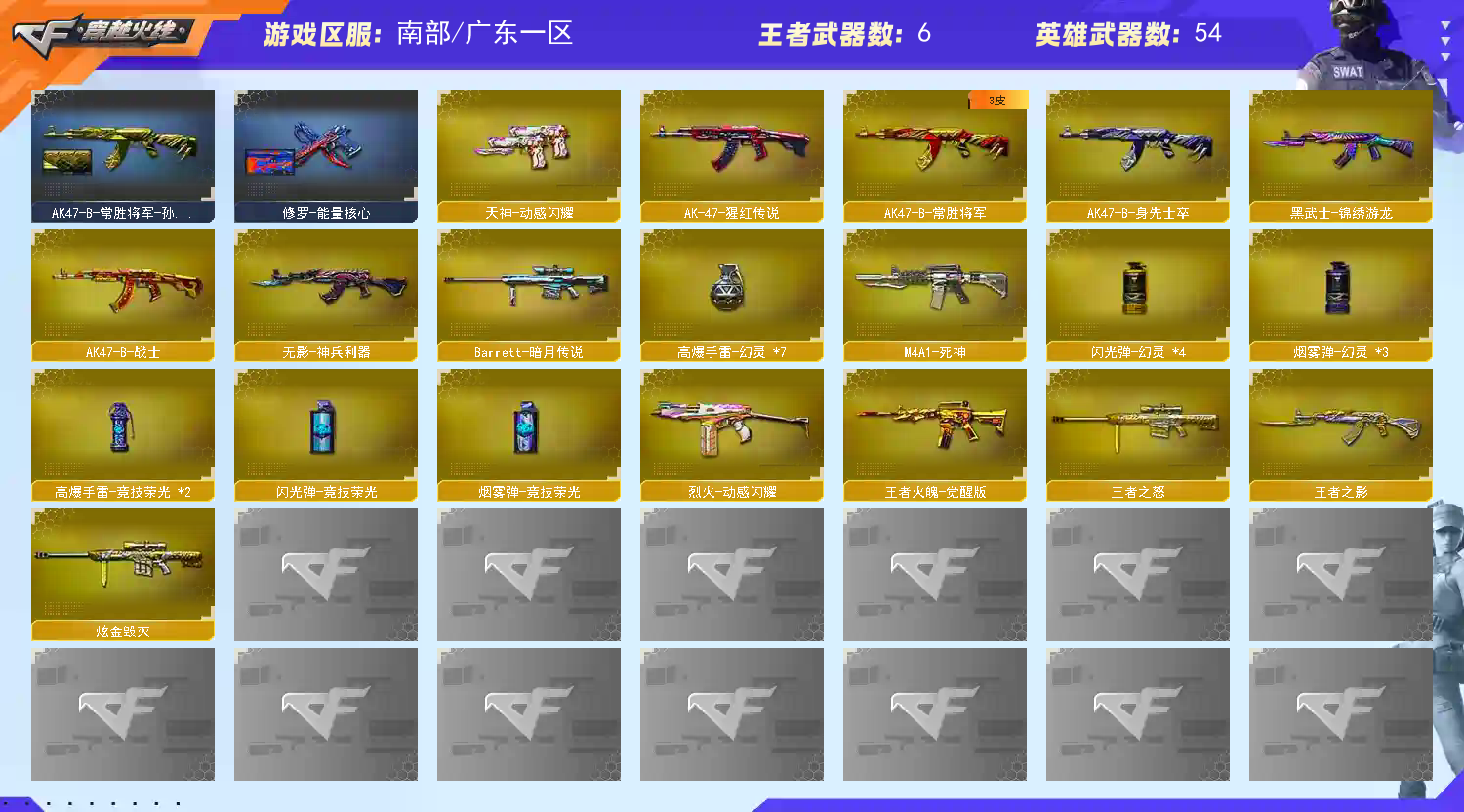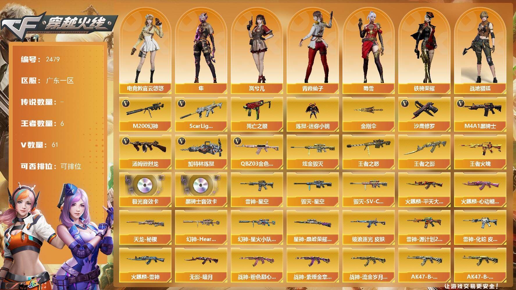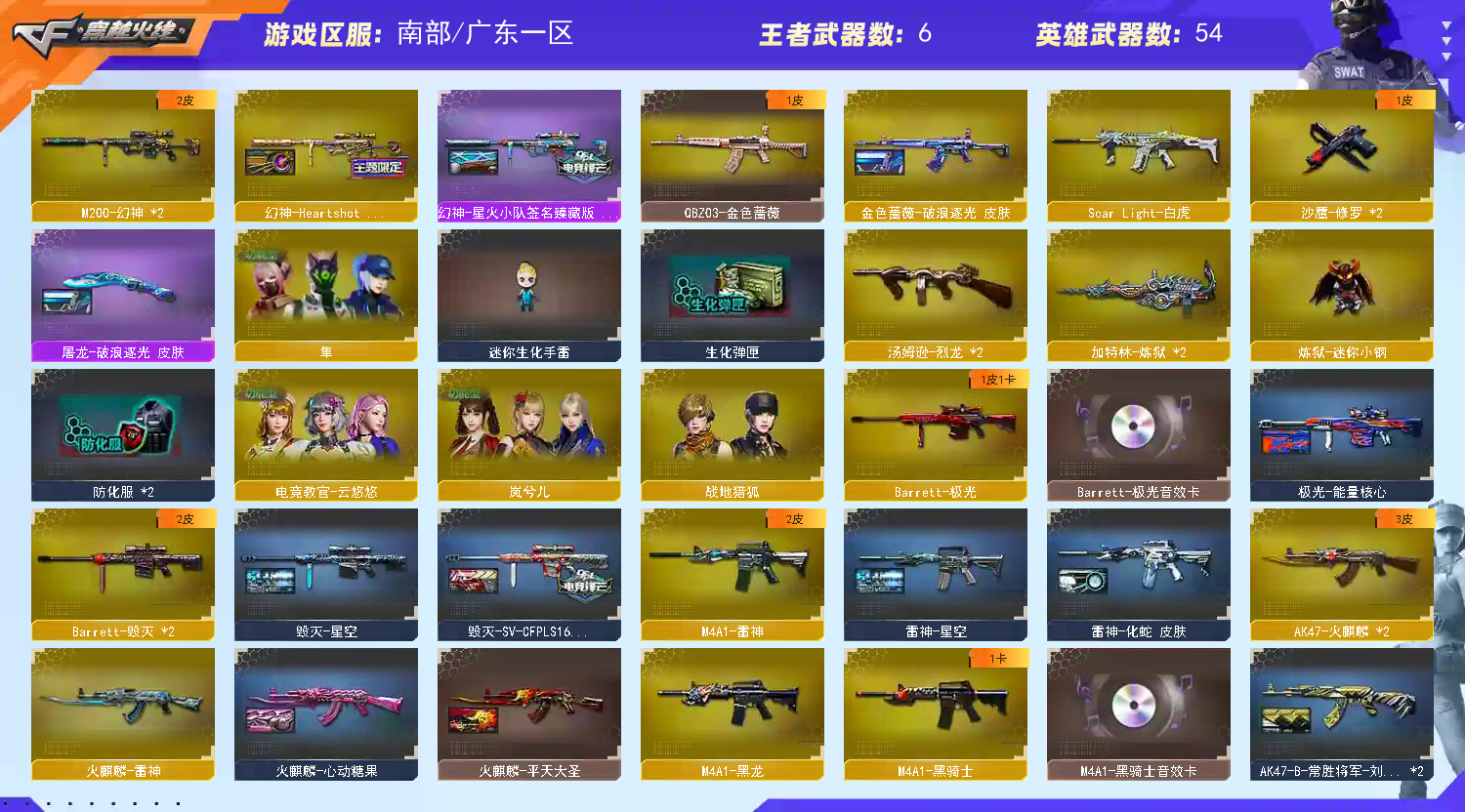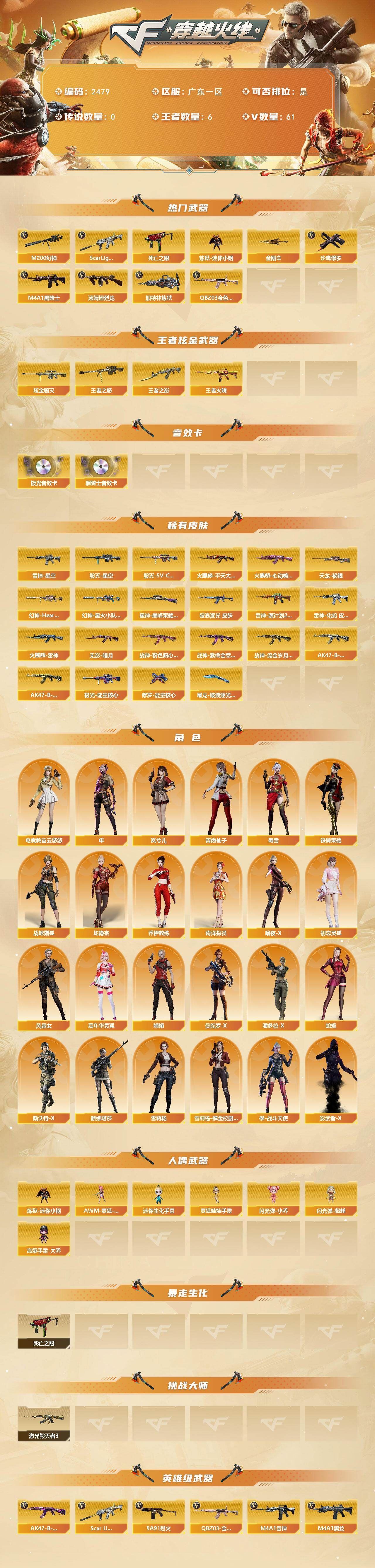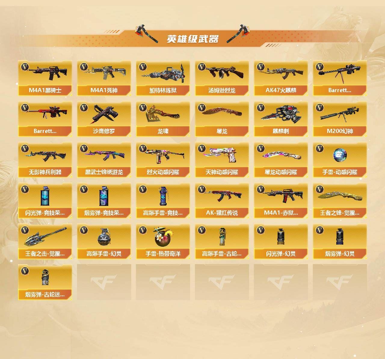 【热门武器】:QBZ03-金色蔷薇,Scar Light-白虎,M200-幻神*2,死亡之眼,炼狱-迷你小钢,M4A1-黑骑士,汤姆逊-烈龙*2,加特林-炼狱*2,沙鹰-修罗*2,金刚伞【王者炫金武器】:王者之影,王者火魄,王者之怒,炫金毁灭【音效卡】:M4A1-黑骑士音效卡,Barrett-极光音效卡【皮肤】:幻神-Heartshot 皮肤,幻神-星火小队签名臻藏版 皮肤,金色蔷薇-破浪逐光 皮肤,星神-巅峰荣耀 皮肤,雷神-星空,雷神-源计划2.0专属 皮肤,雷神-化蛇 皮肤,火麒麟-雷神*2,火麒麟-平天大圣,火麒麟-心动糖果,毁灭-星空,毁灭-SV-CFPLS16冠军,无影-暗月,战神-粉色甜心皮肤,战神-紫绶金章皮肤,战神-流金岁月皮肤,AK47-B-常胜将军-刘备*2,AK47-B-常胜将军-孙权,天龙-秘银,极光-能量核心,修罗-能量核心,屠龙-破浪逐光 皮肤【角色】:电竞教官-云悠悠,岚兮儿,隼,战地猎狐,蛇隐宗,奇洋探员,乔伊教练,暗夜-X,初恋灵狐,风暴女,嘉年华灵狐,娟娟,曼陀罗-X,潘多拉-X,青霞仙子,蛇姬,斯沃特-X,蜀雪,铁骑荣耀,新娜塔莎,雪莉杨,雪莉杨-摸金校尉,樱-战斗天使,影武者-X【人偶武器】:炼狱-迷你小钢,AWM-灵狐-15周年嘉年华,迷你生化手雷,闪光弹-小乔,闪光弹-貂蝉,高爆手雷-大乔,灵狐娃娃手雷【暴走生化】:死亡之眼【挑战大师】:激光毁灭者III【英雄级武器】:AK47-火麒麟*2,M4A1-黑龙,M4A1-雷神,M4A1-黑骑士,M4A1-死神,Scar Light-白虎,无影-神兵利器,黑武士-锦绣游龙,QBZ03-金色蔷薇,9A91-烈火,烈火-动感闪耀,AK-47-猩红传说,AK47-B-常胜将军,Barrett-毁灭*2,Barrett-极光,M200-幻神*2,加特林-炼狱*2,汤姆逊-烈龙*2,沙鹰-修罗*2,天神-动感闪耀,屠龙*2,龙啸,麒麟刺,屠龙-动感闪耀,王者之锋-觉醒版,王者之击-觉醒版*2,高爆手雷-幻灵*7,高爆手雷-竞技荣光*2,手雷-动感闪耀,手雷-热带奇洋,高爆手雷-古蛇迷踪,闪光弹-幻灵*4,闪光弹-竞技荣光,烟雾弹-幻灵*3,烟雾弹-竞技荣光,烟雾弹-古蛇迷踪,M4A1-赤狱骑士【道具】:CFS限定背包,EP战队炫彩背包,古蛇迷踪炫彩背包,奇洋探员-海龟背包,战舰背包,背包-葫芦兄弟,虎牙炫彩背包,超级背包,黄金曼提柯尔的背包,救世主-黑桃战神,绿色巨人,灵魂忍者,迷雾幽灵,生化弹匣,夺命之镰,防化服*2,金色流光-枪王排位*2,星辰流光-枪王排位,巅峰赛先锋-金色流光,枪王排位28赛季金色流光,枪王排位29赛季金色流光,动感闪耀表情,EP战队名片,EP战队喷图,EP战队击杀图标,防弹头盔*7,防弹衣*8,C4工具钳*5,手雷包*4;隼,电竞教官-云悠悠,QBZ03-金色蔷薇,M200-幻神,Scar Light-白虎,