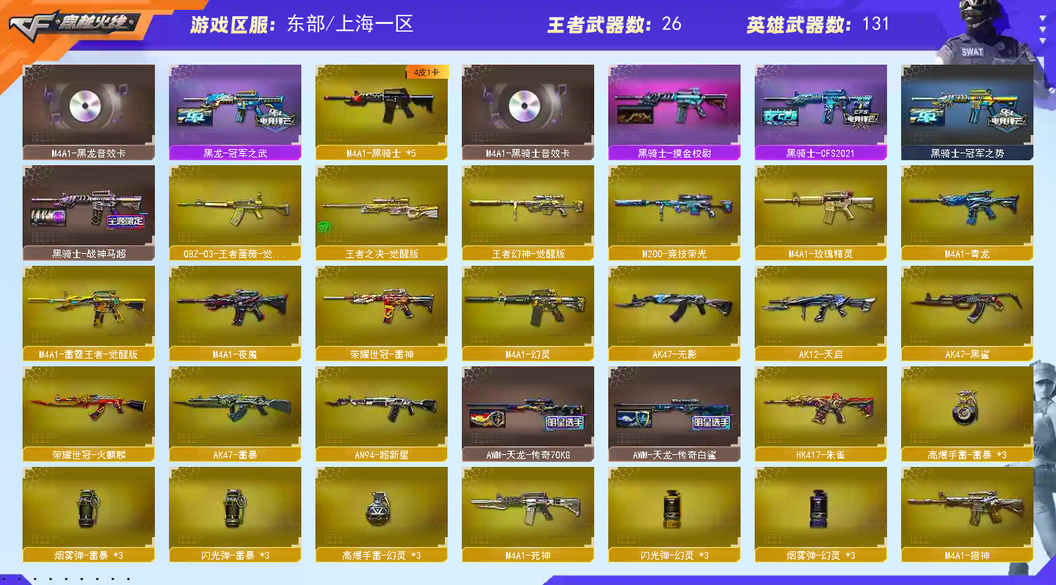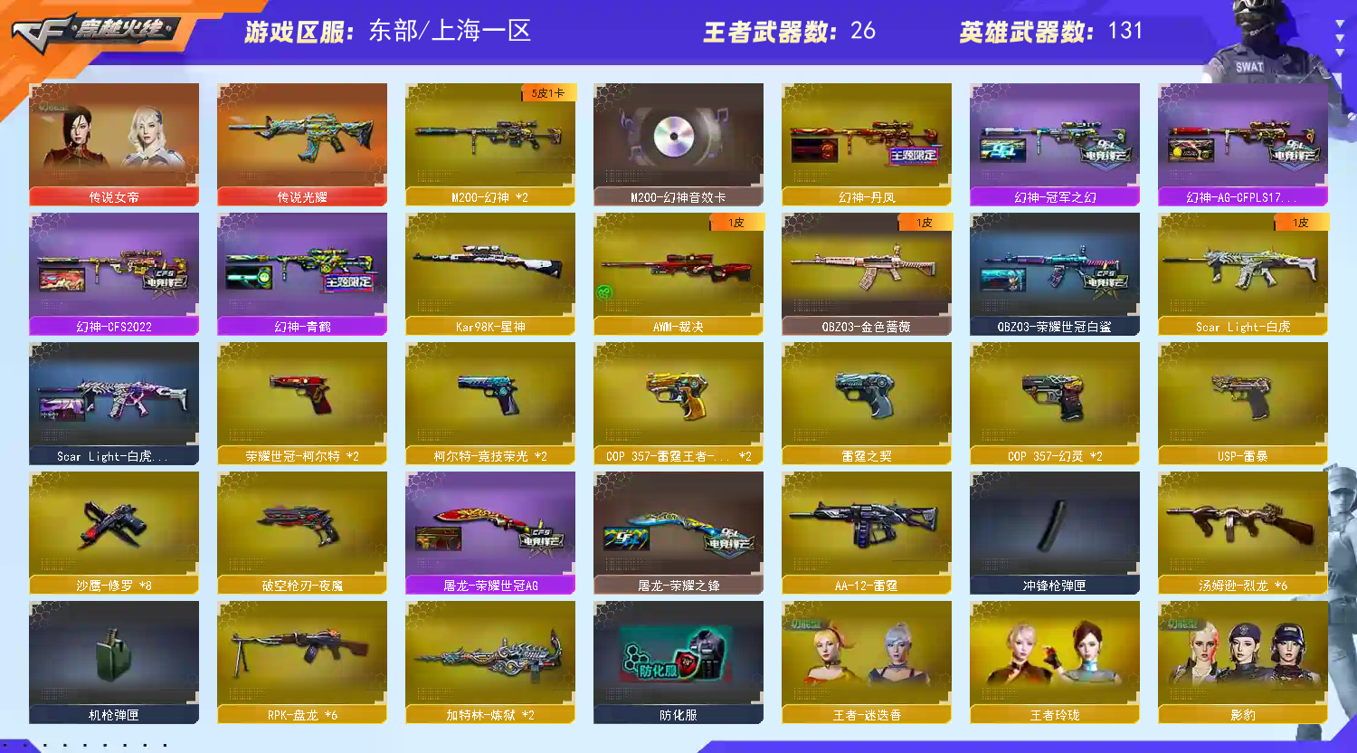 【四防传说女帝】【M200-幻神+音效卡+幻神-丹凤+幻神-冠军之幻+幻神-CFS2022+幻神-青鹤+幻神-AG-CFPLS17】【Kar98K-星神】【竞技荣光套+四防云悠悠】【王者幻神】【传说光耀(2222)】【ScarLight-白虎】【QBZ03-金色蔷薇+荣耀世冠白鲨】【生化 6盘龙 炼狱 6烈龙】【裁决】【Barrett-毁灭+音效卡+毁灭-荣耀之怒】【极光】【雷暴套】【夜魔套】【幻灵套】【AK47-火麒麟+AK47-火麒麟-荣耀世冠ag+火麒麟-even】【黑龙+音效卡+黑龙-冠军之武】【M4A1-雷神+音效卡+烈虎+雷神-荣耀世冠ag+雷神-lgd18冠军+雷神-宠儿+雷神-传奇n9+雷神-白鲨14冠军+雷神-荣耀之魄+雷神-冠军之魄】【5黑骑士+音效卡+白马银枪+黑骑士-冠军之势+黑骑士-马超】【王者之啸 王者之武 王者之魄 王者之势 王者之戮 王者炎心 王者火魄 王者之决 王者雷怒】【无影 死神 天启 超新星 黑鲨 龙血 hk417-朱雀】【18手枪 修罗*7 cop雷霆 usp累吧奥 cop幻灵*2 荣耀世冠-柯尔*2 cop雷霆王者*2】【17近战 屠龙*7 麒麟刺 斩神刀雷暴 幻灵之峰 王者之击】【手雷 雷暴雷 夜魔雷 幻灵雷 竞技荣光】【四防 兰巾帼英雄 鹰 影豹 王者葵貂蝉 王者零国色天香 王者迷迭香 王者瞳闭月羞花 王者玲珑小乔】;USP-雷暴,荣耀世冠-柯尔特,传说女帝,电竞教官-云悠悠,RPK-盘龙,QBZ03-金色蔷薇,M200-幻神,