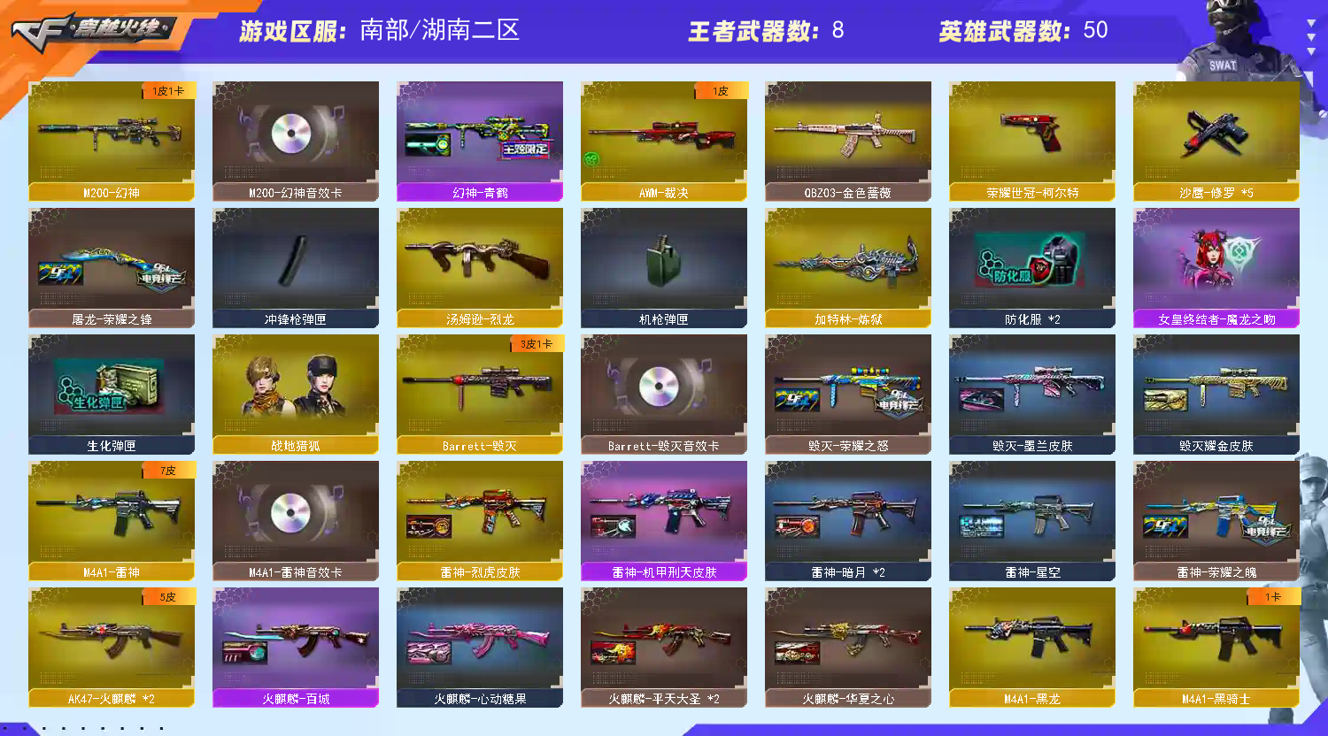 【m200幻神+幻神青鹤+幻神音效卡】【世冠柯尔特】【裁决】【毁灭荣耀之怒+雷神荣耀之魄+火麒麟华夏之心+屠龙荣耀之锋】【毁灭音效卡+雷神音效卡+黑骑士音效卡】【嘉年华灵狐】【金色蔷薇】【火麒麟+雷神+黑骑士+毁灭+炼狱】【烈龙】【试炼破坏者】【cop旗袍】【1911大黄蜂】【闪光护目镜+超级背包】;荣耀世冠-柯尔特,QBZ03-金色蔷薇,M200-幻神,