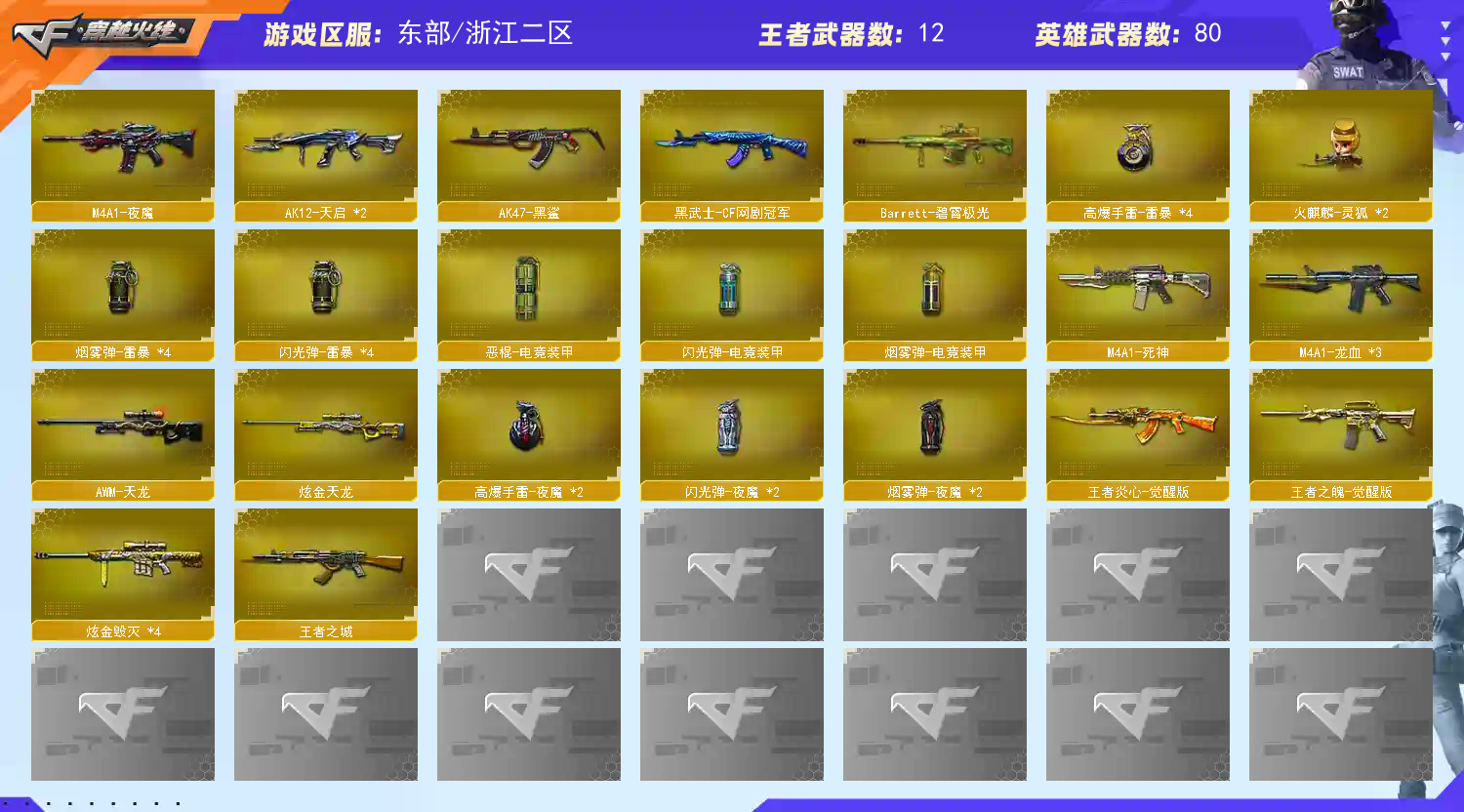 【6黑骑士 6烈龙 6盘龙 炼狱】【传说武器】:传说暗裔【热门武器】:传说暗裔,加特林-炼狱,M4A1-黑骑士,RPK-盘龙,Scar Light-白虎,斯泰尔-蝴蝶,沙鹰-修罗,汤姆逊-烈龙,USP-雷暴,王者幻神,COP-白鲨【王者炫金武器】:王者之城,王者幻神,王者之灵,王者之刺,炫金毁灭,炫金天龙【音效卡】:AK47-火麒麟,M4A1-黑骑士,Barrett-毁灭,M4A1-雷神,Barrett-碧霄极光【皮肤】:火麒麟-华夏之心,火麒麟-战神关羽,毁灭-星空,黑龙-墨子,雷神-虎将,雷神-耀金,M4A1-黑龙-361【角色】:迷迭香,审判者,王者玲珑,王者-魅影,炫,零·纪元,战地猎狐,乔伊教练,修道士,暗夜-X,风暴女,虎妞,潘多拉-X,影武者-X【人偶武器】:火麒麟-灵狐,迷你生化手雷,斯泰尔-蝴蝶,COP-白鲨【挑战大师】:冰龙粉碎者-白马银枪,神圣爆裂者-末日III,VEPR-12-金魔【英雄级武器】:9A91-烈火,AK47-火麒麟,AK12-天启,AK47-黑鲨,AWM-天龙,Barrett-毁灭,加特林-炼狱,柯尔特-电竞装甲,龙啸,M4A1-黑龙,M4A1-雷神,M4A1-黑骑士,M4A1-死神,M4A1-龙血,M4A1-夜魔,M4A1-玫瑰精灵【道具】:XROCK炫彩背包,全能枪王背包,奇洋探员-海龟背包,女皇终结者-背包,战舰背包,炫彩背包,黑桃战神背包,哔哩哔哩名片,圣拳猎手-炽雪,女皇终结者-魔龙之吻,救世主-黑桃战神,妩媚妖姬,绿色巨人,灵魂忍者,变异宝贝,迷雾幽灵【特殊枪械】:1蝴蝶斯泰尔,1炼狱,1黑骑士,1盘龙,1白虎,1烈龙;USP-雷暴,RPK-盘龙,Scar Light-白虎,传说暗裔,