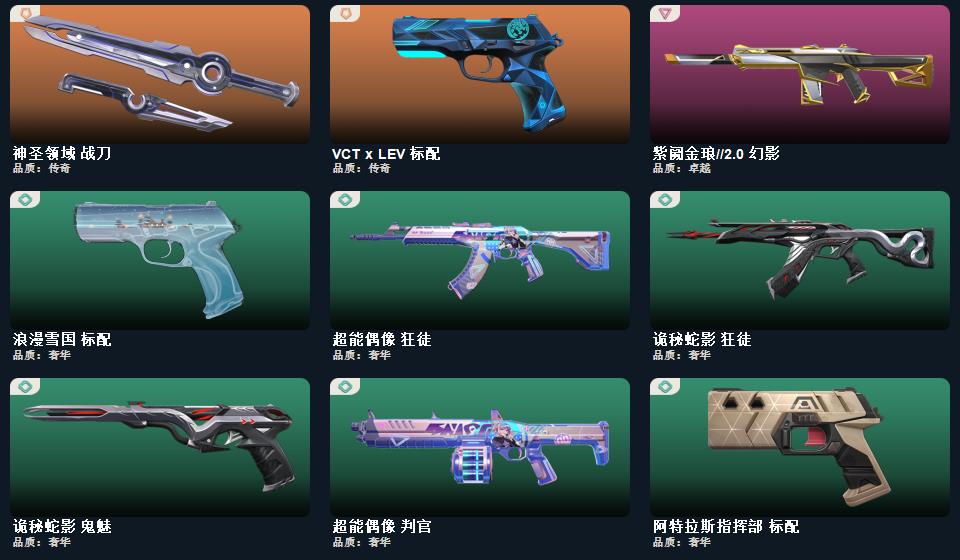 wegame无畏契约★阿特拉斯指挥部 标配,折光棱晶 标配,末日之翼 短炮,诡秘蛇影 鬼魅,神圣领域 狂怒,月球哨兵 正义,星云暗涌 鬼魅,西部未来 正义,纳米打击 正义,聚合之力 狂怒,采蜜小蜂队 鬼魅,VCT x LEV 标配,浪漫雪国 标配