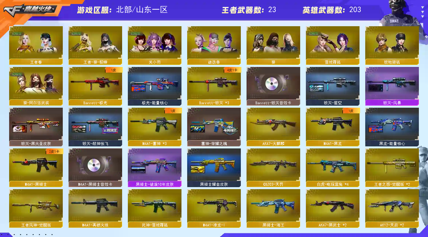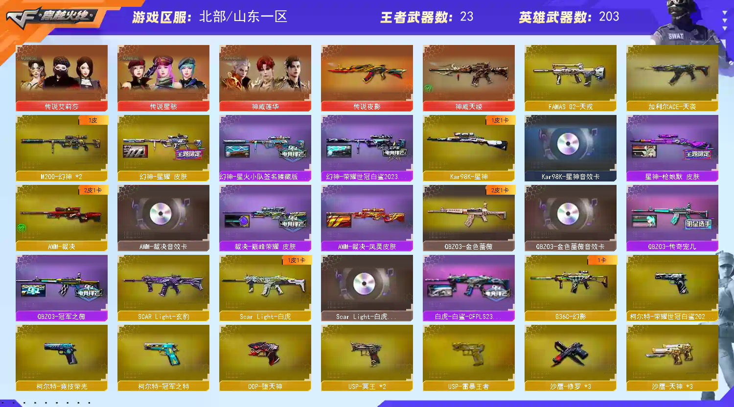 神威莲花 双国王狮子 金翼狮 泡泡象玄武*3龙宝*3炽芒蝶刃*7序列号 生化王者名;USP-雷暴王者,柯尔特-荣耀世冠白鲨2023,柯尔特-冠军之特,炽芒蝶刃,传说星骇,隼,电竞教官-云悠悠,