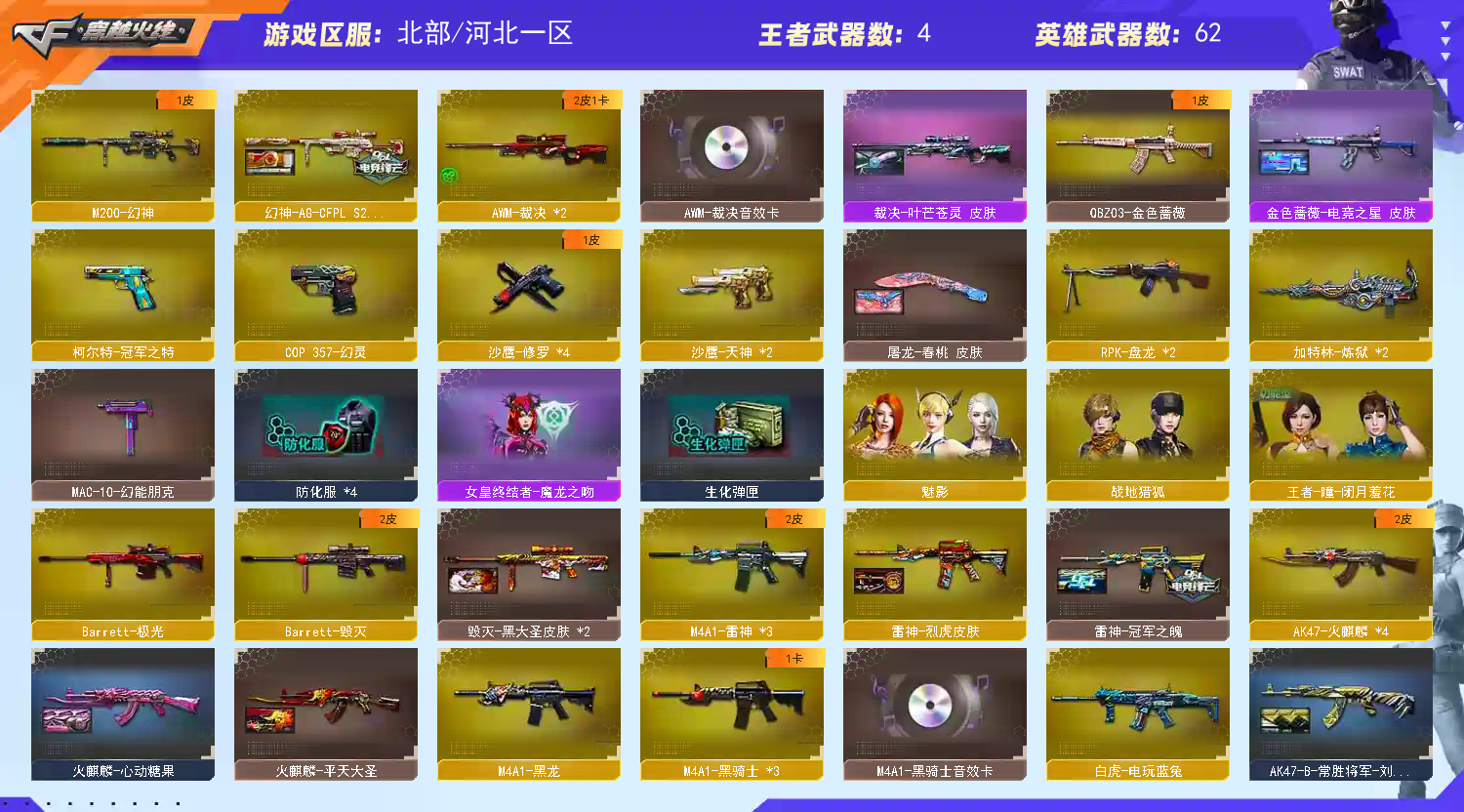 爆破号❤幻神AG24❤裁决卡+叶芒百城❤冠军之特❤COP幻灵❤白虎电玩❤金色蔷薇电竞之星❤朱雀音效卡 由于排位新赛季改版,麻烦各位老板新赛季排位不要随意退排位会禁赛,还有希望冬位老板如果上号发现还有未结束的排位赛,可以接上打完,在此谢谢了❤ 【温馨提示】开始登录游戏时不要动鼠标,静等一两分钟,多次登录不上就选择(F9)账号密码登录即可! 登录不上请耐心多尝试几次 登号时别动鼠标登录不上请耐心多尝试几次 登号时别动鼠标登录不上请耐心多尝试几次 登号时别动鼠标 由于异地登录保护机制,部分客户在使用客户端自动上号时会 出现密码错误,注意本号密码不会错误,请多尝试5-6次! 安全分不足时大厅匹配游戏即可。谢谢! 多四防角色,各种皮肤武器光效玩偶道具,欢迎来体验!武器 太多,截不了那么多图! 【温馨提示】此号价值数十万,如有开G开辅助封号的,想想 自己是否能够承担的起后果自负,由平台提供,身份信息,证据和地址进行报警处理!祝各位老板玩得开心。请使用官方启动,更快捷稳定上号。偶尔会异地冻结,显示暂时无法登陆,请维权更新密码,商品完成维权代表密码已更新,再次下单即可,带来不便,抱歉。恶意下单维权及检测到外挂将无法再次下单! 【游戏小贴士】官方启动高配置电脑分辨率调整144hz刷新率16:9比例1920*1080画面更清晰,设置好分辨率结束游戏重新打开游戏界面登录(不退游戏登录器)无黑屏,关闭击中效果,开启饰品确认攻击,游戏体验更佳。 【请租客爱护此号,当成自己号玩,喜欢请收藏,感谢】;柯尔特-冠军之特,RPK-盘龙,QBZ03-金色蔷薇,M200-幻神,