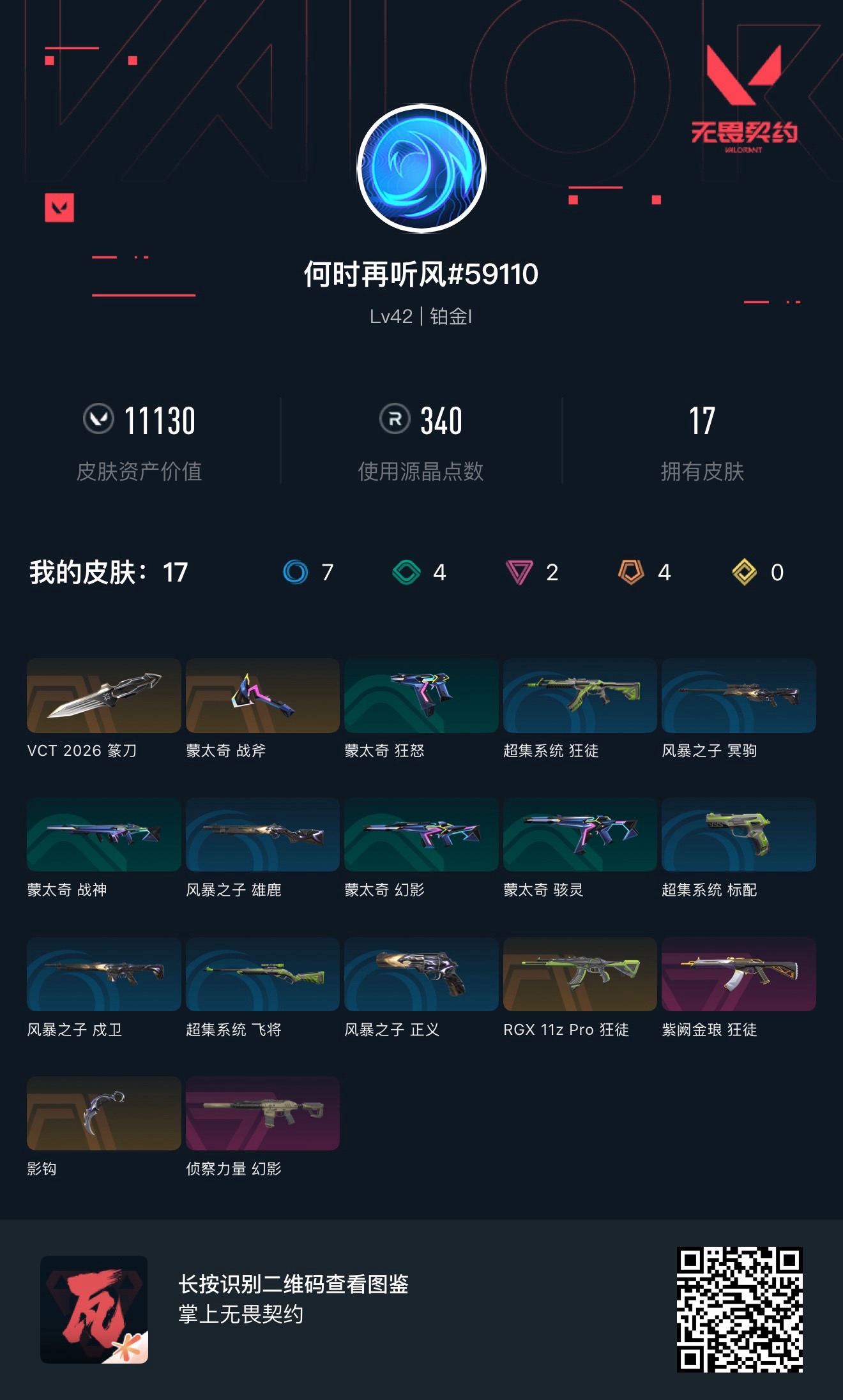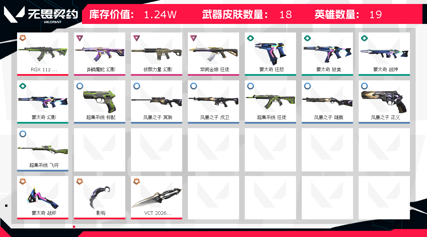 英雄16 武器皮肤数量17;异鳞魔蛇 幻影,侦察力量 幻影,紫阙金琅 狂徒,RGX 11z Pro 狂徒,