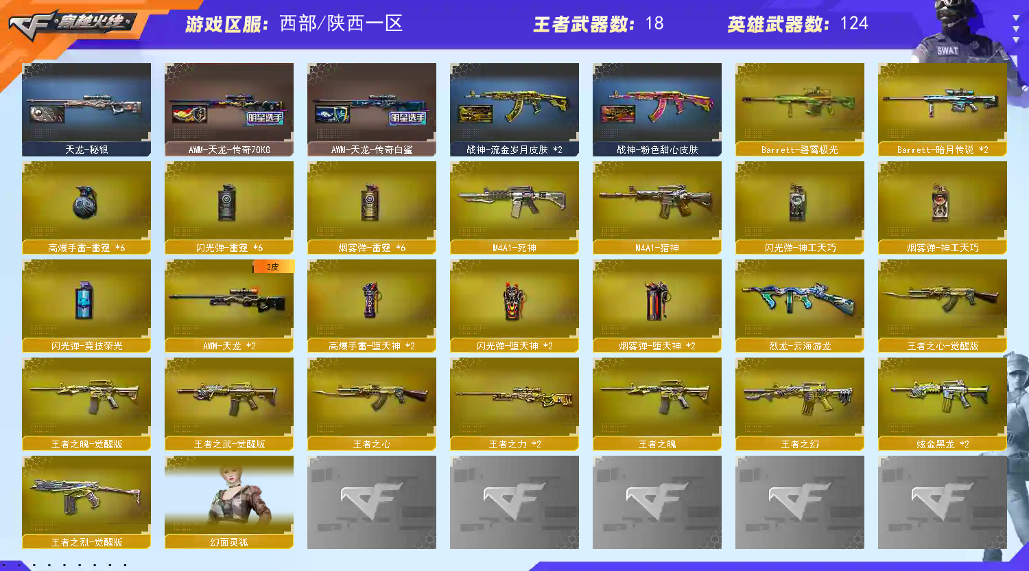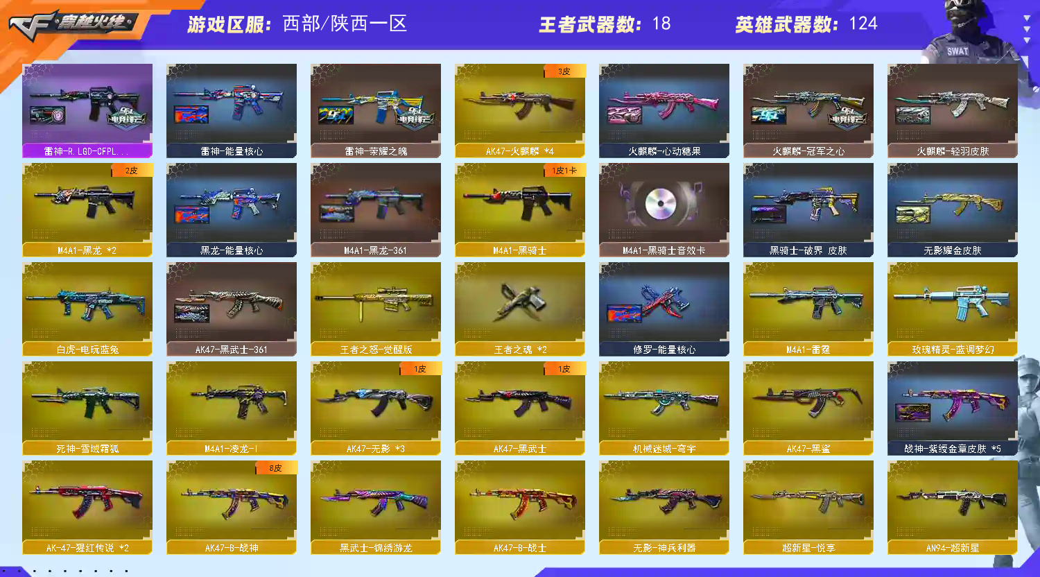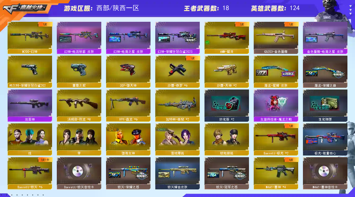 【m200幻神+电流骇客+荣耀世冠白鲨2023+电竞之星】【6烈龙 6盘龙 炼狱 死亡之眼】【qbz金色蔷薇】【朱雀】【火麒麟+冠军之心 】【黑龙】【雷神+卡+荣耀之魄+s18冠军】【黑骑士+卡】【毁灭+卡+ag15冠军+冠军之怒+荣耀之怒】【极光】【裁决】【武器:雷霆 王者之心 王者之武 王者之魄 王者之烈 白虎电玩】【10手枪:修罗*6 天神*2 雷霆 堕天神 柯尔特荣耀世冠白鲨】【18刀具:屠龙*5 龙啸 擎天*3 麒麟刺*2 尼泊尔雷霆 堕天神 王者之锋 王者之击 龙啸】【8雷套:雷霆雷*6 堕天神雷*2】【小人枪:cop白鲨】【音效卡:雷神音效卡 黑骑士音效卡 毁灭音效卡】【角色:零 炫 零纪元 战地猎狐】;柯尔特-荣耀世冠白鲨2023,RPK-盘龙,QBZ03-金色蔷薇,M200-幻神,