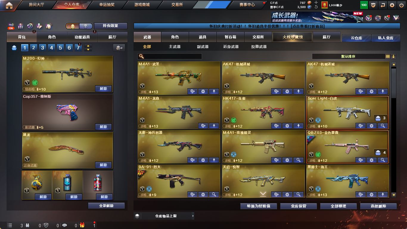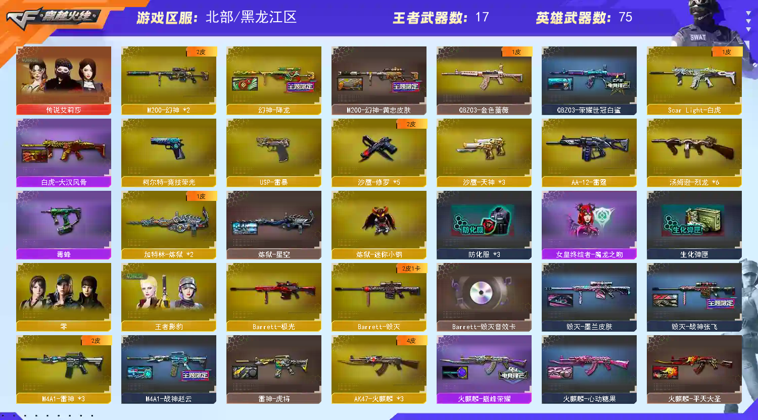 【四防传说艾莉莎】【M200-幻神+降龙+幻神-黄忠】【竞技荣光套】【ScarLight-白虎】【QBZ03-金色蔷薇+荣耀世冠白鲨】【生化 炼狱 6烈龙 毒蜂 死亡之眼】【火麒麟+巅峰荣耀】【黑龙+音效卡】【雷神】【黑骑士+音效卡】【王者芳薇 王者青龙 王者之怒】【无影 死神 黑武士 天启 hk417-朱雀+音效卡】【10手枪 修罗*4 天神*3 usp雷暴】【8近战 屠龙*2 龙啸 擎天 麒麟刺 幻灵之锋】【手雷 竞技荣光 雷霆王者*2】【四防 王者影豹 职业经理】;