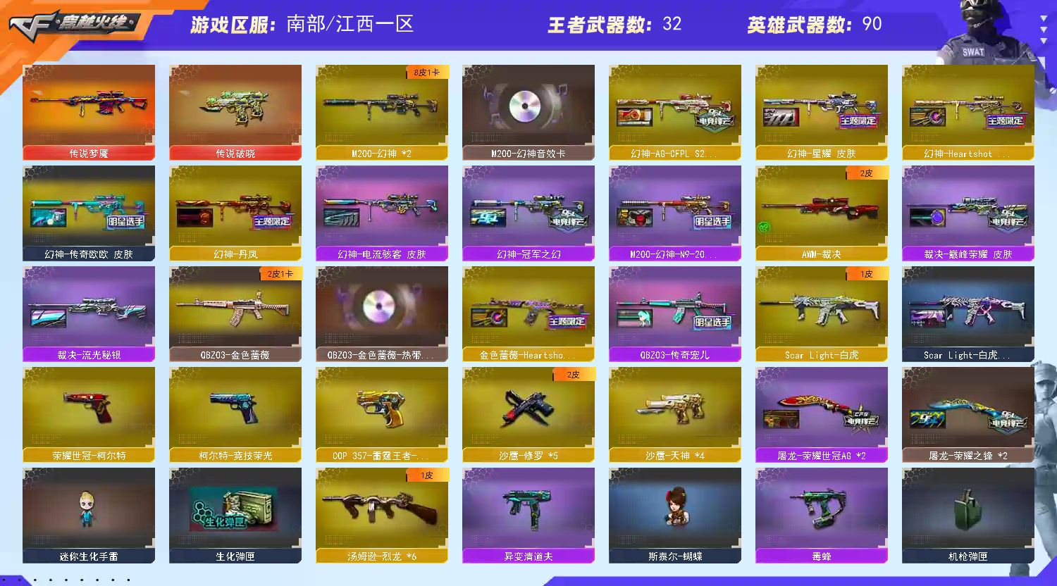 【亮点解析 幻神三件套+8皮】【M200-幻神+音效卡+幻神-传奇欧欧+ag24冠军+幻神-丹凤+heartshot+幻神-星耀+电流骇客+幻神-冠军之幻+幻神-n9】【竞技荣光套+四防云悠悠+usp雷暴】【王者幻神】【王者星霆】【传说梦魇+传说破晓】【生化 6炼狱 6烈龙 异变清道夫 蝴蝶 黄金猫猫手套白鲨】【裁决+巅峰荣耀】【毁灭+音效卡+heartshot+毁灭-荣耀之怒】【白虎之魄】【ScarLight-白虎】【QBZ03-金色蔷薇+heartshot+宠儿】【火麒麟+音效卡+heartshot+火麒麟-荣耀世冠ag+毁灭-荣耀之怒+火麒麟-even+火麒麟-冠军之心】【黑龙】【雷神+音效卡+heartshot+雷神-荣耀世冠ag+雷神-宠儿+雷神-荣耀之魄+雷神-白鲨14冠军】【6黑骑士+音效卡】【王者之心 王者之影 王者之翼】【黑武士 天启 超新星】【14手枪 修罗*5 天神*4 cop雷霆王者】【9近战 屠龙*3 王者之击 擎天】【手雷 堕天神*3 竞技荣光 雷霆王者*2】【四防 王者葵貂蝉 王者零华冠丽服 王者炫】;荣耀世冠-柯尔特,电竞教官-云悠悠,QBZ03-金色蔷薇,M200-幻神,Scar Light-白虎,
