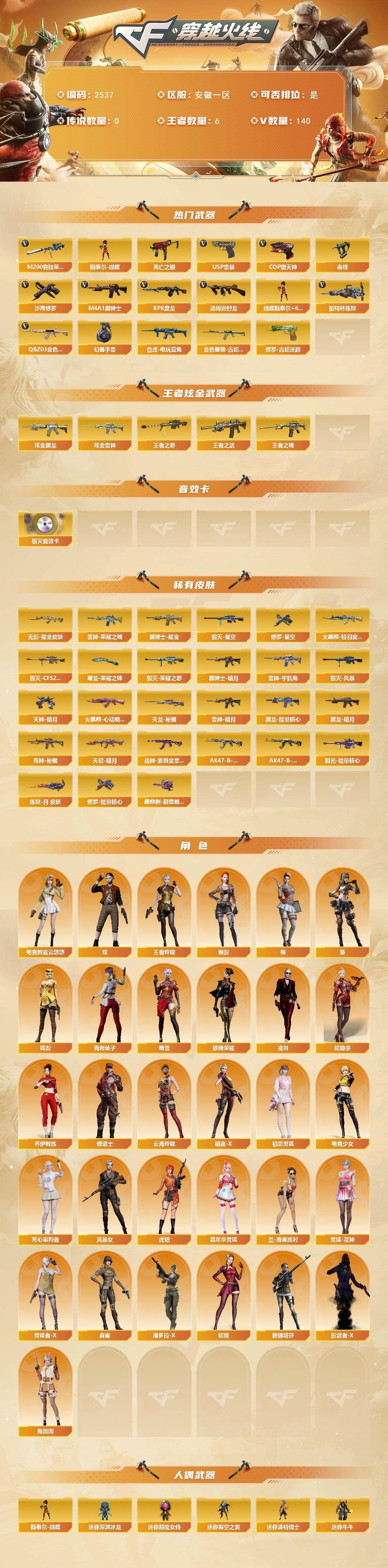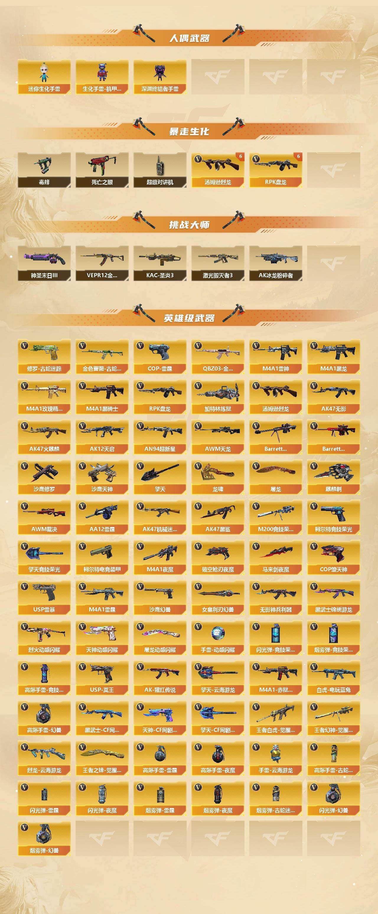 【热门武器】:QBZ03-金色蔷薇,金色蔷薇-古蛇迷踪,修罗-古蛇迷踪,M200-竞技荣光,死亡之眼,白虎-电玩蓝兔,毒蜂,M4A1-黑骑士,汤姆逊-烈龙*6,RPK-盘龙*6,加特林-炼狱,斯泰尔-蝴蝶,USP-雷暴,COP-堕天神,沙鹰-修罗*4,高爆手雷-幻兽【王者炫金武器】:王者之武,王者之魄,王者之怒,炫金黑龙,炫金雷神【音效卡】:Barrett-毁灭音效卡【皮肤】:雷神-暗月,雷神-荣耀之魄,雷神-宇航兔皮肤,火麒麟-轻羽皮肤,火麒麟-心动糖果,毁灭-荣耀之怒,毁灭-星空,毁灭-CFS2020,毁灭-风暴,黑龙-能量核心,黑龙-暗月,黑骑士-暗月,黑骑士耀金皮肤,无影耀金皮肤,死神-秘银*4,天启-暗月*2,战神-紫绶金章皮肤*3,AK47-B-常胜将军-刘备,AK47-B-常胜将军-孙权,天龙-秘银,极光-能量核心*2,炼狱-月 皮肤,修罗-能量核心*4,修罗-星空,天神-暗月*3,屠龙-荣耀之锋,麒麟刺-甜蜜糖果 皮肤【角色】:葵,樱,魅影,炫,凌霄,电竞教官-云悠悠,王者玲珑,狐影,蛇隐宗,乔伊教练,修道士,云海玲珑,暗夜-X,初恋灵狐,电竞少女,芳心审判者,风暴女,虎妞,嘉年华灵狐,兰-海滩派对,灵狐-花神,灵狐者-X,麻雀,潘多拉-X,青霞仙子,蛇姬,蜀雪,铁骑荣耀,兔囡囡,新娜塔莎,影武者-X【人偶武器】:斯泰尔-蝴蝶,迷你深渊冰龙,迷你裂空之翼,迷你波特博士,迷你牛牛*2,迷你生化手雷*2,生化手雷-机甲核心*3,深渊终结者手雷*2,迷你超能女侍【暴走生化】:毒蜂,死亡之眼,超级对讲机【挑战大师】:AK47-冰龙粉碎者,VEPR-12-金魔*2,激光毁灭者III*3,KAC-圣炎切割者III,神圣爆裂者-末日III【英雄级武器】:AK47-火麒麟*2,M4A1-黑龙,M4A1-雷神*4,M4A1-黑骑士,AK47-无影,AK12-天启,AN94-超新星,AK47-机械迷城,AK47-黑鲨,M4A1-雷霆,M4A1-夜魔,无影-神兵利器,黑武士-锦绣游龙,金色蔷薇-古蛇迷踪,M4A1-玫瑰精灵,QBZ03-金色蔷薇,烈火-动感闪耀,AK-47-猩红传说,王者白虎-觉醒版,白虎-电玩蓝兔,黑武士-CF网剧冠军,AWM-天龙*2,Barrett-毁灭*4,Barrett-极光,AWM-裁决,M200-竞技荣光,王者幻神-觉醒版,RPK-盘龙*6,加特林-炼狱,汤姆逊-烈龙*6,烈龙-云海游龙,AA-12-雷霆,沙鹰-修罗*4,沙鹰-天神*2,USP-雷暴,COP-雷霆,COP-堕天神,柯尔特-电竞装甲,柯尔特-竞技荣光,破空枪刃-夜魔,沙鹰-幻兽,USP-冥王,天神-动感闪耀,修罗-古蛇迷踪,天神-CF网剧冠军,屠龙*3,龙啸*2,马来剑-夜魔,擎天,麒麟刺*2,擎天-竞技荣光,屠龙-动感闪耀,擎天-云海游龙,女皇利刃-幻兽,擎天-CF网剧冠军,王者之锋-觉醒版,高爆手雷-雷霆*5,高爆手雷-幻兽,高爆手雷-夜魔*7,高爆手雷-竞技荣光,手雷-动感闪耀,手雷-云海游龙,高爆手雷-古蛇迷踪,闪光弹-雷霆*5,闪光弹-幻兽,闪光弹-夜魔*7,闪光弹-竞技荣光,烟雾弹-雷霆*5,烟雾弹-幻兽,烟雾弹-夜魔*7,烟雾弹-竞技荣光,烟雾弹-古蛇迷踪,M4A1-赤狱骑士【道具】:AG战队炫彩背包,BS战队炫彩背包,CFS限定背包,EP战队炫彩背包,EDG炫彩背包,云海游龙炫彩背包,亚洲杯纪念炫彩背包,全能枪王背包,古蛇迷踪炫彩背包,战舰背包,炫彩背包,背包-洛丽塔,虎牙炫彩背包,超级背包,哔哩哔哩名片,女皇终结者-魔龙之吻,救世主-黑桃战神,绿色巨人,灵魂忍者*2,变异宝贝,迷雾幽灵,生化弹匣,夺命之镰*3,防化服*5,金色流光-枪王排位*2,流光-再燃火线,枪王排位28赛季金色流光,枪王排位29赛季金色流光,古蛇迷踪特效,蛇隐宗表情,电玩兔兔表情,斯沃特表情,循环实验表情,动感闪耀表情,云海游龙表情,EP战队名片,EP战队喷图,EP战队击杀图标,防弹头盔*5,防弹衣*5,C4工具钳*4,手雷包*5【特殊枪械】:蝴蝶斯泰尔+6烈龙,1黑骑士,6烈龙,6盘龙,1炼狱,1蝴蝶斯泰尔;USP-雷暴,电竞教官-云悠悠,RPK-盘龙,QBZ03-金色蔷薇,