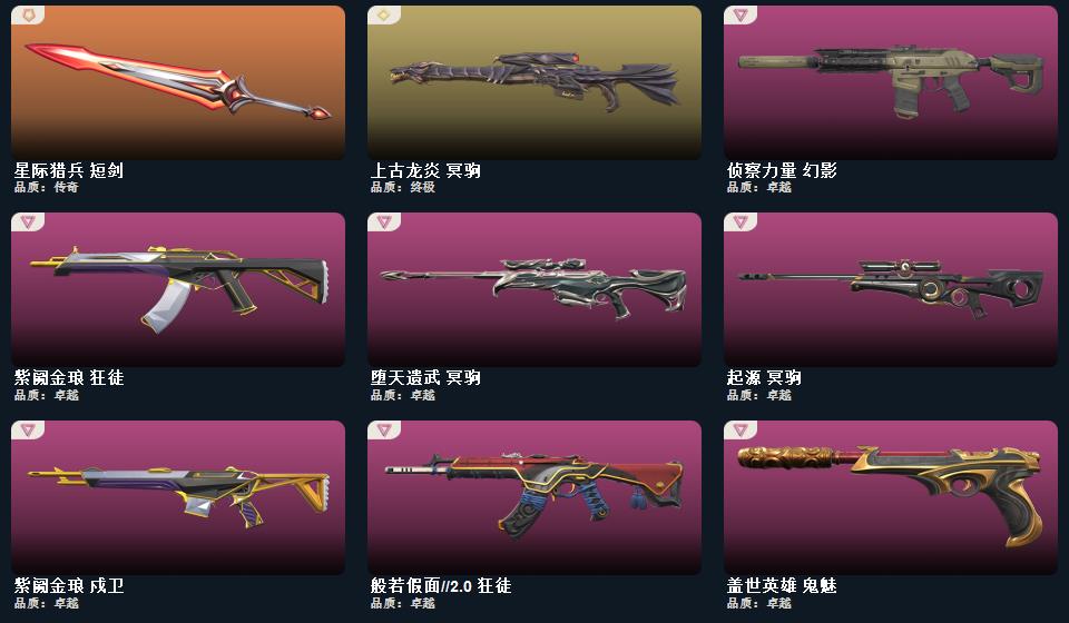【无畏契约】2022全球冠军赛套装【英雄】:炼狱,暮蝶,钛狐,壹决,铁臂,捷风,幽影,不死鸟,贤者,猎枭,零,芮娜,尚勃勒,霓虹,K/O,黑梦【近战武器】:近战武器-2022全球冠军赛 蝴蝶刀,近战武器-镭切,近战武器-阿特拉斯指挥部 甩棍,近战武器-星际猎兵 短剑【狂徒】:狂徒-2025全球冠军赛,狂徒-多弥尔的复仇,狂徒-般若假面//2.0,狂徒-紫阙金琅【幻影】:幻影-2022全球冠军赛,幻影-侦察力量【戍卫】:戍卫-紫阙金琅【冥驹