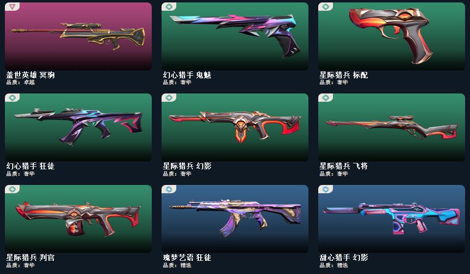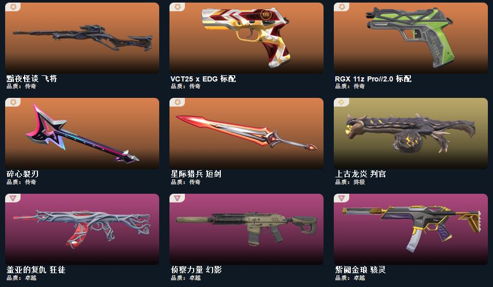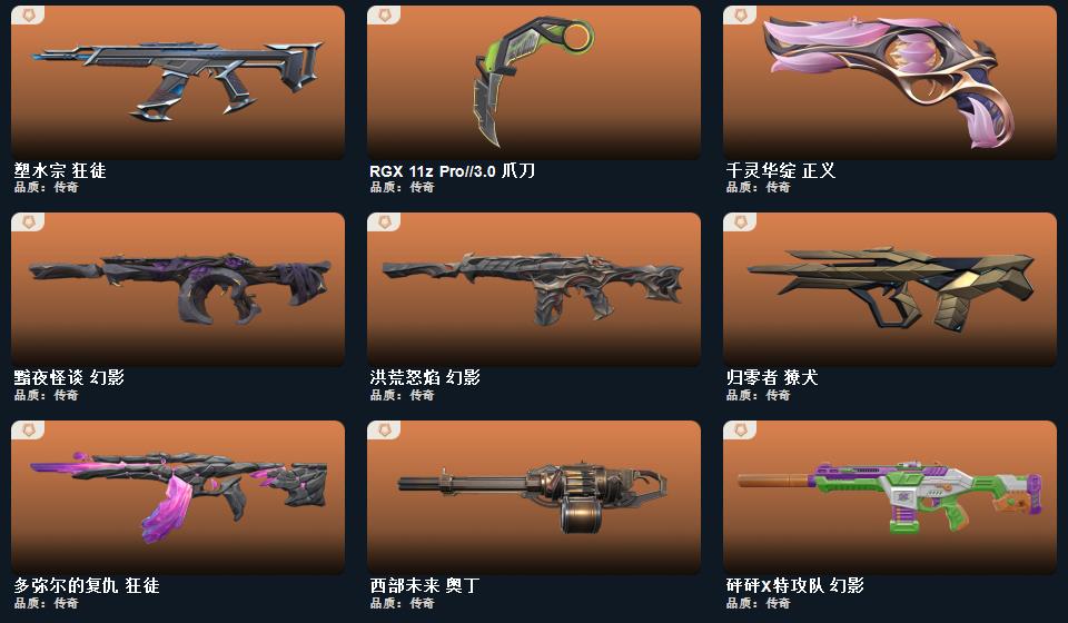 wegame无畏契约★武器皮肤数量:42,碎心裂刃,星际猎兵 短剑,RGX 11z Pro//3.0 爪刀,幻心猎手 鬼魅,紫阙金琅 骇灵,归零者 獠犬,黯夜怪谈 飞将,西部未来 奥丁