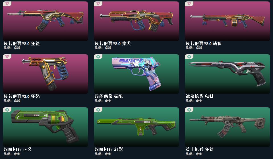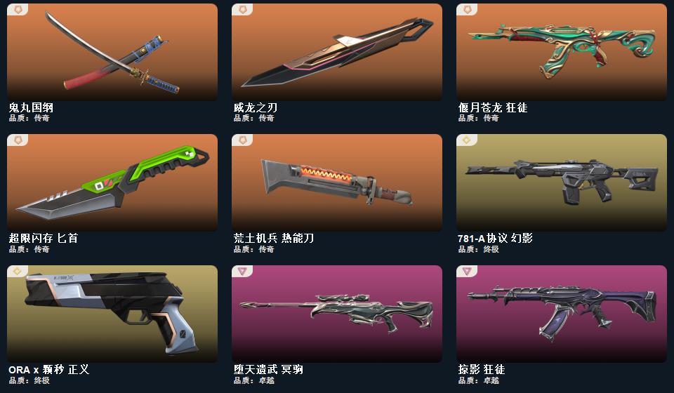 wegame无畏契约★鬼丸国纲,荒土机兵 热能刀,超限闪存 匕首,威龙之刃,ORA x 颗秒 正义,荒土机兵 骇灵,逆冲蛮牛 雄鹿,781-A协议 幻影,般若假面//2.0 獠犬,荒土机兵 冥驹,般若假面//2.0 战神