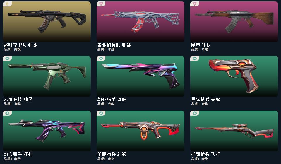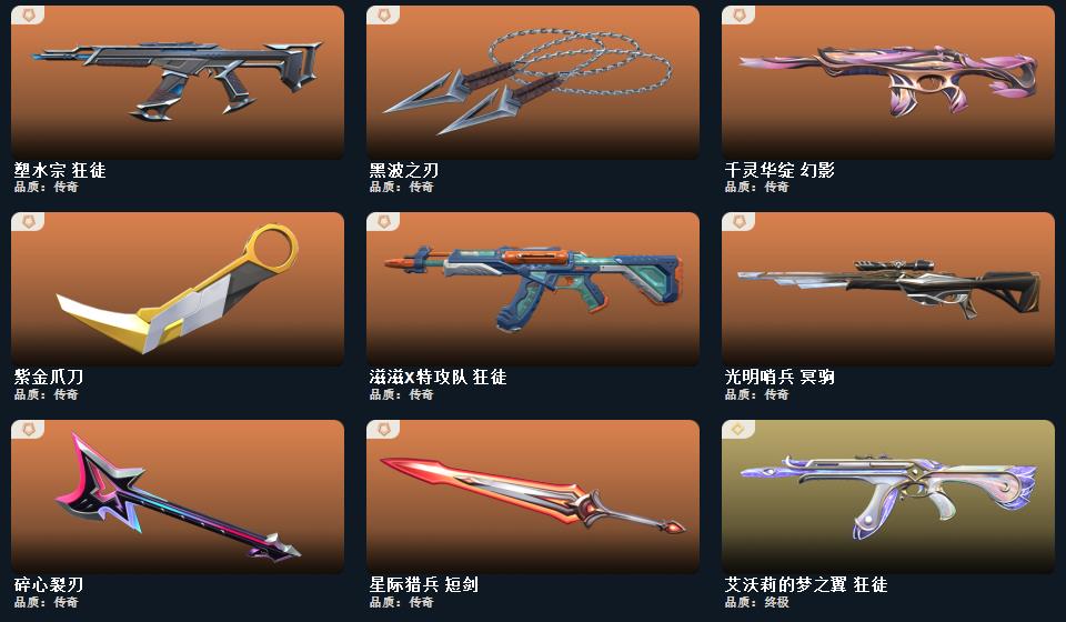 wegame无畏契约★武器皮肤数量:38,黑波之刃,碎心裂刃,紫金爪刀,星际猎兵 短剑 ,幻心猎手 鬼魅,甜心猎手 蜂刺,塑水宗 狂徒,光明哨兵 冥驹,沙场老兵 战神