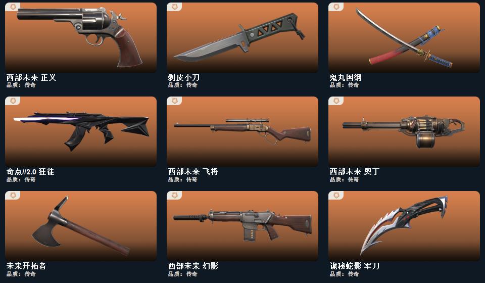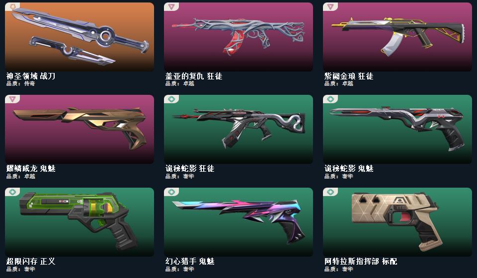 wegame无畏契约★诡秘蛇影 军刀,神圣领域 战刀,未来开拓者,剥皮小刀,鬼丸国纲,幻心猎手 鬼魅,折光棱晶 蜂刺,诡秘蛇影 判官,末日之翼 幻影,诡秘蛇影 莽侠,末日之翼 奥丁