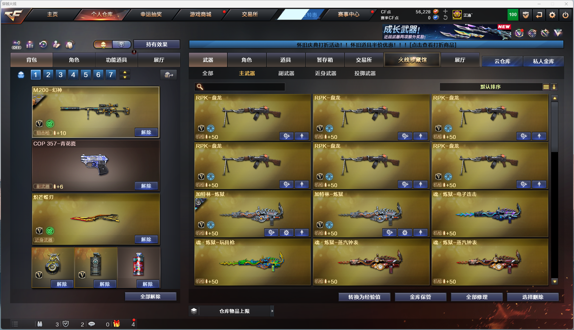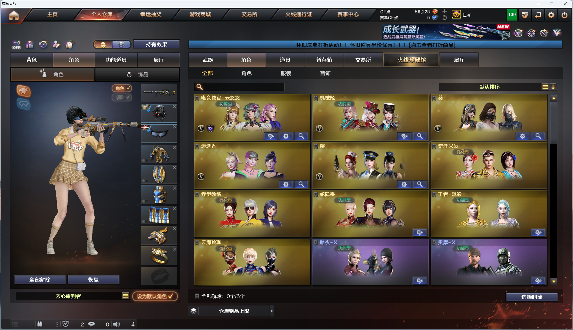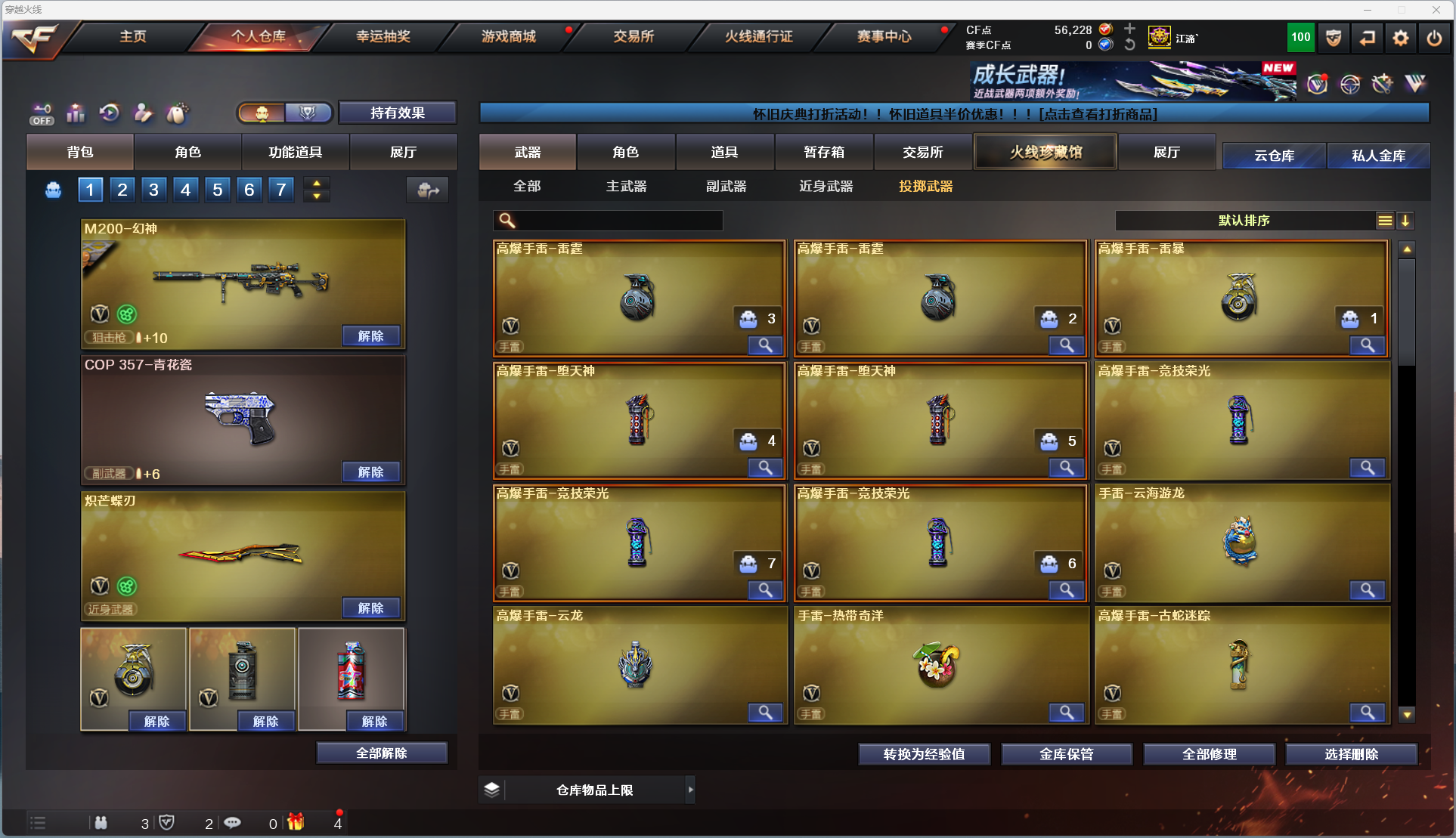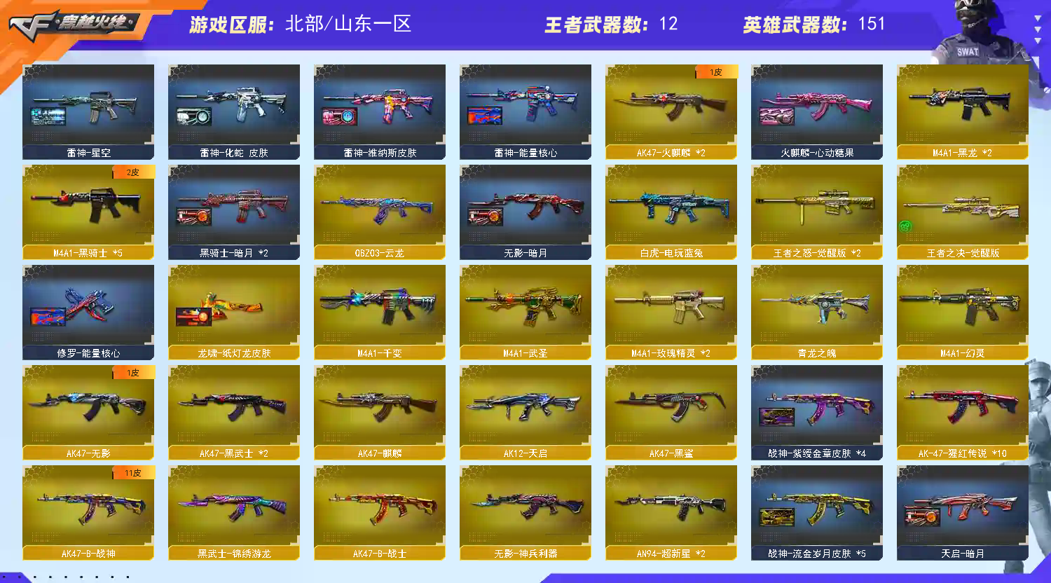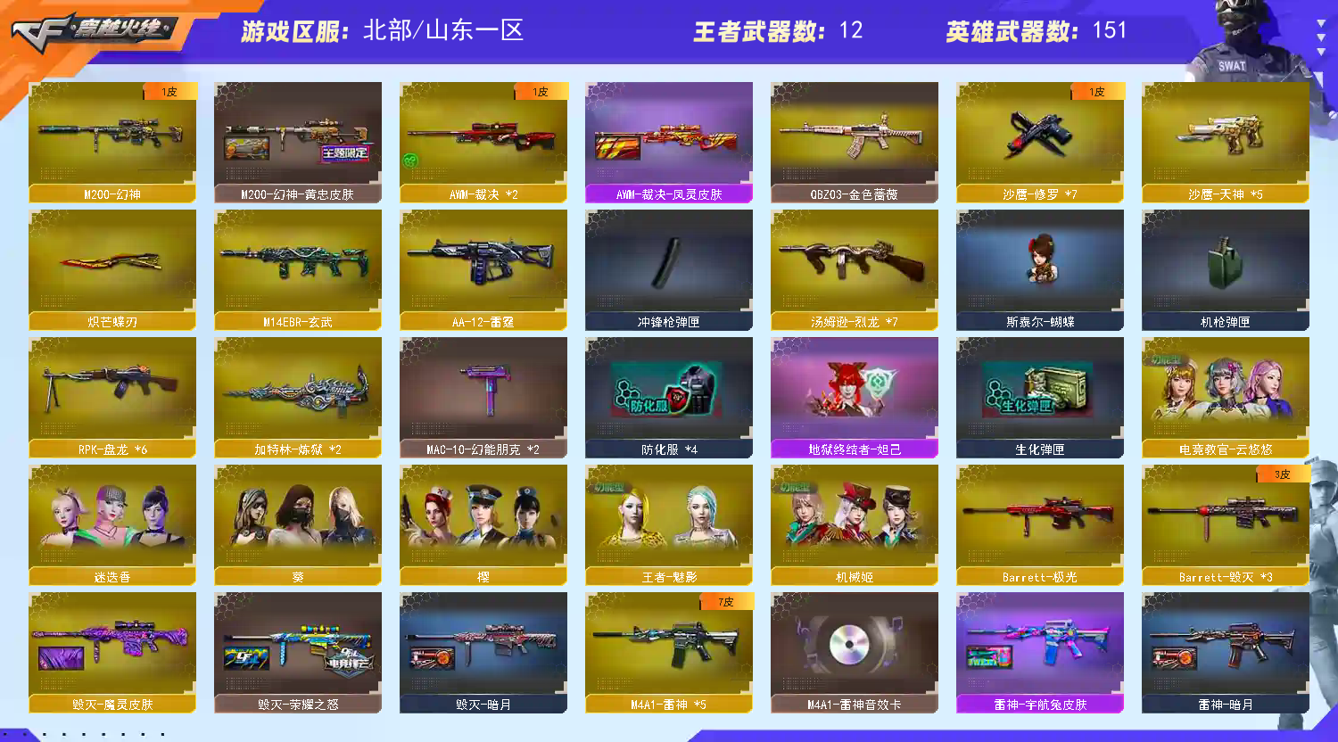 【主武器】 M200 - 幻神 / AWM - 天龙 / AWM - 裁决 / Barrett - 毁灭 / Barrett - 极光 / Barrett - 朱雀 / Barrett - 金色蔷薇 / M4A1 - 龙血 / M4A1 - 幻灵 / M14EBR - 玄武 / 无影 - 神兵利器 / QBZ03 - 云龙 / 黑武士 - 锦绣游龙 / 超新星 - 热带奇洋 / 金色蔷薇 - 古蛇迷踪 / M4A1 - 玫瑰精灵 / M4A1 - 黑骑士 / AK47 - 无影 / M4A1 - 死神 / AK47 - 黑武士 / AK12 - 天启 / AN94 - 超新星 / M4A1 - 武圣 / AK47 - 黑鲨 / RPK - 盘龙 ×5 / 加特林 - 炼狱 ×2 / 魂・炼狱 - 电子连击 / 魂・炼狱 - 玩具枪 / 魂・炼狱 - 蒸汽钟表 ×2 / M4A1 - 千变 / AK47 - 火麒麟 ×2 / AK47 - 麒麟 / M4A1 - 黑龙 ×2 / M4A1 - 雷神 ×4 / 汤姆逊 - 烈龙 ×5 / 烈龙 - 云海游龙 / 烈龙 - 悦心 / 火狱乱世 - 超越 Max / 毒刺 - 金线 / MK5-SS / MP5-SS / 斯太尔 - 蝴蝶 / 死亡之眼 (6 烈 6 盘生化核心配置,爆破全主流枪械齐全) 【稀有角色】 电竞教官 - 云悠悠 / 机械姬 / 葵 / 迷迭香 / 樱 / 奇洋探员 / 乔伊教练 / 蛇隐宗 / 王者 - 魅影 / 云海玲珑 / 暗夜 - X / 奥摩 - X / 芳心审判者 【副武器】 6修罗-天神、COP 357 - 青花瓷 【近身武器】 擎天 / 麒麟刺 ×2 / 麒麟刺 - 堕天神 / 尼泊尔 - 雷霆 / 斩神刀 - 雷霆 / 龙啸 - 堕天神 ×2 / 擎天 - 竞技荣光 / 炽芒蝶刃 / 擎天 - 云海游龙 / 龙啸 - 热带奇洋 【投掷武器】 高爆手雷 - 雷霆 ×3 / 高爆手雷 - 雷霆 ×2 / 高爆手雷 - 雷霆 ×1 / 高爆手雷 - 堕天神 ×4 / 高爆手雷 - 堕天神 ×5 / 高爆手雷 - 竞技荣光 ×7 / 高爆手雷 - 竞技荣光 ×6 / 高爆手雷 - 云龙 / 手雷 - 热带奇洋 / 高爆手雷 - 古蛇迷踪 / 手雷 - 云海游龙 【通用道具】 双 1-7 背包 / 手枪弹匣 / 金蛇戒 / 狙击枪弹夹 / 魔龙戒 / 散弹枪弹夹 / 圣龙戒 / 挑战弹夹 / 银蛇戒 / 防弹头盔 / 烟雾保护头盔 / 防弹衣 / C4 工具钳 / 手雷包 / 步枪弹匣 / 冲锋枪弹匣 / 机枪弹匣 / 闪光护目镜 / 超级护目镜 / 超级对讲机 / 超级背包 / 透明头盔 / 透明护目镜 / 新彩色昵称 【生化专用道具】 永久生化弹夹 / 防化服 / 幽灵之刃 / 减少停顿道具(不退包)/ 灵魂忍者 / 绿巨人 / 变异宝贝 / 伪装幽灵 / 肩膀佩戴超级对讲机(榴弹 3/22)/ 迷你生化手雷 【其他亮点】 全模式通用,爆破 / 生化 / 挑战通吃;炽芒蝶刃,电竞教官-云悠悠,RPK-盘龙,QBZ03-金色蔷薇,M200-幻神,