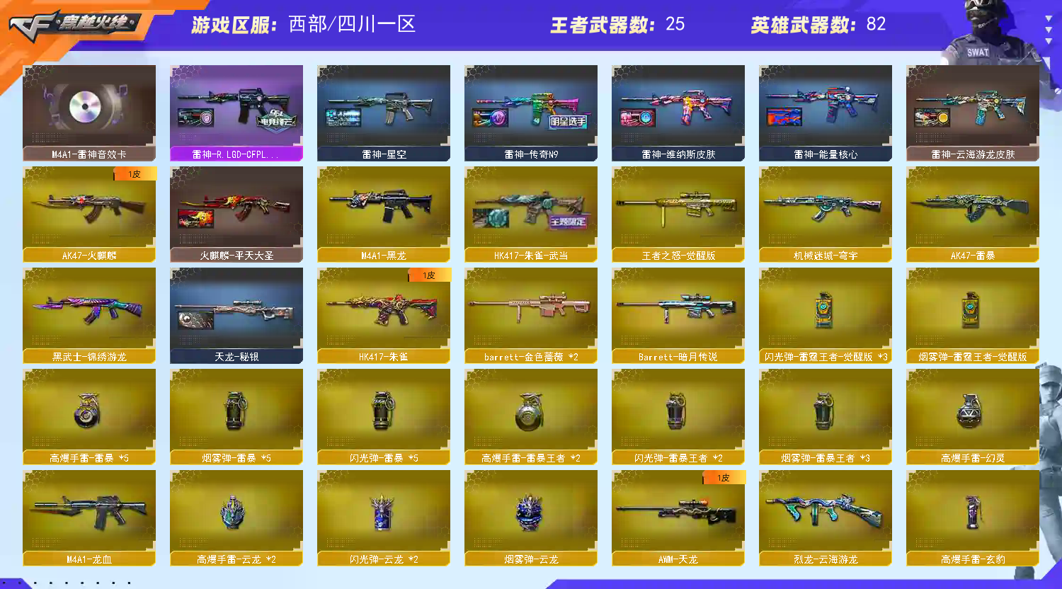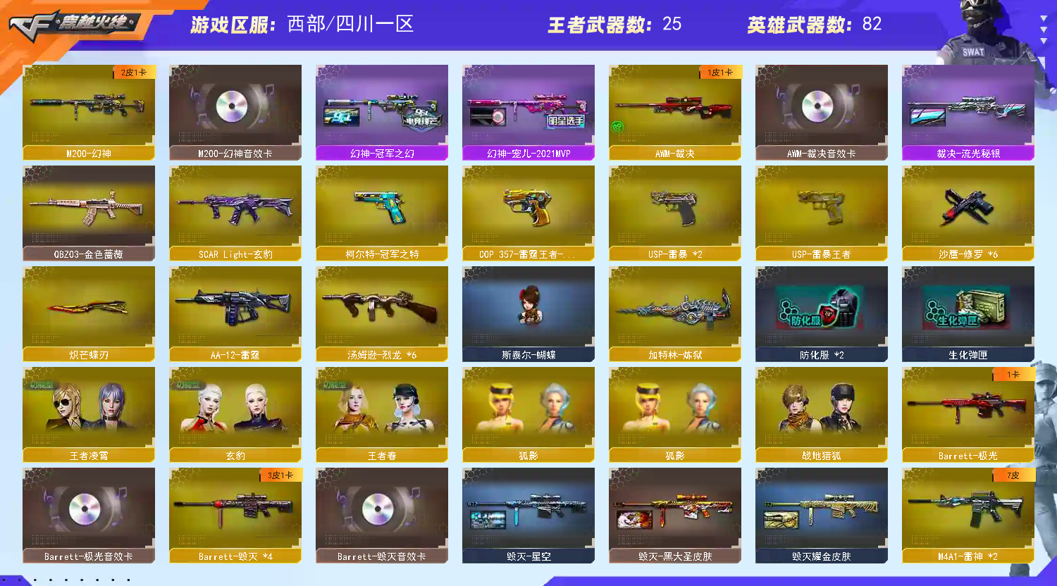 【热门武器】:QBZ03-金色蔷薇,HK417-朱雀,M200-幻神,死亡之眼,柯尔特-冠军之特,汤姆逊-烈龙*6,加特林-炼狱,斯泰尔-蝴蝶,USP-雷暴*2,沙鹰-修罗*6,炽芒蝶刃【王者炫金武器】:王者之势,王者之心,王者凌虎,USP-雷暴王者,雷霆王者之锋,炫金天神*2【音效卡】:M200-幻神音效卡,M4A1-雷神音效卡,M4A1-黑骑士音效卡,Barrett-毁灭音效卡,Barrett-极光音效卡,AWM-裁决音效卡【皮肤】:幻神-冠军之幻,幻神-宠儿-2021MVP,Scar Light-白虎-暗星,ScarLight-白虎-冠军之虎皮肤,裁决-流光秘银,Kar98K-星神-冠军之星皮肤,雷神-能量核心,雷神-星空,雷神-传奇N9,雷神-R.LGD-CFPLS18冠军,雷神-维纳斯皮肤,雷神-云海游龙皮肤,火麒麟-平天大圣,毁灭耀金皮肤,毁灭-星空,毁灭-AG-CFPLS15冠军,毁灭-黑大圣皮肤,毁灭-虹光风暴 皮肤,M4A1-千变-孔明皮肤,黑骑士-少林,HK417-朱雀-武当,天龙-秘银,擎天-蒸汽钟表 皮肤【角色】:玄豹,战地猎狐,王者春,王者凌霄,狐影,奇洋探员,云海玲珑,暗夜-X,初恋灵狐,芳心审判者,飞虎队-X,兰-新年限定,猎狐者-追月,零-水下丽影,灵狐者-X,灵狐者-黄金海岸,灵狐者-七夕宝贝,灵狐者-职业经理,麻雀,曼陀罗-X,潘多拉-X,潘多拉-甜心教官,斯沃特-X,铁骑荣耀,兔囡囡,维纳斯,雪莉杨,雪莉杨-摸金校尉,夜玫瑰-宠粉,樱-战斗天使,影武者-X,游珑儿【人偶武器】:天龙-乔伊教练,斯泰尔-蝴蝶,迷你牛牛【暴走生化】:死亡之眼,超级对讲机【挑战大师】:冰龙粉碎者-白马银枪【英雄级武器】:AK47-火麒麟,M4A1-黑龙,M4A1-雷神*2,M4A1-龙血,AK47-雷暴,HK417-朱雀,黑武士-锦绣游龙,超新星-热带奇洋,SCAR Light-玄豹,QBZ03-金色蔷薇,王者之魄-觉醒版,机械迷城-穹宇,AWM-天龙,Barrett-毁灭*4,Barrett-极光,AWM-裁决,M200-幻神,Barrett-金色蔷薇*2,王者之怒-觉醒版,加特林-炼狱,汤姆逊-烈龙*6,烈龙-云海游龙,AA-12-雷霆,沙鹰-修罗*6,USP-雷暴*2,COP 357-雷霆王者-觉醒版,柯尔特-冠军之特,屠龙*3,龙啸,麒麟刺,擎天-竞技荣光,炽芒蝶刃,擎天-云海游龙,龙啸-热带奇洋,斩神刀-雷暴,丛林匕首-玄豹,高爆手雷-雷暴*5,高爆手雷-幻灵,高爆手雷-云龙*2,手雷-云海游龙,手雷-热带奇洋,高爆手雷-玄豹,高爆手雷-雷霆王者-觉醒版*3,高爆手雷-雷暴王者*2,闪光弹-雷暴*5,闪光弹-云龙*2,闪光弹-玄豹*3,闪光弹-雷暴王者*2,闪光弹-雷霆王者-觉醒版*3,烟雾弹-雷暴*5,烟雾弹-云龙,烟雾弹-玄豹*2,烟雾弹-雷暴王者*3,烟雾弹-雷霆王者-觉醒版,M4A1-赤狱骑士【道具】:CFS限定背包,云山科技背包,云海游龙炫彩背包,亚洲杯纪念炫彩背包,奇洋探员-海龟背包,炫彩背包,热带奇洋炫彩背包,虎牙炫彩背包,超级背包,救世主-黑桃战神,妩媚妖姬,绿色巨人,灵魂忍者,变异宝贝,迷雾幽灵,生化弹匣,夺命之镰,防化服*2,金色流光-枪王排位*2,星辰流光-枪王排位,枪王排位28赛季金色流光,枪王排位29赛季金色流光,热带奇洋表情,循环实验表情,云海游龙表情,CFPL选手表情-第1套,EP战队名片,C4-沙漠,防弹头盔*3,防弹衣*3,C4工具钳*2,手雷包*2【特殊枪械】:蝴蝶斯泰尔+6烈龙,6烈龙,1炼狱,1蝴蝶斯泰尔;USP-雷暴,USP-雷暴王者,柯尔特-冠军之特,炽芒蝶刃,QBZ03-金色蔷薇,M200-幻神,