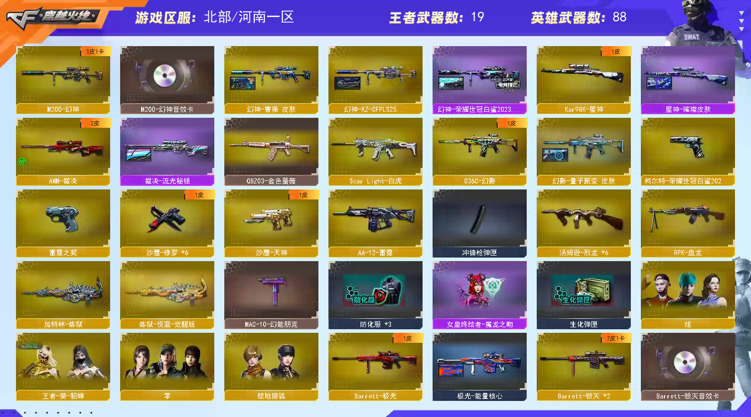 幻神音效卡/kz皮/白鲨皮 白鲨柯尔特/雷霆COP/六烈;柯尔特-荣耀世冠白鲨2023,RPK-盘龙,QBZ03-金色蔷薇,G36C-幻影,M200-幻神,Scar Light-白虎,Kar98K-星神,