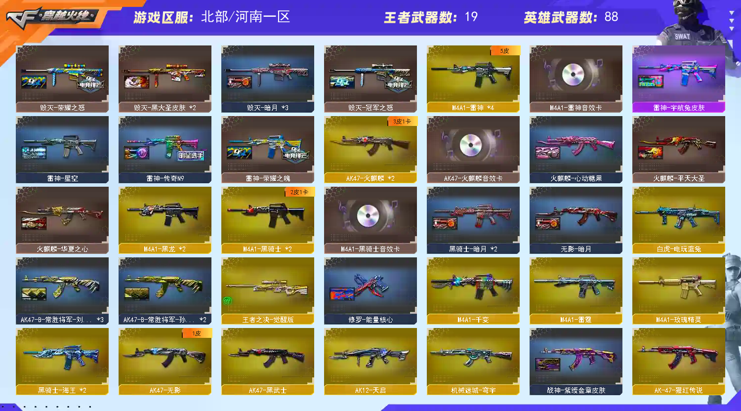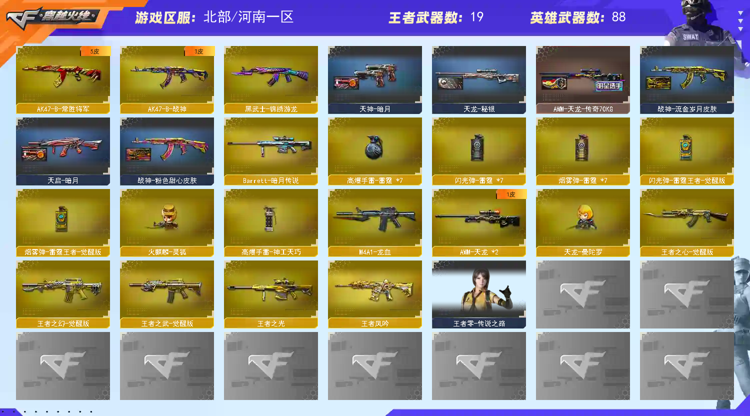 首页 > 租号大厅 > 穿越火线 > 网通区/河南一区 > 爆破全装/幻神三皮肤+音效卡/星神/G36/白虎/柯尔特白鲨/COP雷霆/六烈
