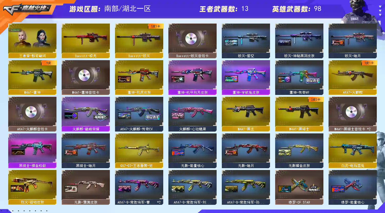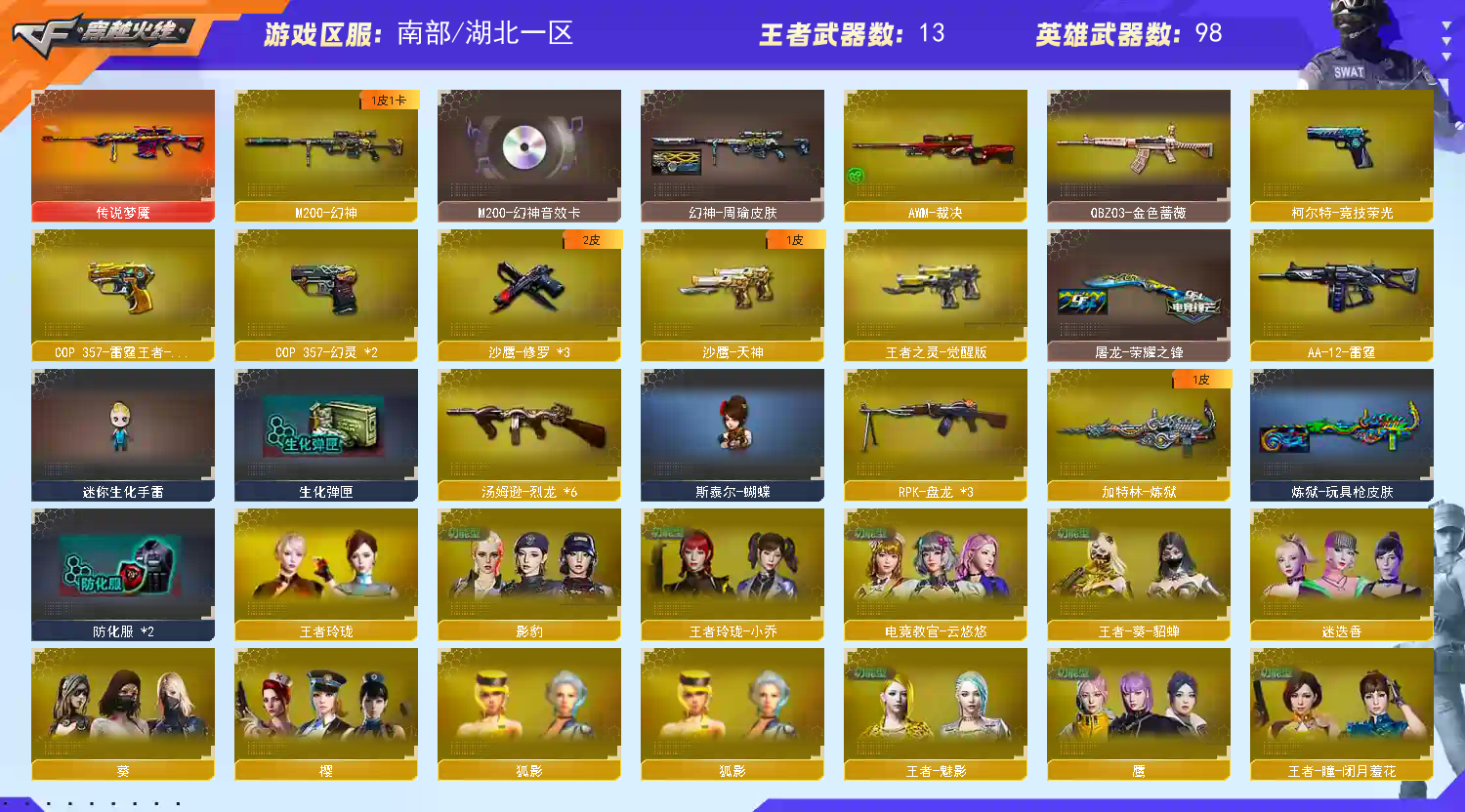 可排位|爆破号|传说|幻神+周瑜皮+音效卡|cop4 |n9雷神+音效卡 |六烈龙蝴蝶|烈狱盘龙|毁灭音效卡+皮肤|无影霓裳|幻灵套|全套道具|竞技荣光套|传说梦魇|王者之锋|玉锋|之击|火麒麟音效卡+巅峰荣耀+传奇EVEN|王者玲珑|影豹|王者玲珑小乔|云悠悠|王者貂蝉|迷迭香|王者魅影|鹰|王者瞳|王者葵翩若惊鸿;电竞教官-云悠悠,RPK-盘龙,QBZ03-金色蔷薇,M200-幻神,