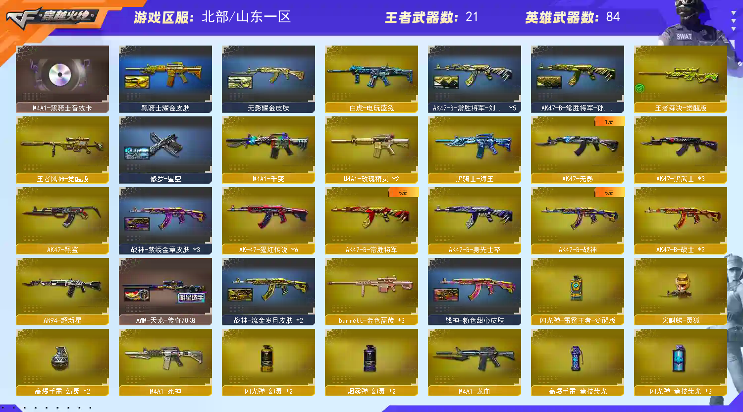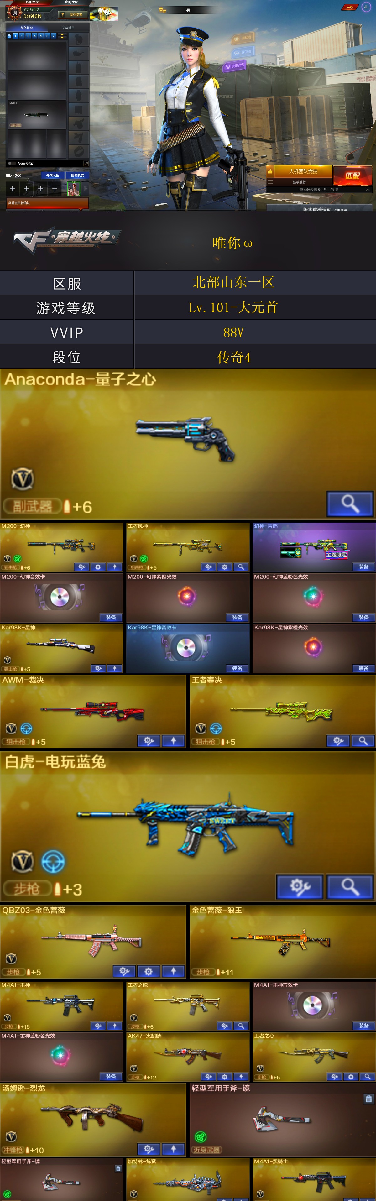 【商品标题】:北部山东一区-88V-可二次实名-【Lv.101-大元首】-【段位:传奇4】 【稀有武器】:M200-幻神/Kar98K-星神/QBZ03-金色蔷薇/AK47-火麒麟(3)/M4A1-黑龙(3)/M4A1-雷神(2)/M4A1-黑骑士/AK47-无影/AK47-黑武士(3)/白虎-电玩蓝兔/Barrett-毁灭(2)/Barrett-极光(2)/AWM-裁决/加特林-炼狱/汤姆逊-烈龙/AA-12-雷霆(2)/幻灵之锋 【王者武器】:王者之心-觉醒版/王者之魄-觉醒版/王者森决-觉醒版/王者风神-觉醒版/王者凰鸣-觉醒版/王者之光 【热门角色】:奇洋探员/乔伊教练/兔囡囡/潘多拉 【热门音效卡】:M200-幻神音效卡/Kar98K-星神音效卡/M4A1-雷神音效卡/Barrett-毁灭音效卡/M4A1-黑骑士音效卡/Barrett-极光音效卡 【热门皮肤】:幻神-青鹤 【其他亮点】:金刚伞-电玩红兔 (截图展示段位不代表实际段位,如赛季更新等不可抗拒因素发生变化,其余道具看;QBZ03-金色蔷薇,M200-幻神,Kar98K-星神,