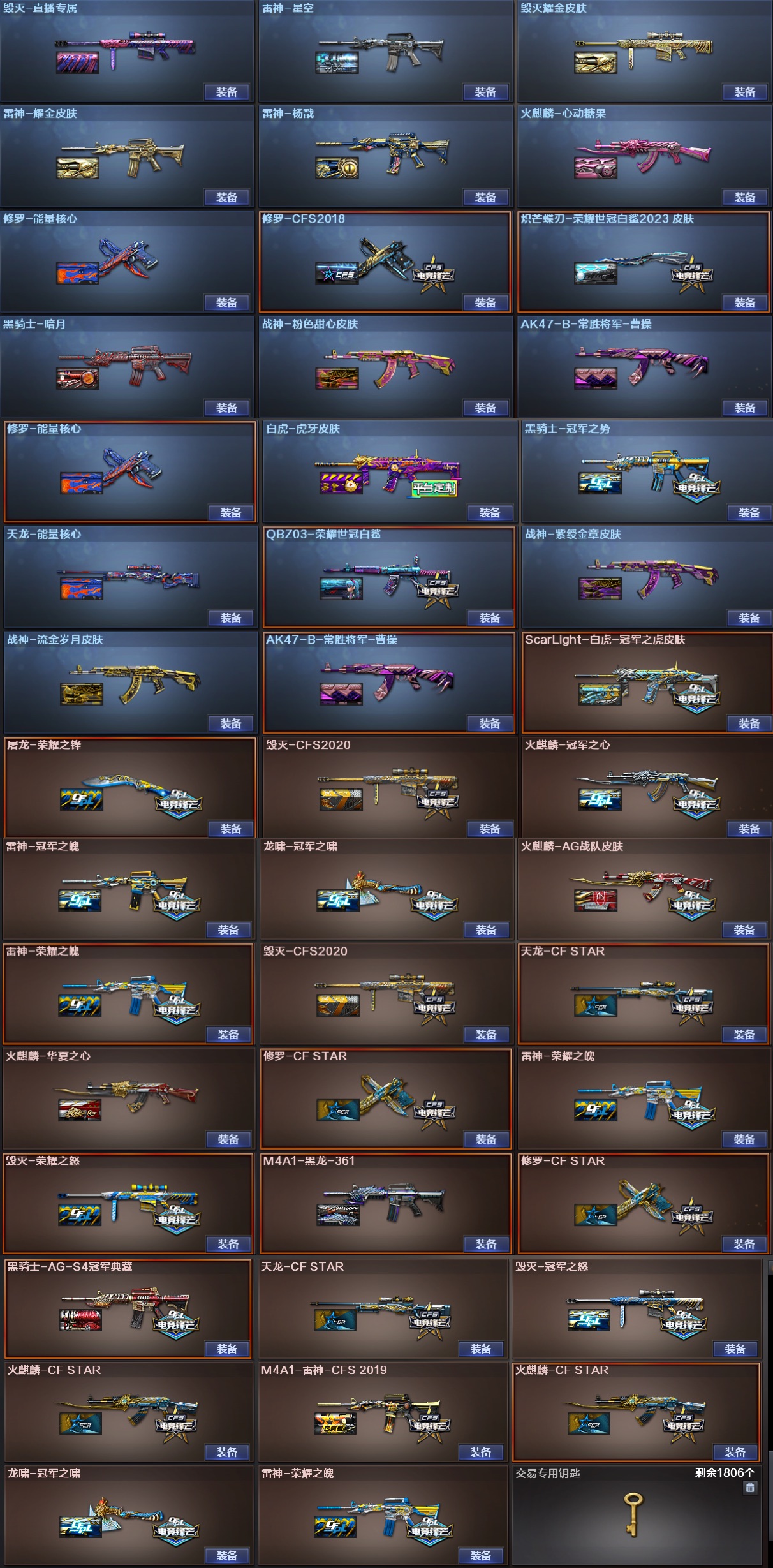 1;USP-雷暴,柯尔特-冠军之特,炽芒蝶刃,Knife-冠军之刃,传说女帝,隼,RPK-盘龙,