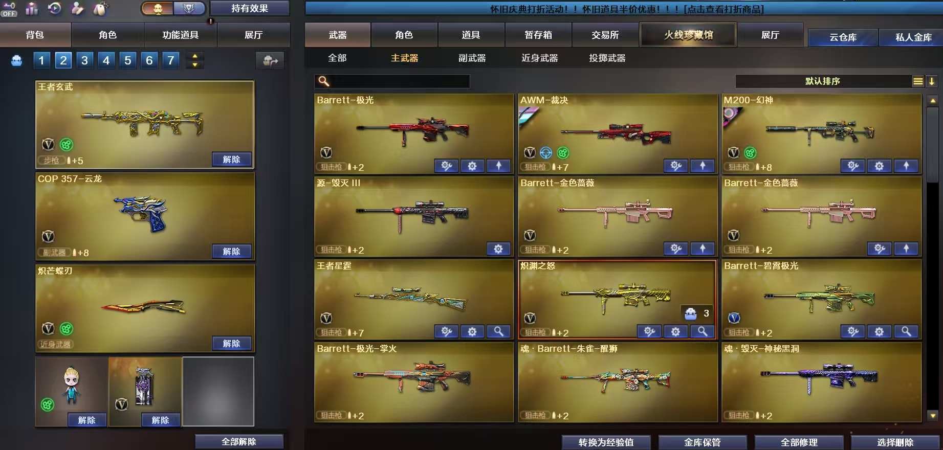 西部生化追击天花板,五把蝴蝶刀双玄武航空导狮,五烈龙斯太尔小人枪毒蜂;传说幽冥,炽芒蝶刃,传说影煞,隼,RPK-盘龙,QBZ03-金色蔷薇,传说幽瞳,