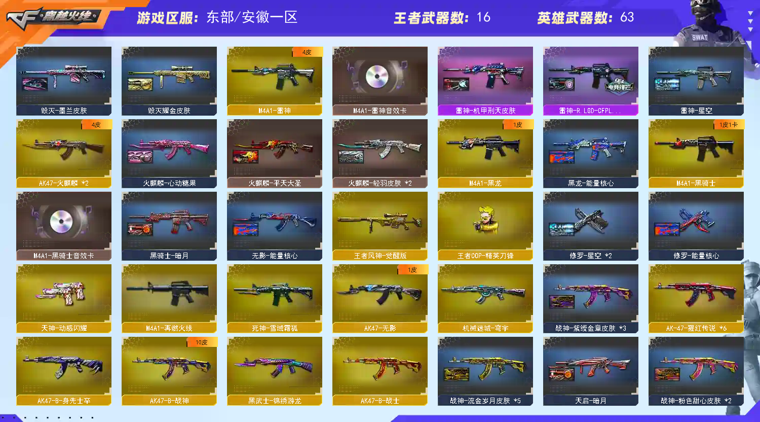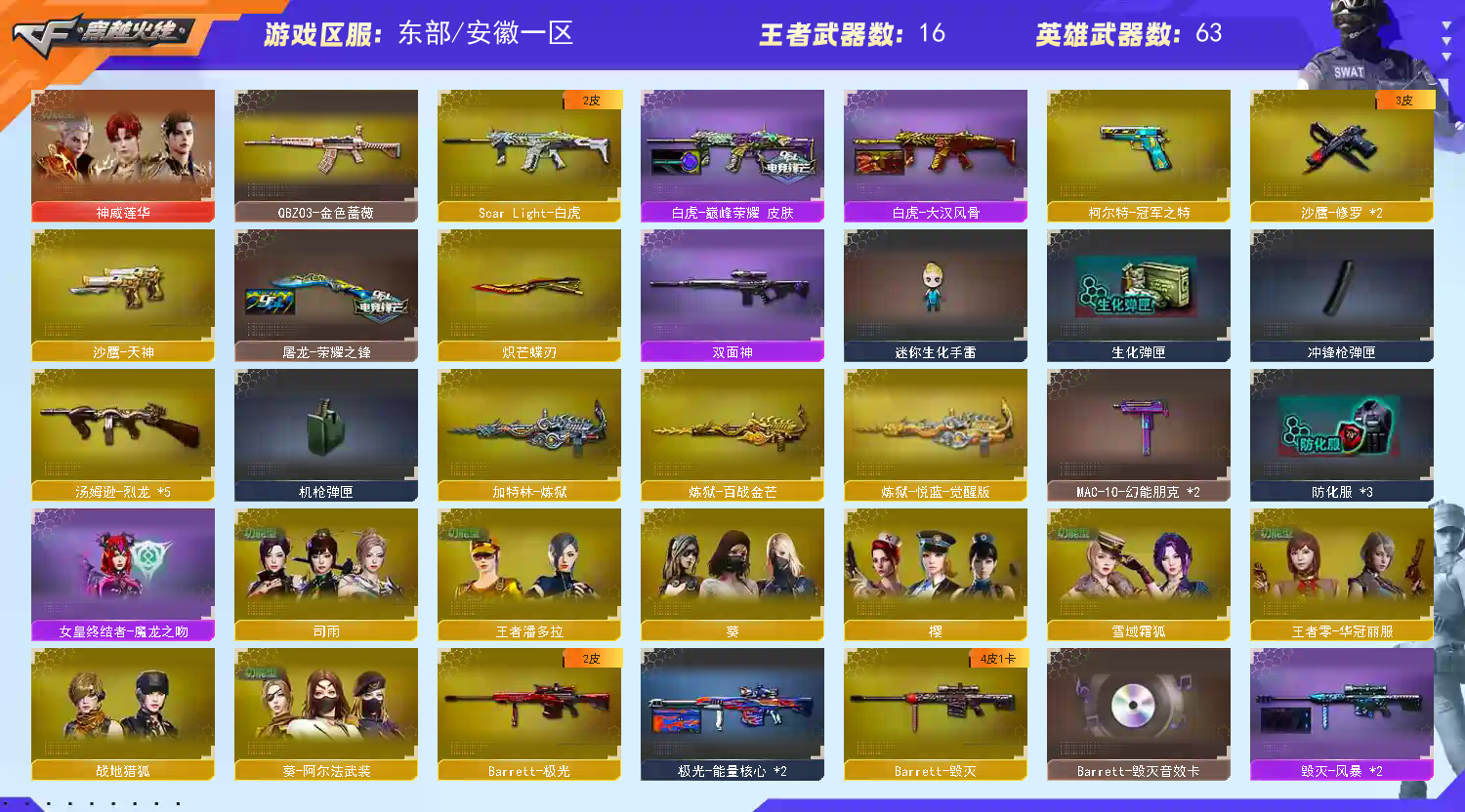 首页 > 租号大厅 > 穿越火线 > 电信区/安徽一区 > 东部78v 4防神威莲华 炽芒蝶刃 6烈龙 炼狱 王者风神 白虎双皮