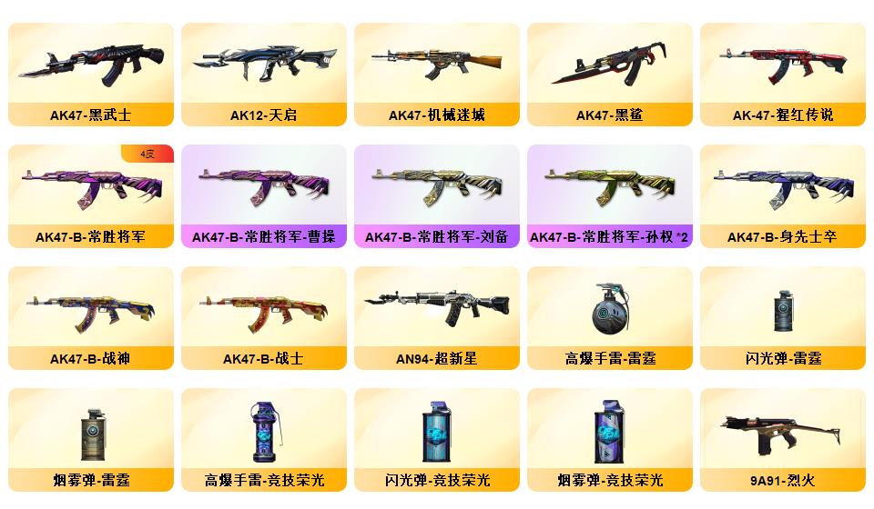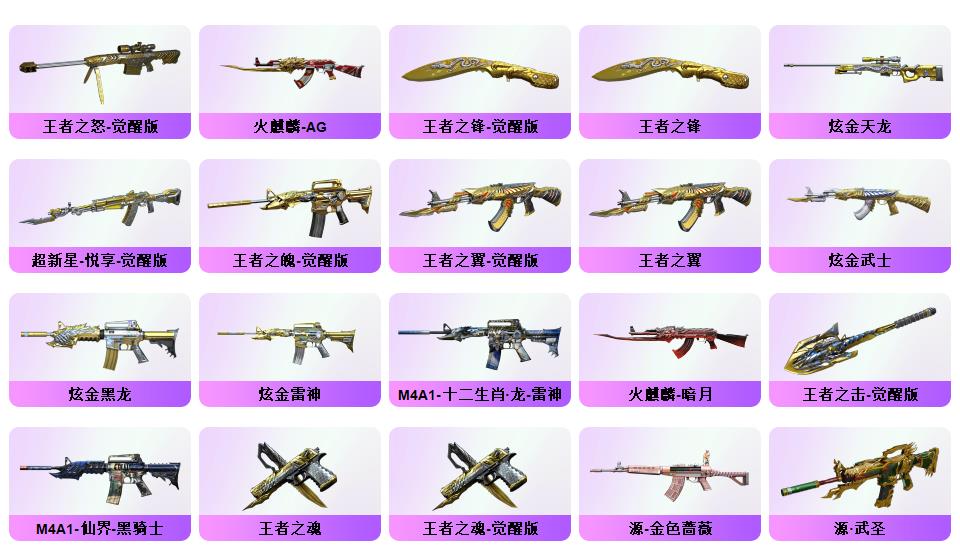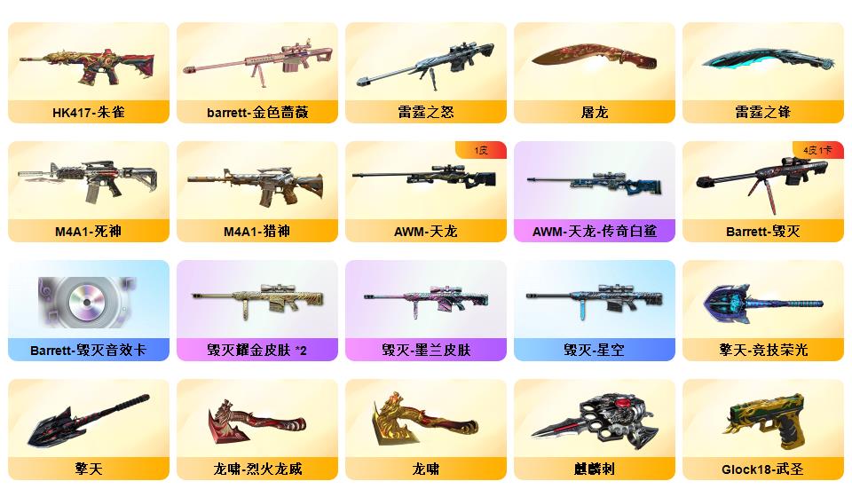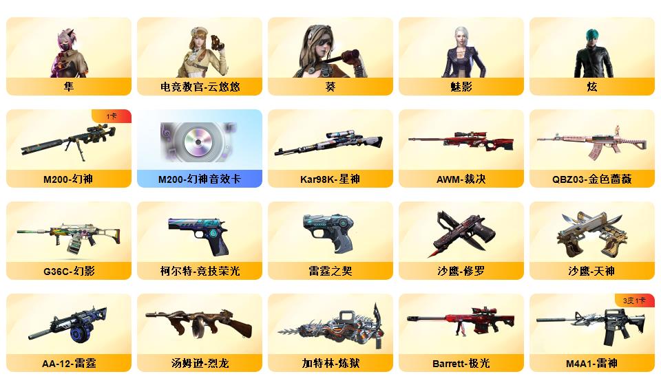 幻神*2(音效卡)+星神+竞技荣光+毁灭(音效卡)+雷神(音效卡)+青龙+朱雀+QBZ-03-金色蔷薇+沙鹰-修罗*7+COP-雷霆*2+柯尔特-竞技荣光*3+14套雷+10炼狱+8烈龙+死亡之眼+电竞教官-云悠悠+隼+套装(雷霆套+竞技荣光套)