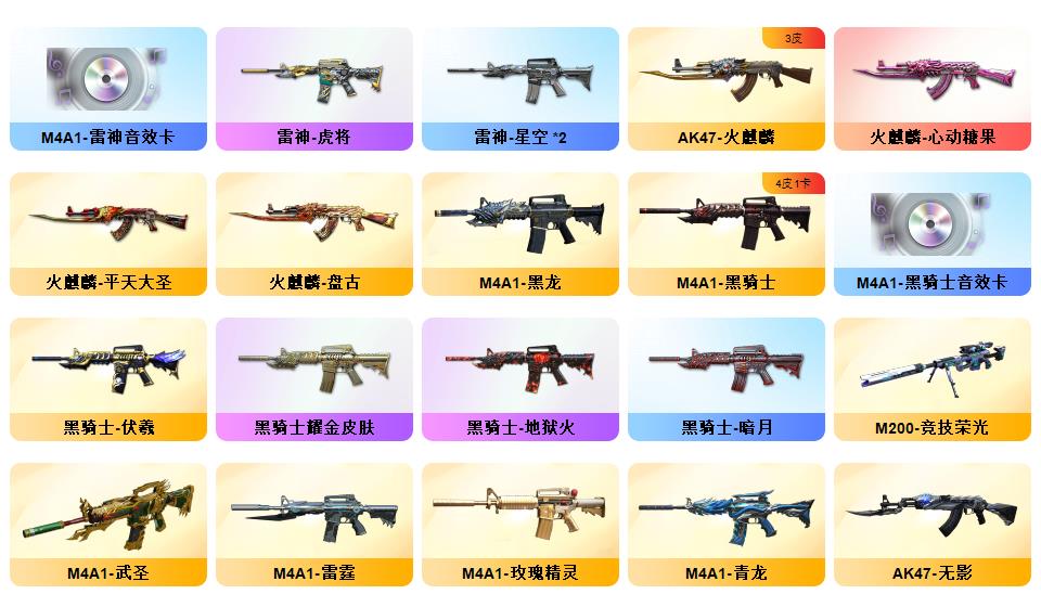 幻神*2(音效卡)+星神+竞技荣光+毁灭(音效卡)+雷神(音效卡)+青龙+朱雀+QBZ-03-金色蔷薇+沙鹰-修罗*7+COP-雷霆*2+柯尔特-竞技荣光*3+
