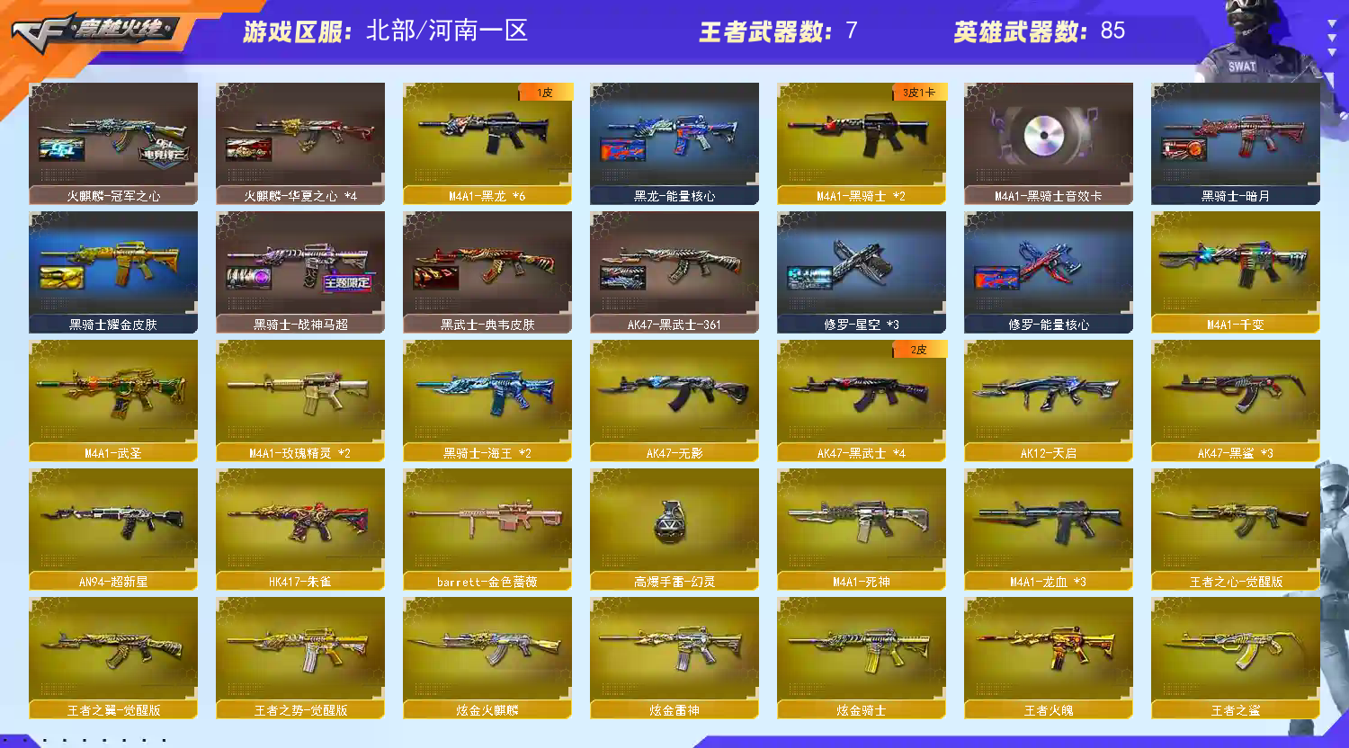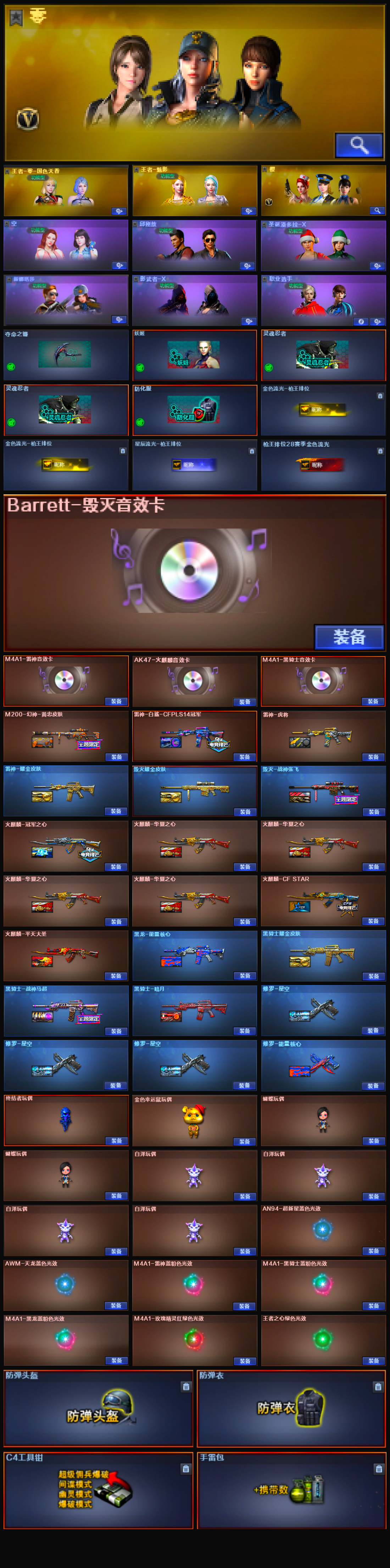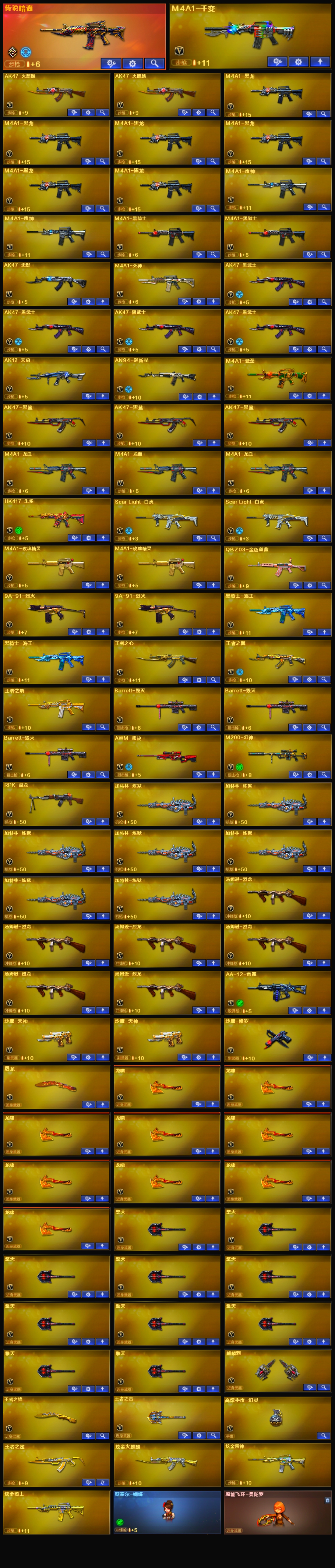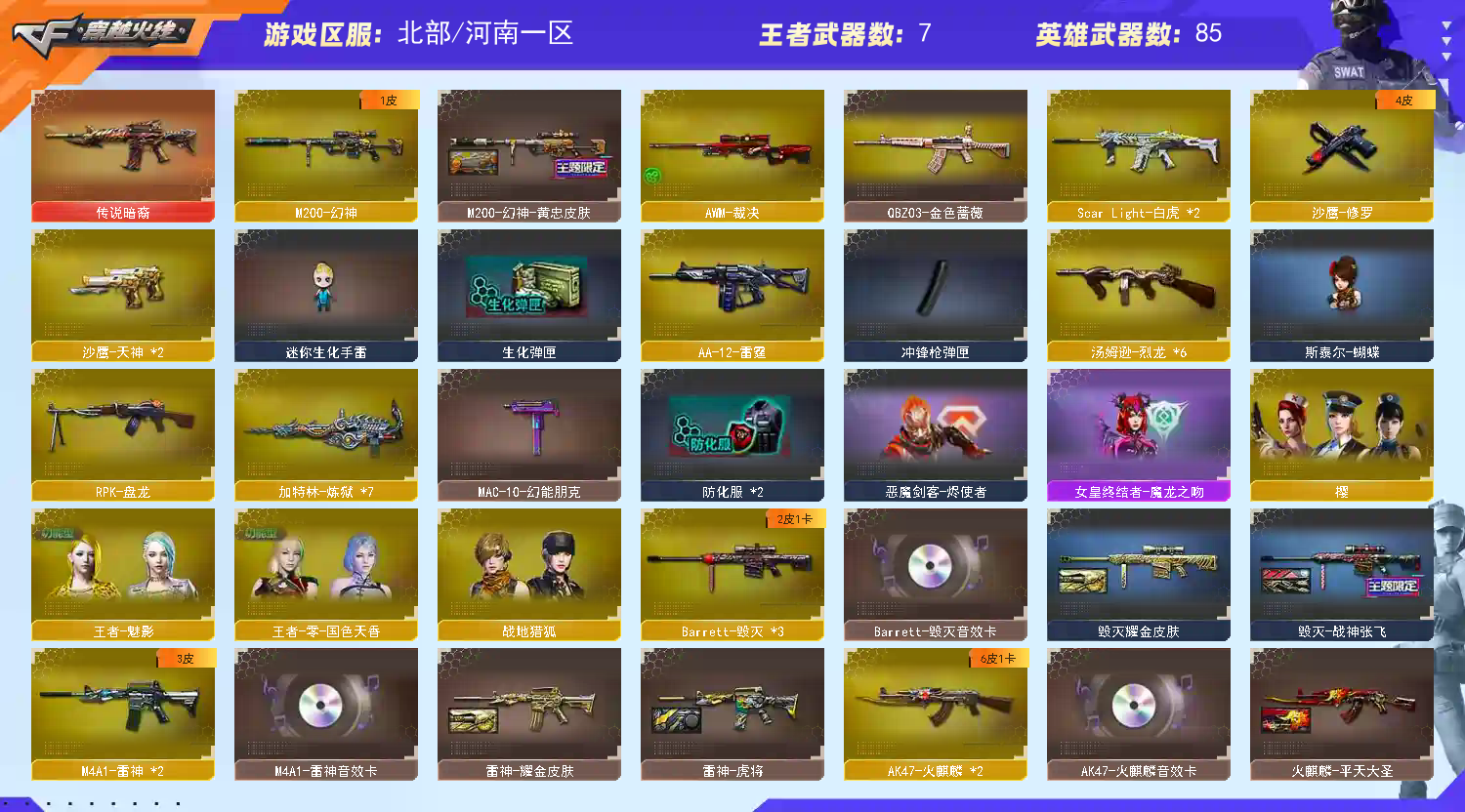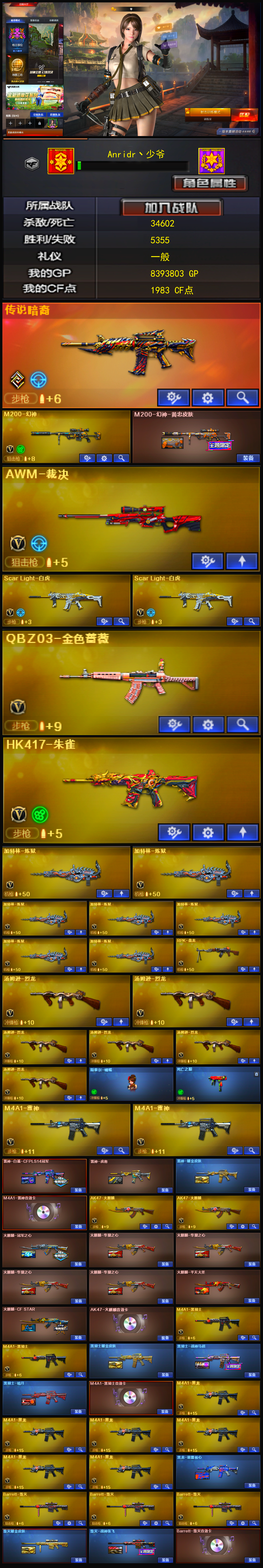 【传说暗裔】【m200幻神+黄忠皮肤】【qbz03金色蔷薇】【scar白虎*2】【hk417朱雀】【盘龙+炼狱*7+6烈龙+斯泰尔蝴蝶+死亡之眼】【雷神+音效卡+白鲨cfpls14冠军】【火麒麟+音效卡+冠军之心】【黑骑士+音效卡+战神马超】【毁灭+音效卡】【王者之心 王者之翼 王者之鲨 王者火魄 王者之势 王者之锋 王者之击】【炫金火麒麟 炫金雷神 炫金骑士】【火麒麟 千变 黑龙 雷神 黑骑士 无影 死神 黑武士 天启 超新星 武圣 黑鲨 龙血 玫瑰精灵 9a91烈火 黑骑士海王 毁灭 裁决 芭蕾特金色蔷薇 aa12雷霆】【修罗 天神】【屠龙 龙啸 擎天 麒麟刺】【四防 王者零国色天香 王者魅影】【角色 樱 职业选手 estar炫彩背包】;RPK-盘龙,QBZ03-金色蔷薇,M200-幻神,Scar Light-白虎,传说暗裔,