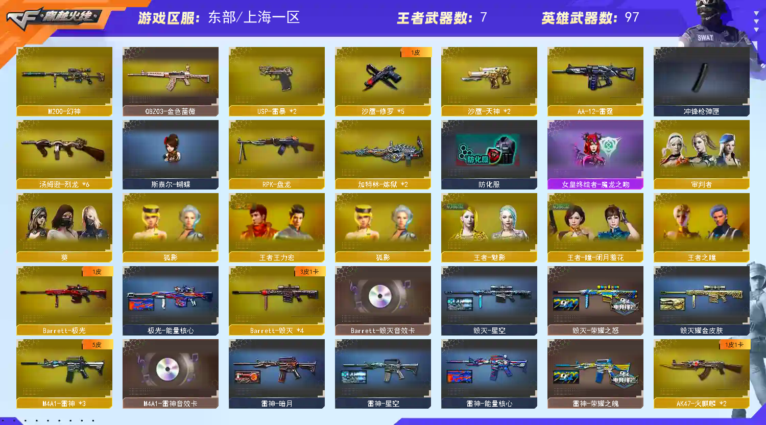 【m200幻神+usp雷暴*2 】【6烈龙 炼狱*2 盘龙 斯太尔蝴蝶】【qbz金色蔷薇】【火麒麟+卡】【黑龙】【雷神+卡+荣耀之魄】【黑骑士+卡】【毁灭+卡+荣耀之怒】【极光】【雷暴套】【武器:武圣 雷暴 王者之心 海王 】【9手枪:修罗*4 天神*2 雷暴*2 】【12刀具:屠龙*5 擎天 尼泊尔雷霆 斩神刀雷暴 堕天神*2 王者之锋】【8雷套:雷霆雷 雷暴雷*5 堕天神雷*2】【音效卡:雷神音效卡 火麒麟音效卡 黑骑士音效卡 毁灭音效卡】【四防角色:王者魅影 】;USP-雷暴,RPK-盘龙,QBZ03-金色蔷薇,M200-幻神,