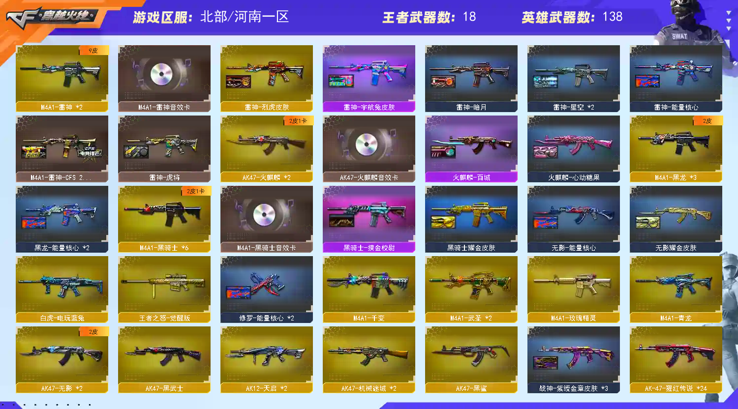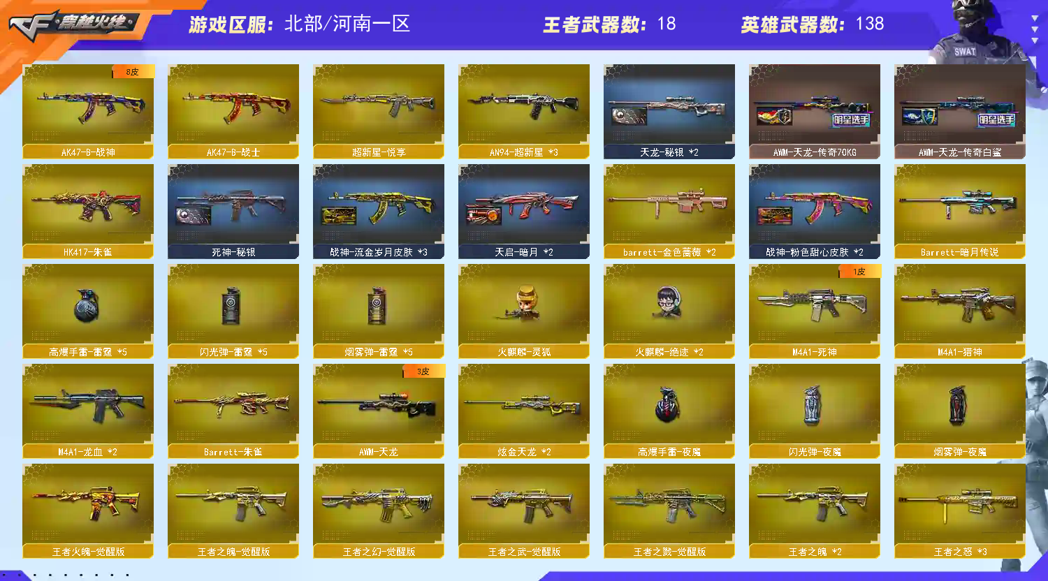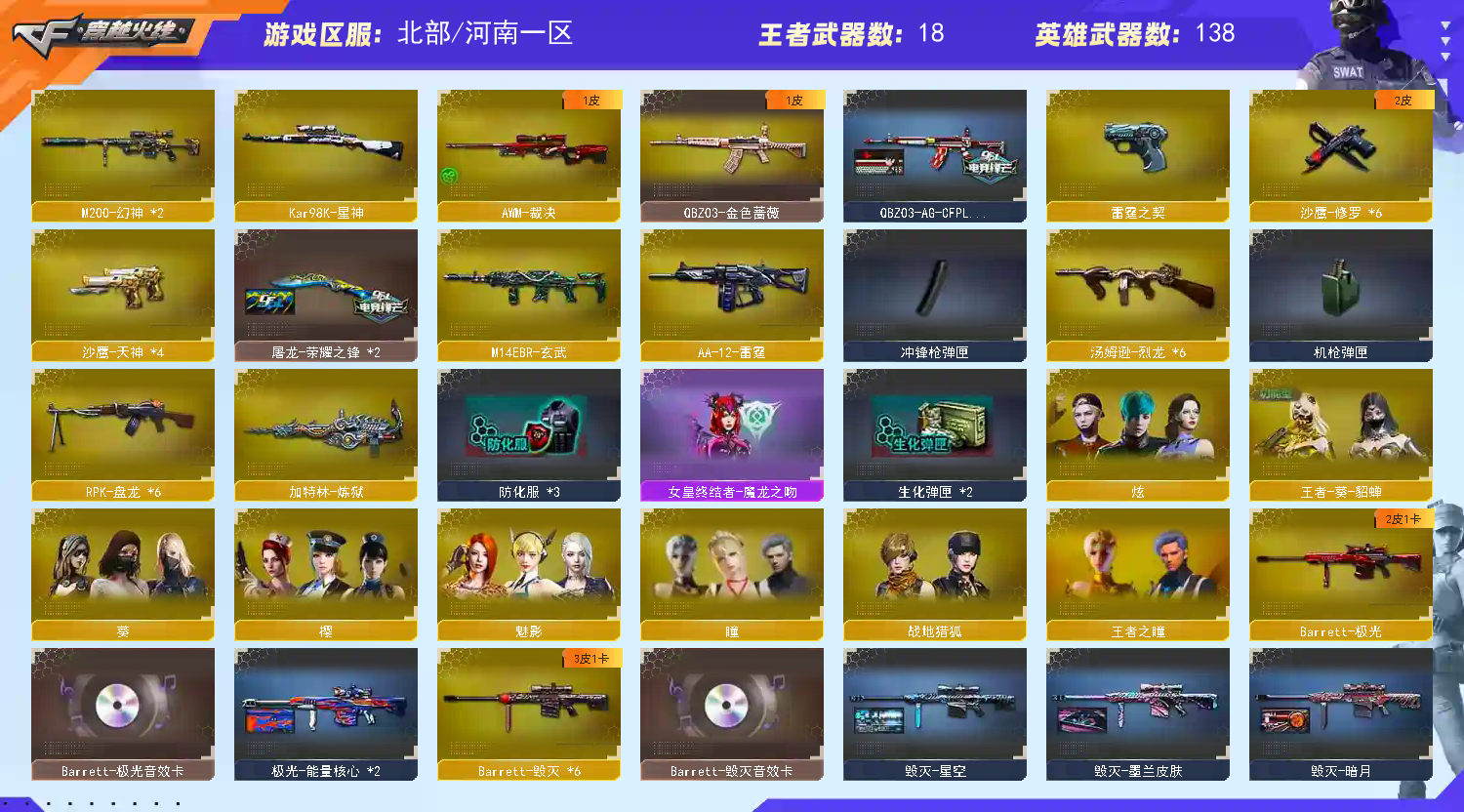 【m200幻神】【98k星神】【6黑骑士 6烈龙 6盘龙 炼狱 死亡之眼】【白虎电玩】【qbz金色蔷薇+ag19冠军】【朱雀】【玄武】【火麒麟+卡】【黑龙】【雷神+卡】【黑骑士+卡+白马银枪】【毁灭+卡+ag15冠军】【极光+卡】【裁决】【武器:武圣 青龙 王者之武 王者之魄 王者之戮 王者之幻 王者火魄 】【10手枪:修罗*6 天神*4 雷霆】【12刀具:屠龙*3 龙啸*3 擎天*3 麒麟刺*2 尼泊尔雷霆*2 夜魔 王者之击】【6雷套:雷霆雷*5 夜魔雷】【音效卡:毁灭音效卡 黑骑士音效卡 极光音效卡 雷神音效卡 火麒麟音效卡 】【四防角色:王者葵貂蝉 职业经理】;RPK-盘龙,QBZ03-金色蔷薇,M200-幻神,Kar98K-星神,