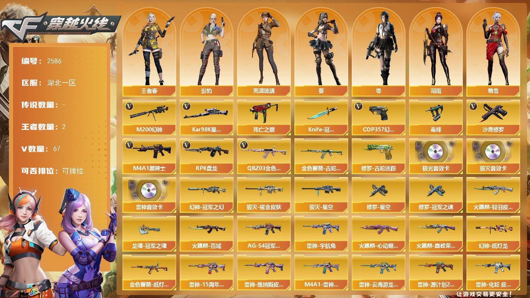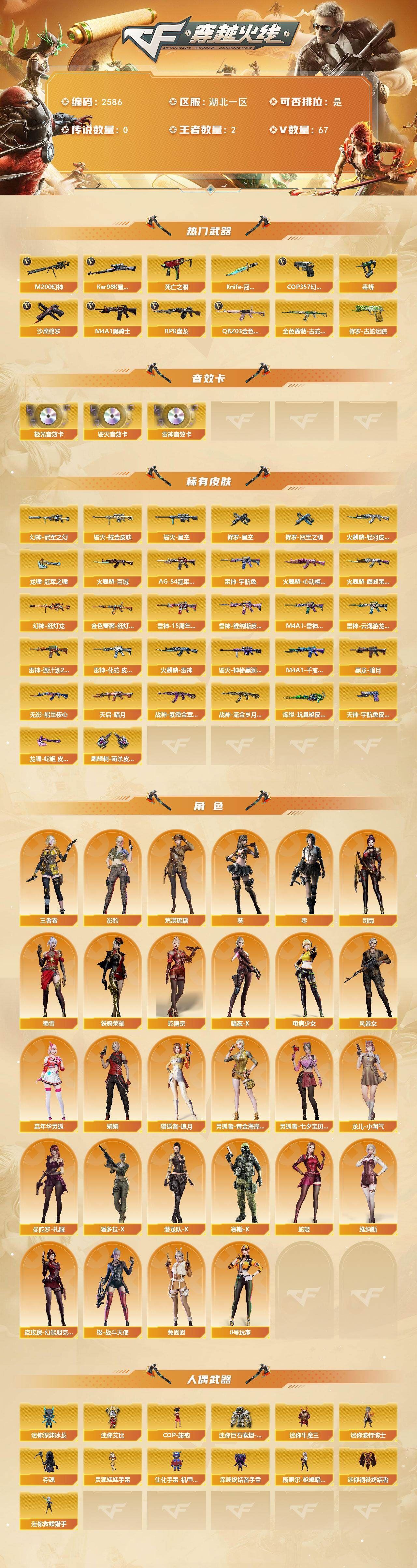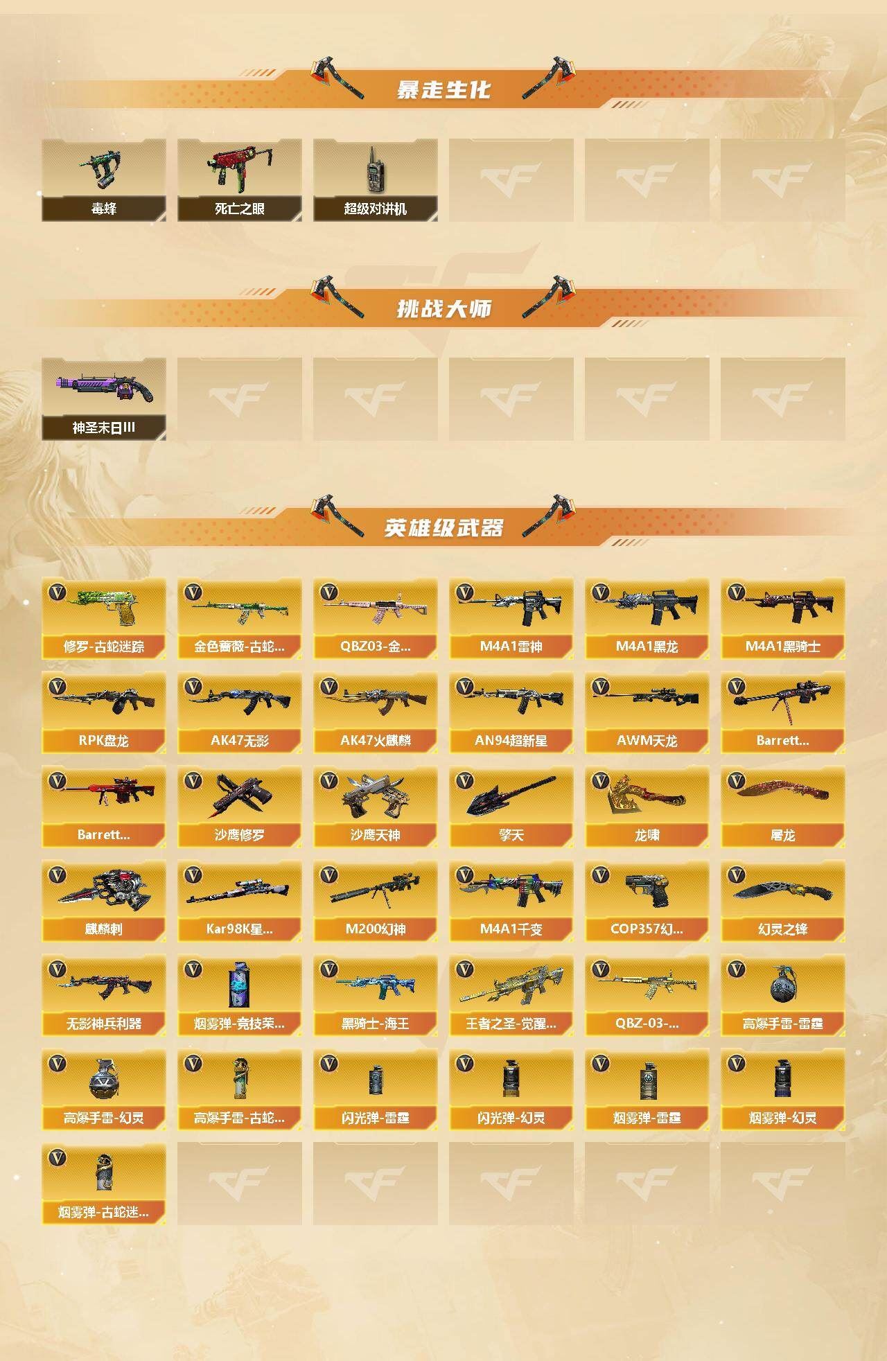 【热门武器】:QBZ03-金色蔷薇,M200-幻神,金色蔷薇-古蛇迷踪,修罗-古蛇迷踪,死亡之眼,Kar98K-星神,毒蜂,M4A1-黑骑士,RPK-盘龙,COP 357-幻灵,沙鹰-修罗*4,Knife-冠军之刃【音效卡】:M4A1-雷神音效卡,Barrett-毁灭音效卡,Barrett-极光音效卡【皮肤】:幻神-冠军之幻,幻神-纸灯龙皮肤,金色蔷薇-纸灯龙皮肤,雷神-宇航兔皮肤,雷神-15周年嘉年华 皮肤,雷神-维纳斯皮肤,M4A1-雷神-巅峰荣耀皮肤,雷神-云海游龙皮肤,雷神-源计划2.0专属 皮肤,雷神-化蛇 皮肤,火麒麟-雷神,火麒麟-轻羽皮肤,火麒麟-百城,火麒麟-巅峰荣耀,火麒麟-心动糖果,毁灭耀金皮肤,毁灭-星空,毁灭-神秘黑洞皮肤,M4A1-千变-孔明皮肤,黑龙-暗月,黑骑士-AG-S4冠军典藏,无影-能量核心,天启-暗月,战神-紫绶金章皮肤,战神-流金岁月皮肤,炼狱-玩具枪皮肤,修罗-星空,修罗-冠军之魂,天神-宇航兔皮肤,龙啸-冠军之啸,龙啸-蛇姬 皮肤,麒麟刺-萌杀皮肤【角色】:零,葵,影豹,荒漠琉璃,司雨,4防王者春,蛇隐宗,暗夜-X,电竞少女,风暴女,嘉年华灵狐,娟娟,猎狐者-追月,0号玩家,灵狐者-黄金海岸,灵狐者-七夕宝贝,龙儿-小淘气,曼陀罗-礼服,潘多拉-X,潜龙队-X,赛斯-X,蛇姬,蜀雪,铁骑荣耀,兔囡囡,维纳斯,夜玫瑰-幻能朋克,樱-战斗天使【人偶武器】:迷你钢铁终结者,迷你救赎猎手,斯泰尔-枪娘暗刃,COP-旗袍,迷你深渊冰龙,迷你牛魔王,迷你波特博士,夺魂,生化手雷-机甲核心,深渊终结者手雷,迷你艾比,迷你巨石泰坦-魔花研究所,灵狐娃娃手雷【暴走生化】:毒蜂,死亡之眼,超级对讲机【挑战大师】:神圣爆裂者-末日III【英雄级武器】:M4A1-千变,AK47-火麒麟,M4A1-黑龙,M4A1-雷神,M4A1-黑骑士,AK47-无影,AN94-超新星,无影-神兵利器,金色蔷薇-古蛇迷踪,QBZ03-金色蔷薇,王者之圣-觉醒版,黑骑士-海王,QBZ-03-王者蔷薇-觉醒版,AWM-天龙,Barrett-毁灭*2,Barrett-极光,M200-幻神,Kar98K-星神,RPK-盘龙,沙鹰-修罗*4,沙鹰-天神*3,COP 357-幻灵,修罗-古蛇迷踪,屠龙*2,龙啸*2,擎天*2,麒麟刺,幻灵之锋,高爆手雷-雷霆,高爆手雷-幻灵*5,高爆手雷-古蛇迷踪,闪光弹-雷霆,闪光弹-幻灵*5,烟雾弹-雷霆,烟雾弹-幻灵*6,烟雾弹-竞技荣光,烟雾弹-古蛇迷踪【道具】:CFS限定背包,冰冰背包-猛男专用,冰冰背包,古蛇迷踪炫彩背包,战舰背包,炫彩背包,超级背包,迷你冰龙背包,哔哩哔哩名片,黄金生化钩,绿色巨人,灵魂忍者*2,变异宝贝,迷雾幽灵,生化弹匣,夺命之镰,防化服*2,金色流光-枪王排位*2,枪王排位28赛季金色流光,枪王排位29赛季金色流光,语音特效-热带奇洋,语音特效-生化,古蛇迷踪特效,蛇隐宗表情,EP战队名片,EP战队喷图,防弹头盔,防弹衣,C4工具钳*4,手雷包*5【特殊枪械】:1黑骑士,1盘龙;Knife-冠军之刃,RPK-盘龙,QBZ03-金色蔷薇,M200-幻神,Kar98K-星神,