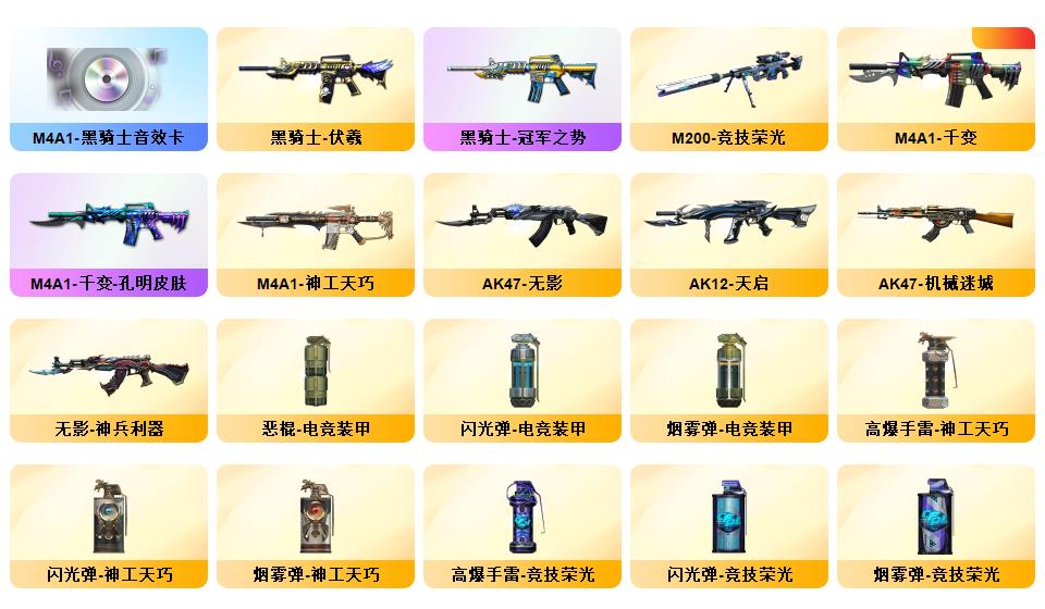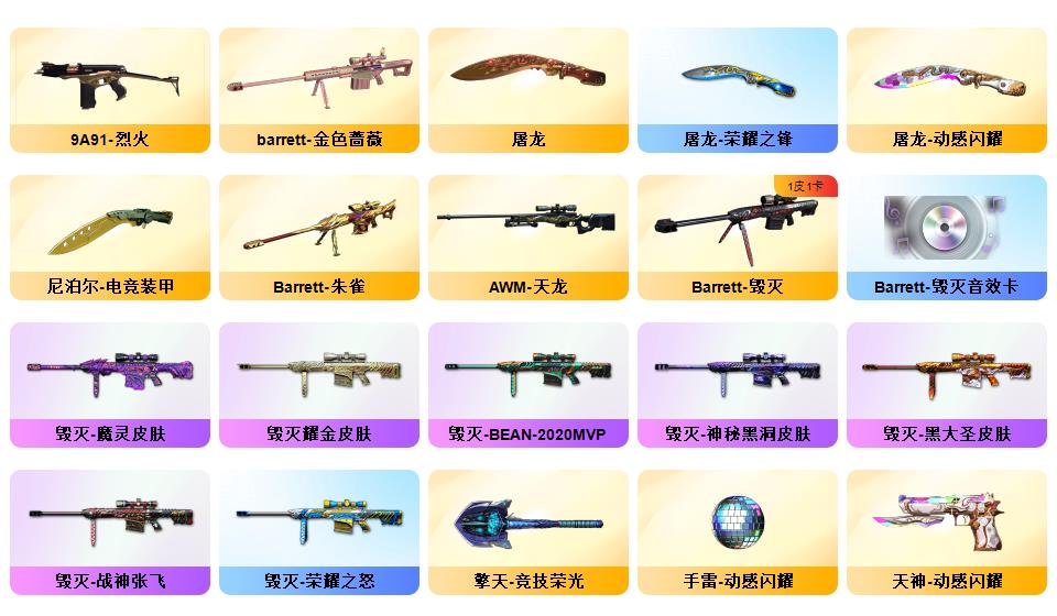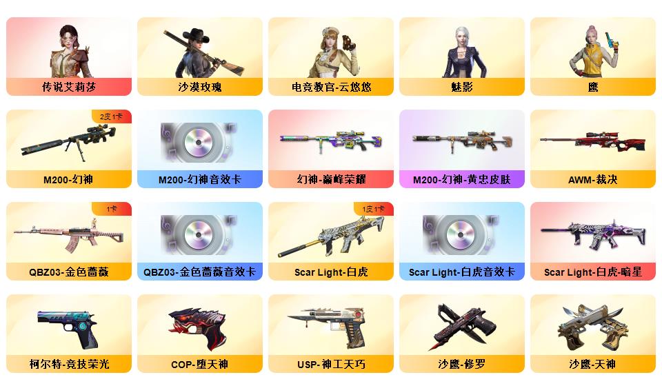 传说艾丽莎/传说暗裔/幻神+黄忠+巅峰荣耀+音效卡/白虎+ag+暗星+音效卡/qbz+枪娘阿敏+音效卡/王者星神/柯尔特经济荣光*6/usp神工天巧*2/cop