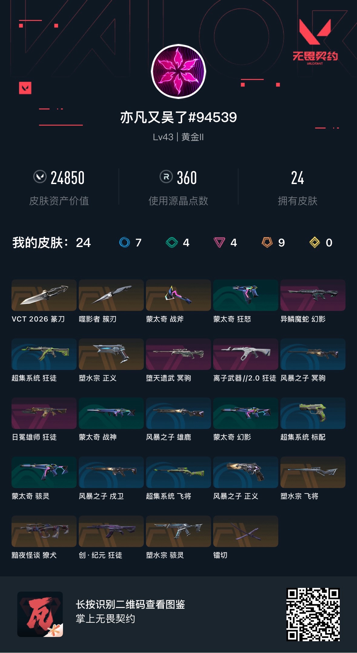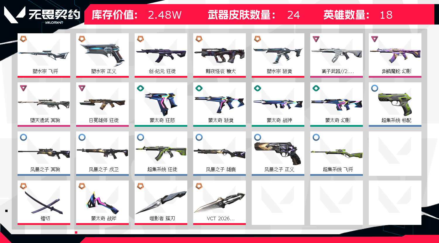 4刀皮,20枪皮(热门枪皮3狂徒1幻影1正义1冥驹1骇灵1獠犬1飞将);【刀皮】:近战武器-镭切,近战武器-噬影者簇刃,近战武器-VCT2026篆刀,近战武器-蒙太奇战斧;【枪皮】:正义-塑水宗,骇灵-塑水宗,狂徒-创纪元,獠犬-黯夜怪谈,飞将-塑水宗,狂徒-日冕雄师,狂徒-离子武器2.0,幻影-异鳞魔蛇,冥驹-堕天遗武,狂怒-蒙太奇,骇灵-蒙太奇,幻影-蒙太奇,战神-蒙太奇,标配-超集系统,正义-风暴之子,雄鹿-风暴之子,狂徒-超集系统,戍卫-风暴之子,冥驹-风暴之子,飞将-超集系统;【热门卡面】:看镜头卡面,热舞环节卡面,宁静海岸卡面,钢锁vs盖可卡面,5周年为何而战卡面,尽情舞动卡面,V25巴黎序曲卡面,禁灭工牌卡面,大军“鸭”境卡面,身陷蝰腹卡面,第四季破局时刻卡面,5周年消灭源能者卡面,5周年薪火初燃卡面,5周年卡面,新兵报到卡面,是不是哥们卡面,代号红色卡面,亲手缝制卡面,V契约卡面,狂欢就现在卡面,孤独派对卡面,双城之战金克丝卡面,无畏契约卡面;【热门喷漆】:蠢萌大眼喷漆,买装还是存钱喷漆,五周年快乐喷漆,风暴涌动喷漆,技能里面洗澡喷漆,身负重任喷漆,高歌一曲喷漆,碰个拳喷漆,酥脆一击喷漆,胜利属于无畏契约喷漆,GLHF喷漆,5周年喷漆,关门放狗喷漆,霓光四射喷漆,无畏契约喷漆;【热门挂饰】:激流挂饰,蓄势待滚挂饰,阳光微笑挂饰,天外飞客挂饰,V25第六幕纪念币挂饰,V25第五幕纪念币挂饰,盆栽挂饰,V25第四幕纪念币挂饰,无畏契约纪念币挂饰,V25第三幕纪念币挂饰,5周年挂饰;详情看图;镭切,异鳞魔蛇 幻影,离子武器//2.0 狂徒,塑水宗 飞将,堕天遗武 冥驹,塑水宗 正义,