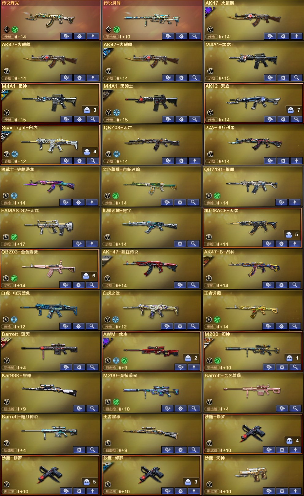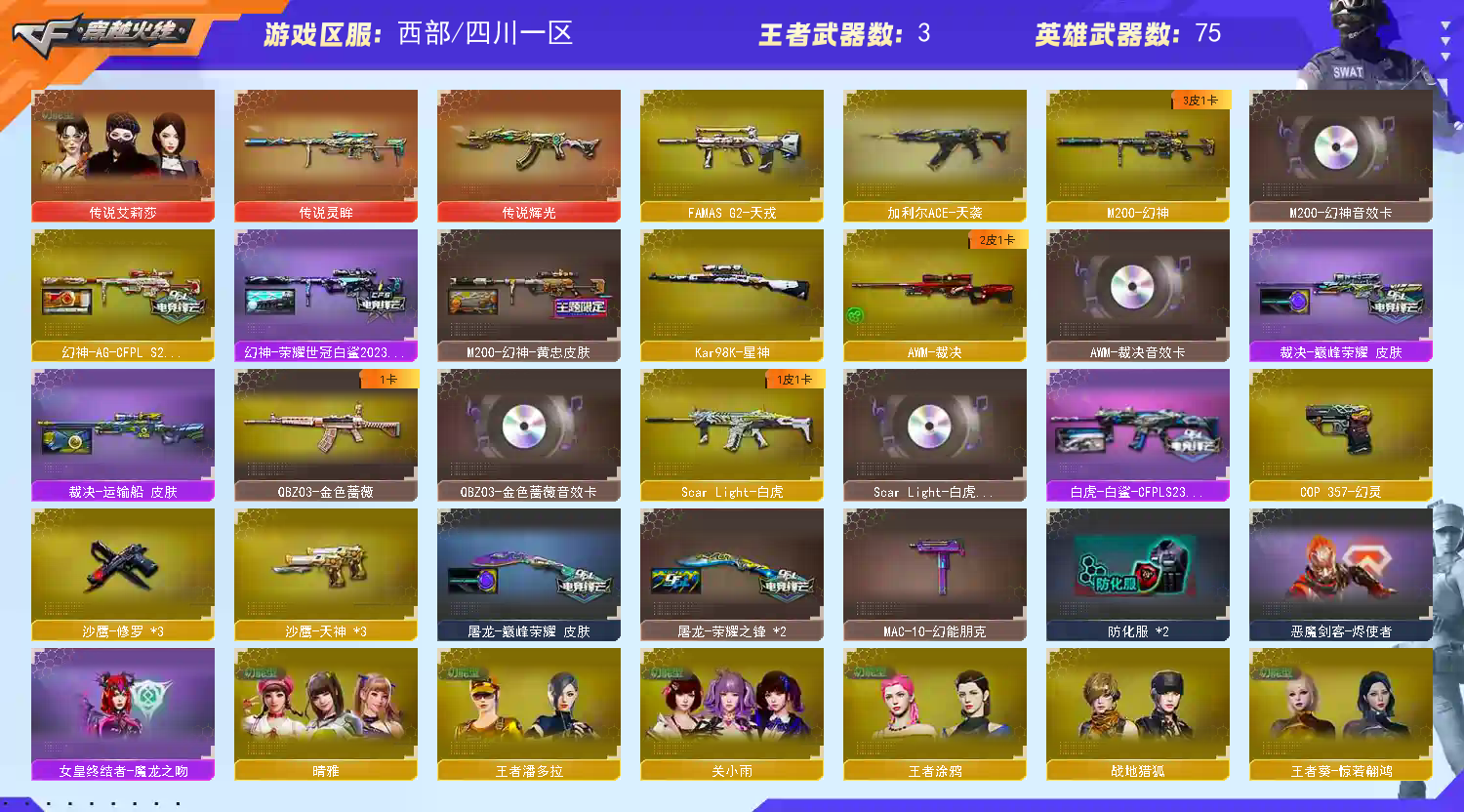 ★收藏好评! 由于异地登录保护机制,部分客户在使用客户端自动上号时会出现密码错误,注意本号密码不会错误,请多尝试5-6次!本账号已经过虚拟财产认顶,请各位科技大神高抬贵手。请素质租号,文明游戏,谢谢大家配合!!;晴雅,传说艾莉莎,QBZ03-金色蔷薇,M200-幻神,Scar Light-白虎,加利尔ACE-天袭,传说灵眸,