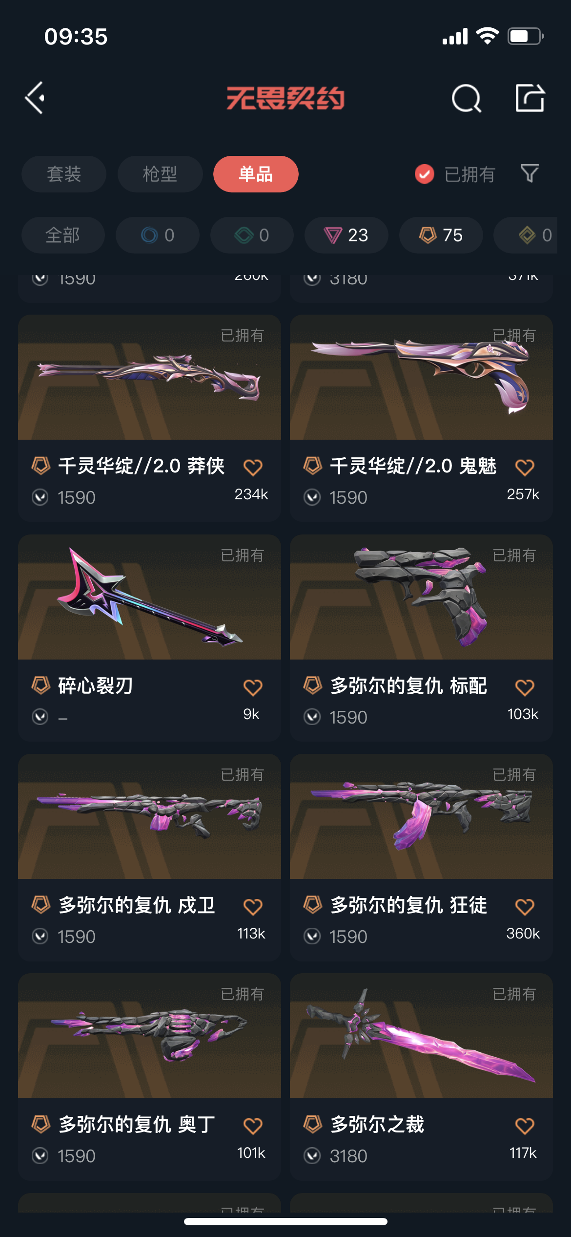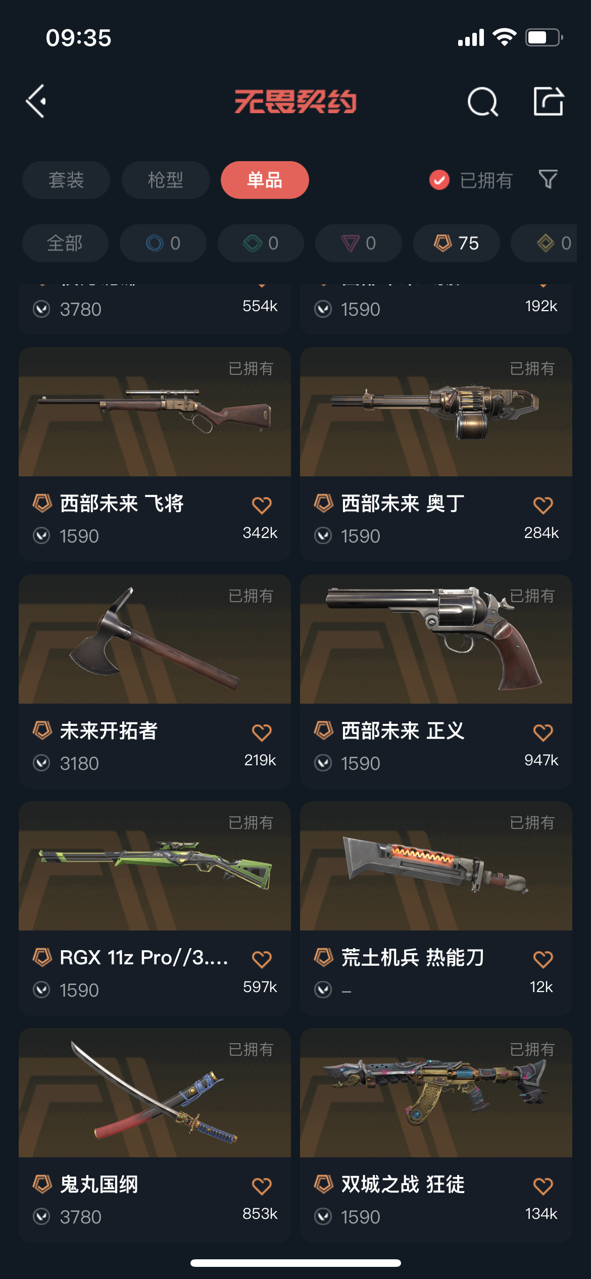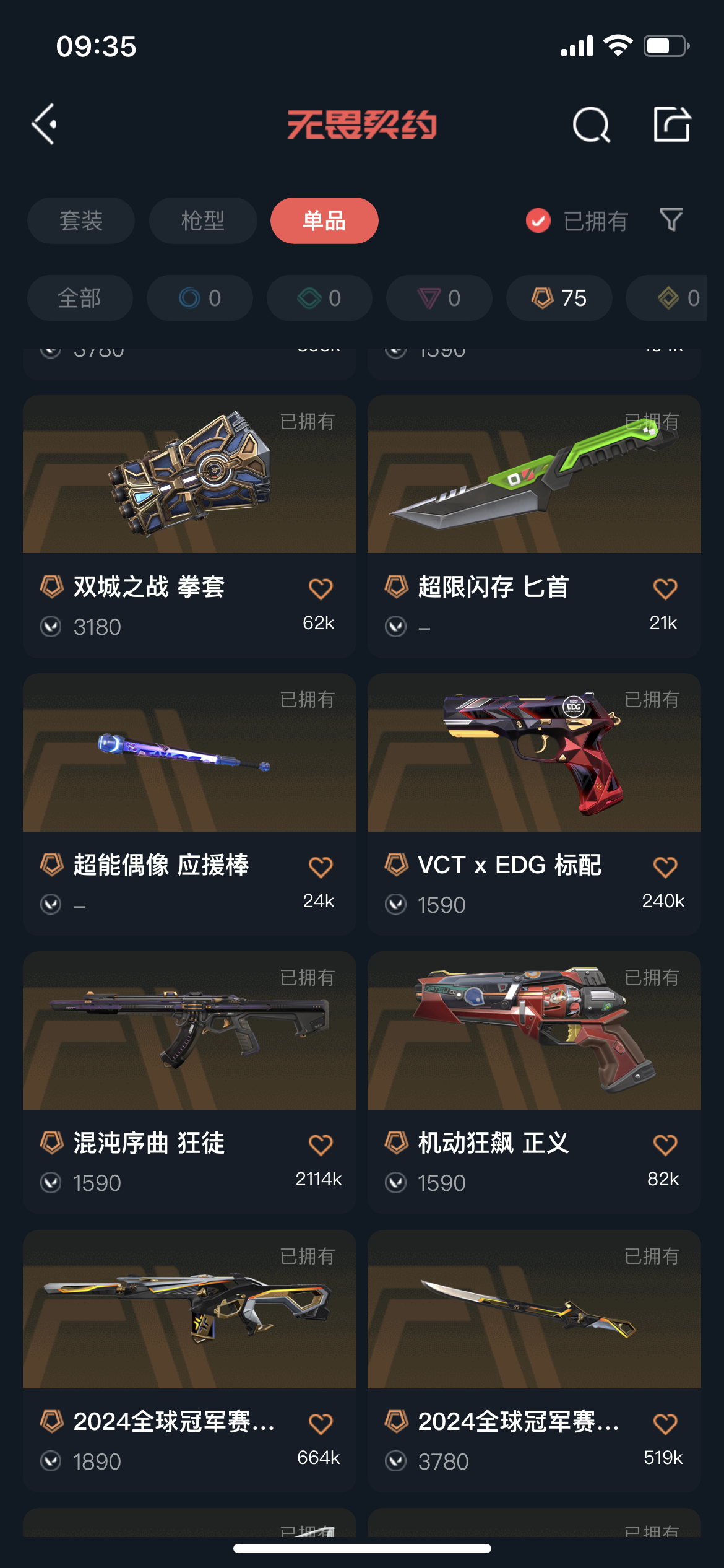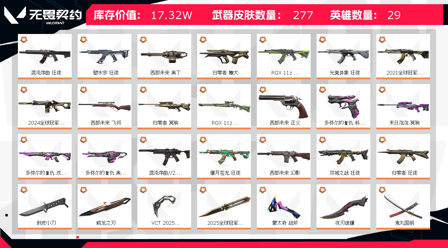 允许 英雄28 武器皮肤数量266;西部未来 奥丁,剥皮小刀,威龙之刃,VCT 2025 爪刀,归零者 獠犬,盖亚的复仇 狂徒,掠影 戍卫,
