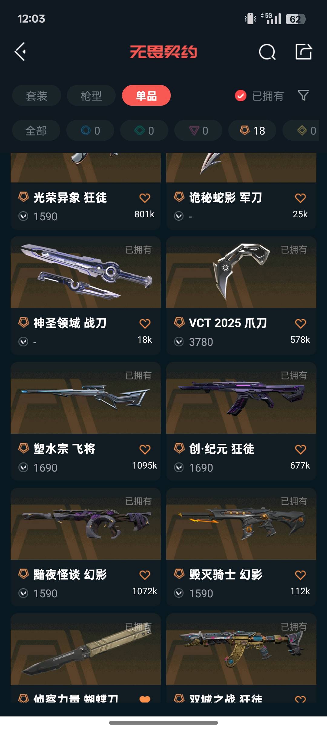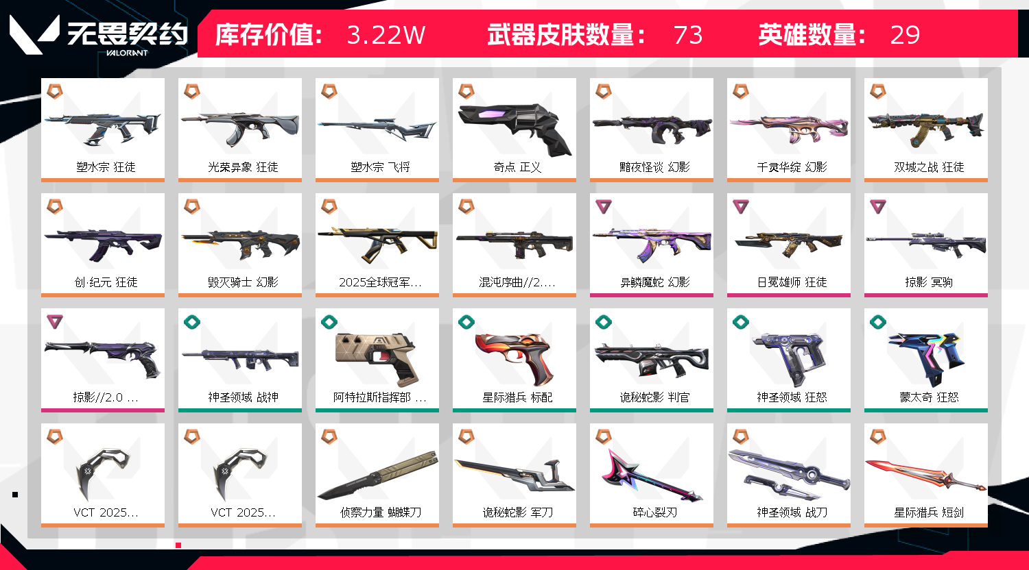 超多热门限定皮肤光荣异像狂徒/塑水宗狂徒,飞将/奇点正义/莲花幻影/双城之战狂徒/暗夜怪谈幻影;VCT 2025 爪刀,异鳞魔蛇 幻影,塑水宗 狂徒,光荣异象 狂徒,塑水宗 飞将,奇点 正义,