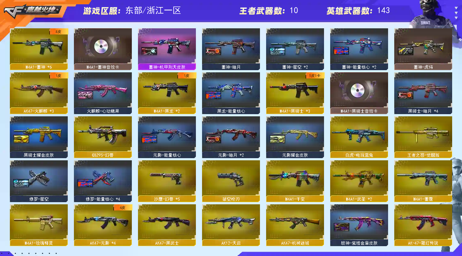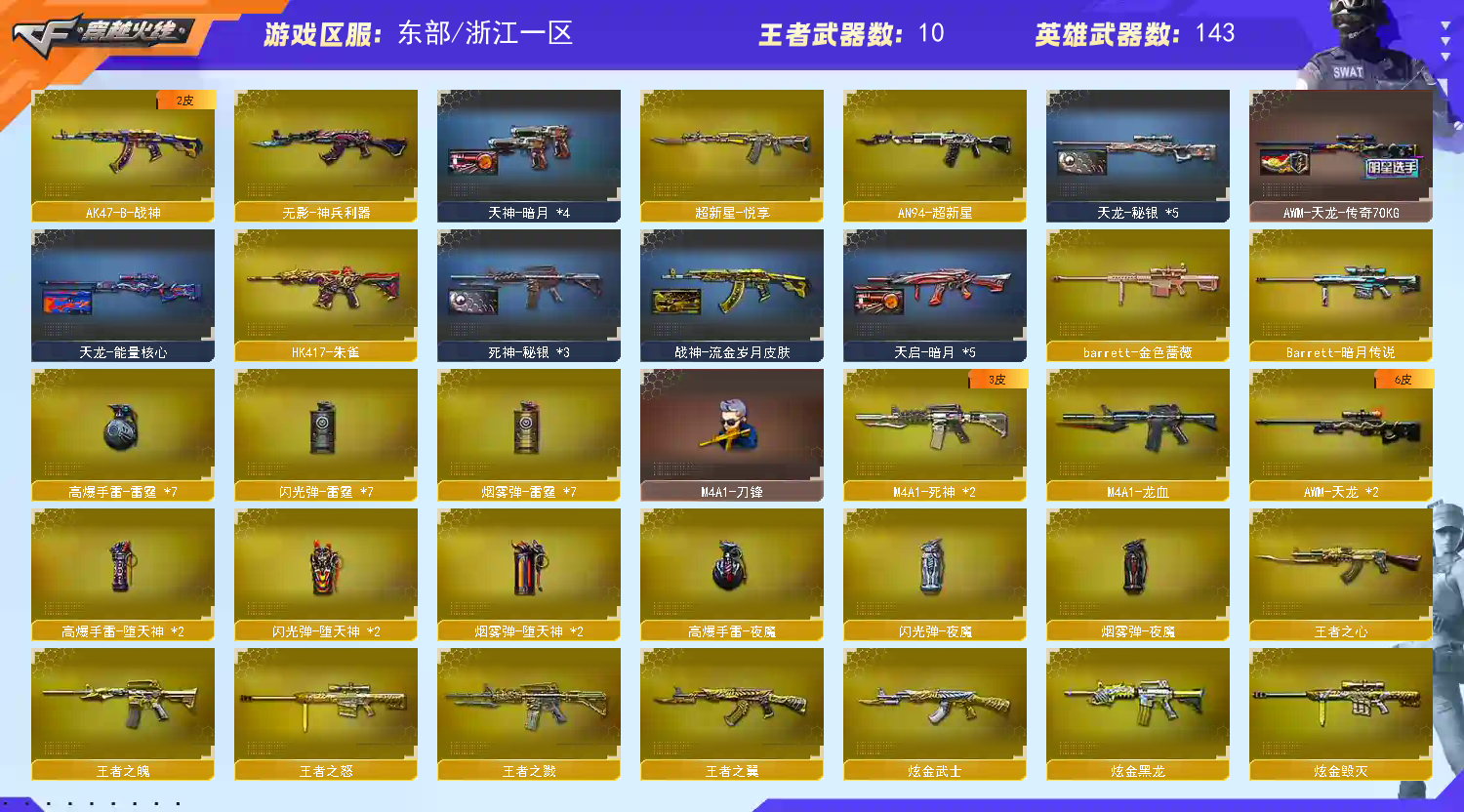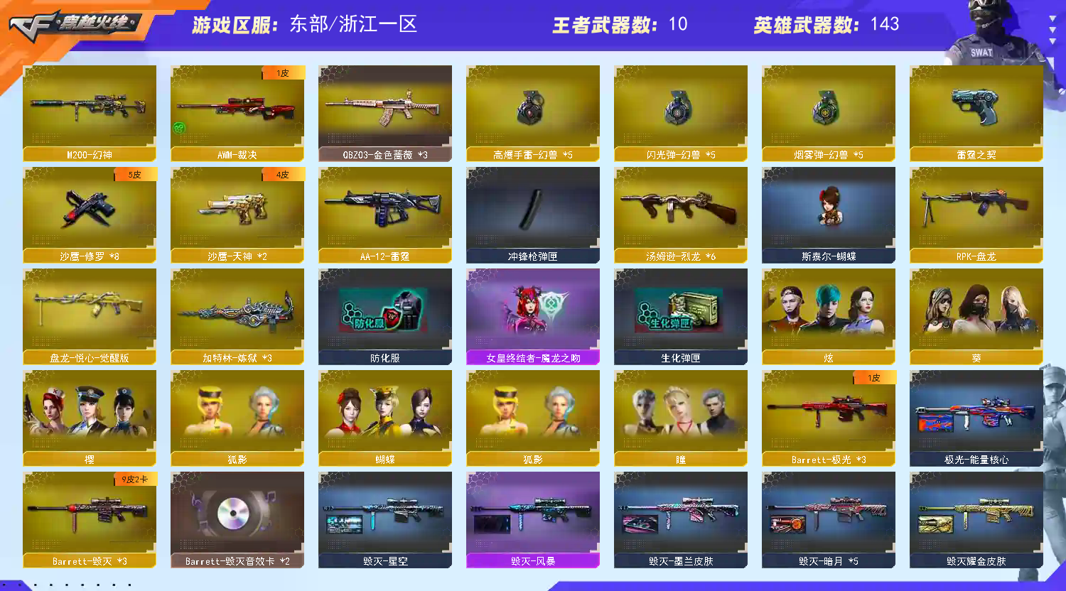 M200-幻神】【幻兽套+幻兽雷*5】【QBZ03-金色蔷薇】【生化 盘龙 3炼狱 6烈龙 蝴蝶 死亡之眼 】【裁决】【Barrett-毁灭+音效卡】【极光】【雷霆套】【AK47-火麒麟】【黑龙】【M4A1-雷神+音效卡】【黑骑士+音效卡】【王者之怒】【无影 死神 黑武士 天启 超新星 机械迷城 龙血 hk417-朱雀 烈火】【19手枪 修罗*8 天神*2 cop雷霆 】【16近战 屠龙*3 龙啸 擎天*4 麒麟刺*2 王者之锋 】【手雷 雷霆雷 堕天神 夜魔】【角色 蝴蝶 葵 炫 狐影】;RPK-盘龙,QBZ03-金色蔷薇,M200-幻神,