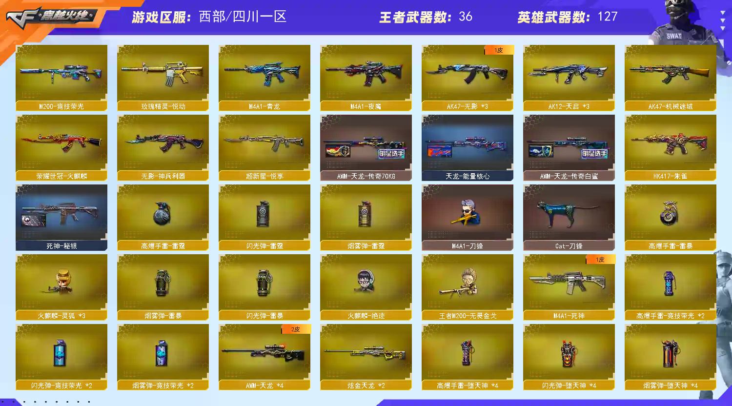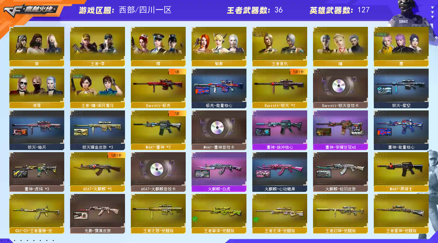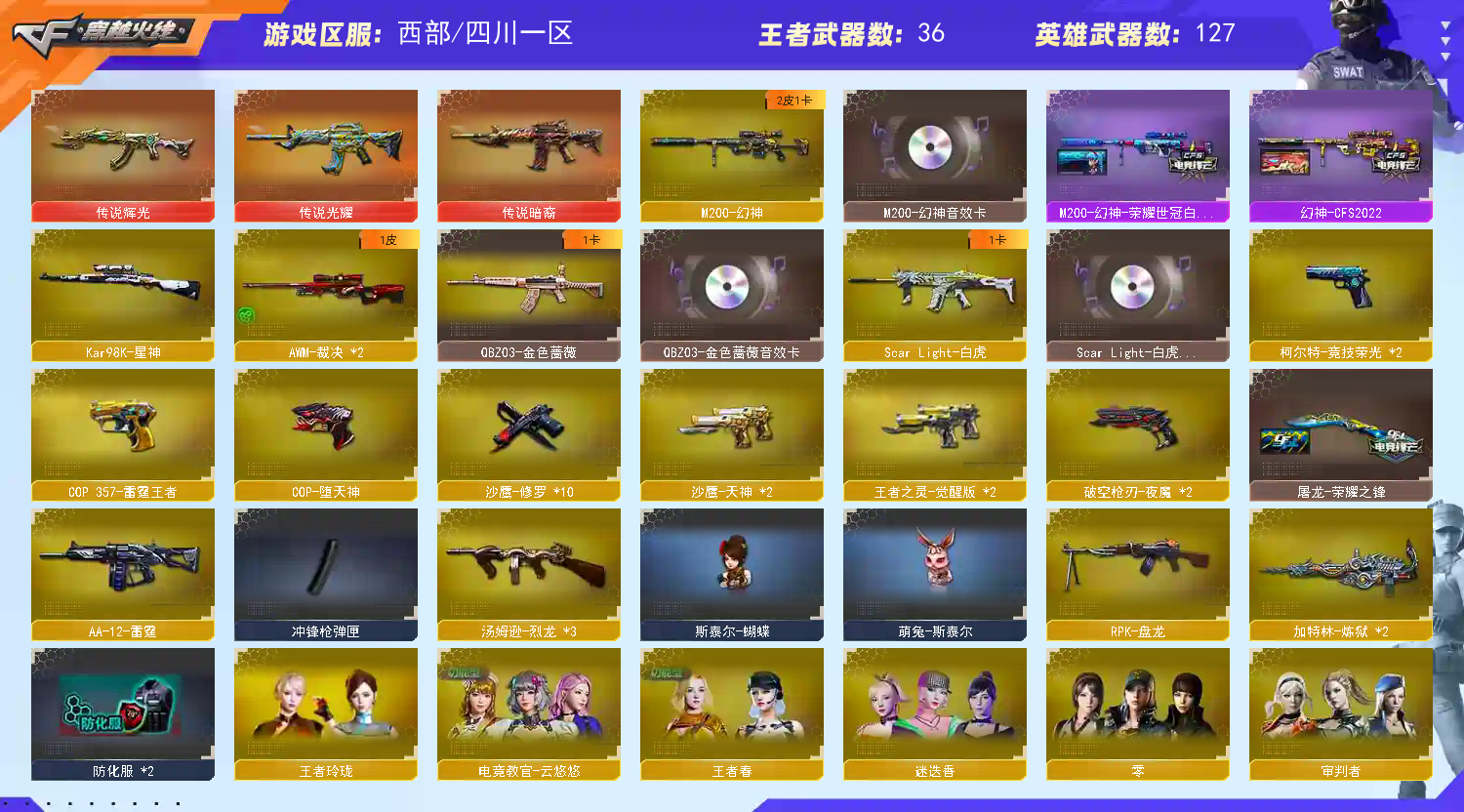 亮点解析 幻神三件套 3传说 白虎带卡】【m200幻神+幻神音效卡+荣耀世冠白鲨+cfs2022】【98k星神】【m200竞技荣光套+四防云悠悠】【王者幻神 王者星神】【传说光耀 传说暗裔 传说辉光】【scar白虎+白虎音效卡】【qbz金色蔷薇+卡】【朱雀】【火麒麟+卡】【雷神+卡+荣耀世冠】【黑骑士】【毁灭+卡】【极光】【裁决】【武器:青龙 王者之心 王者之翼 王者之武 王者之魄 王者之势 夜魔 荣耀世冠火麒麟 qbz王者蔷薇 王者炎心 王者之戮 王者龙血 盘龙 炼狱*2 烈龙*3】【18手枪:修罗*9 天神 武圣 堕天神 夜魔*2 竞技荣光*2 王者之灵】【18刀具:屠龙*2 龙啸 擎天 麒麟刺*2 尼泊尔雷霆 斩神刀雷暴 堕天神*3 夜魔 竞技荣光*4 王者之啸 】【13雷套:雷霆雷 雷暴雷 堕天神*4 夜魔雷*7】【小人枪:金色蔷薇空 cop白鲨 斯太尔蝴蝶 】【音效卡:雷神音效卡 火麒麟音效卡 幻神音效卡 金色蔷薇音效卡 白虎音效卡 毁灭音效卡 】【四防角色:云悠悠 王者春 王者瞳闭月羞花 女战神】;电竞教官-云悠悠,RPK-盘龙,QBZ03-金色蔷薇,M200-幻神,Scar Light-白虎,Kar98K-星神,传说暗裔,