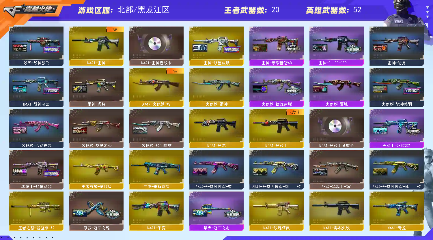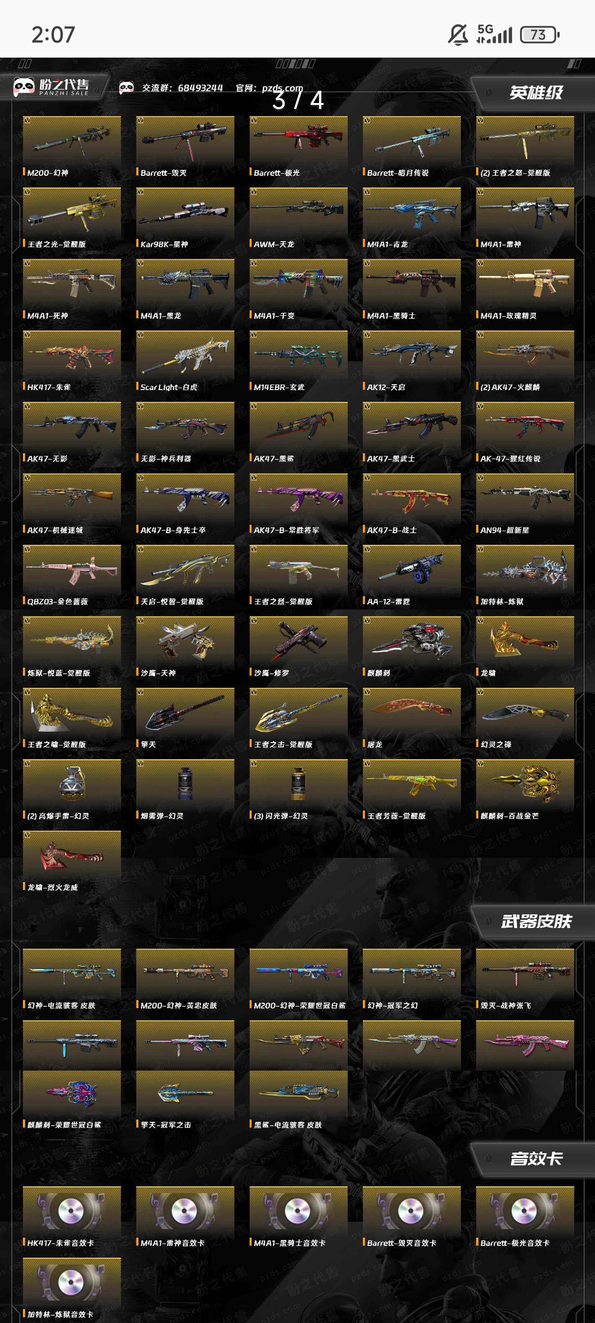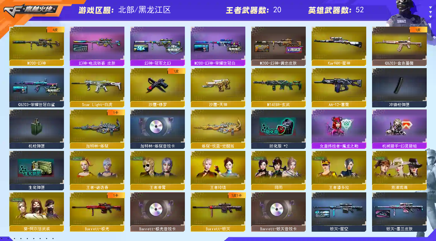 55V,11王者,2炫金,幻神电流骇客 /幻神黄忠/幻神世冠白鲨/幻神冠军之幻/毁灭战神张飞/毁灭星空/毁灭墨兰/火麒麟华夏之心/火麒麟巅峰荣耀/火麒麟心动糖果/荒漠琉璃/司雨/M200-幻神/Barrett-毁灭/Barrett-极光/Barrett-暗月传说/王者之怒-觉醒版(2)/HK417-朱雀音效卡/M4A1-雷神音效卡/M4A1-黑骑士音效卡/Barrett-毁灭音效卡/Barrett-极光音效卡/加特林-炼狱音效卡;
