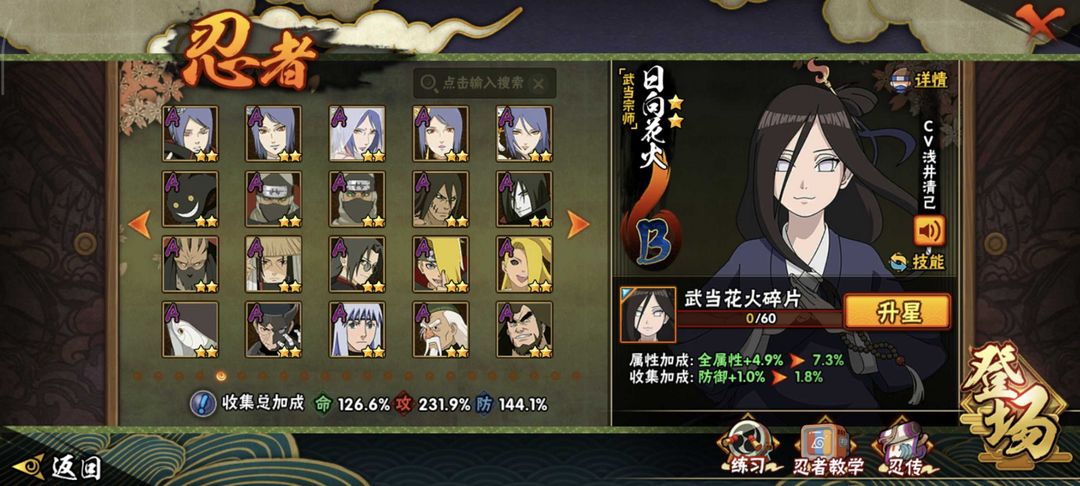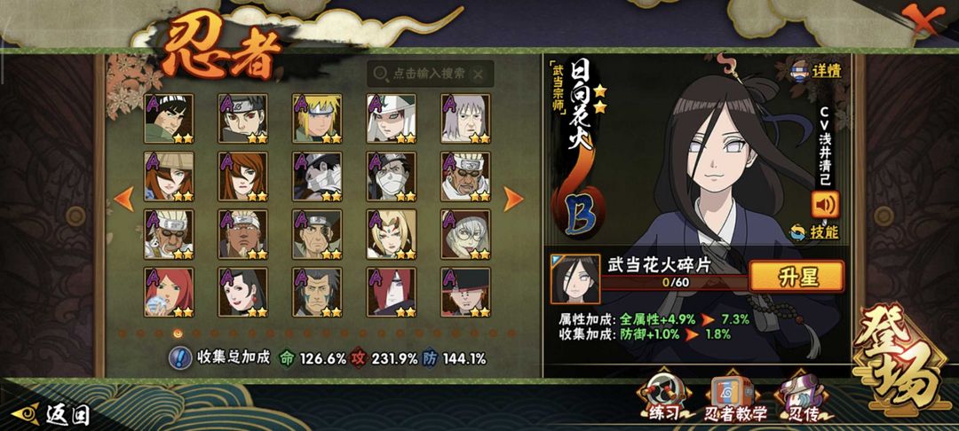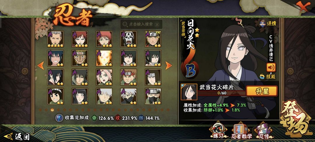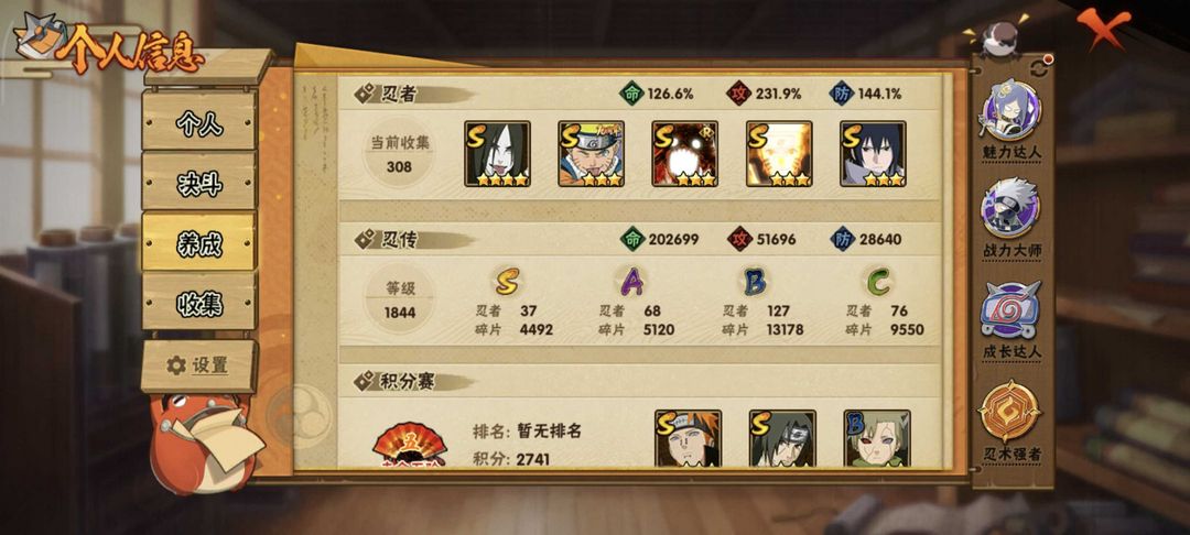 37S➕68A➕127B➕76C,皮肤多,热门忍者有很多,觉得体验不错可以收藏,魅力等级51